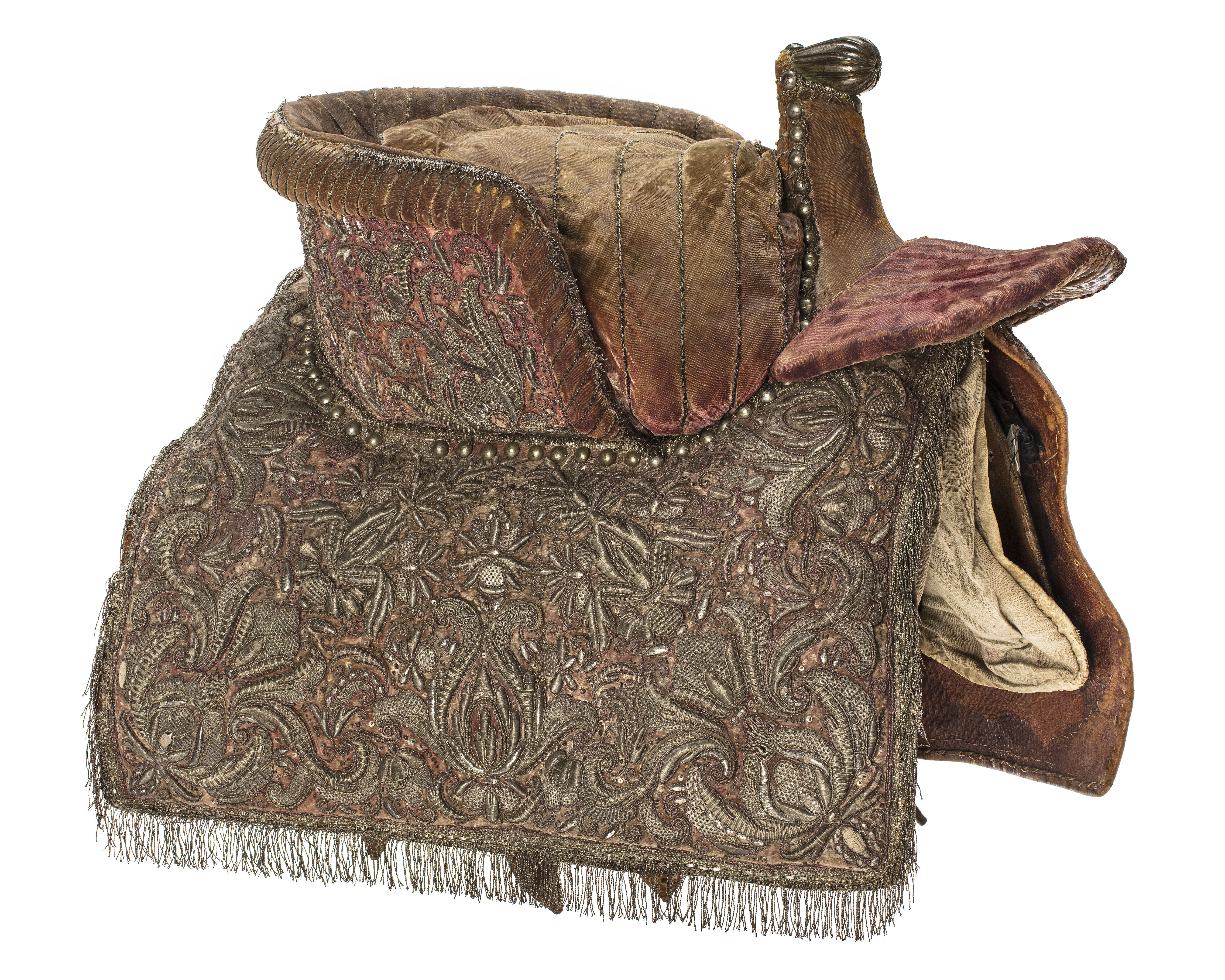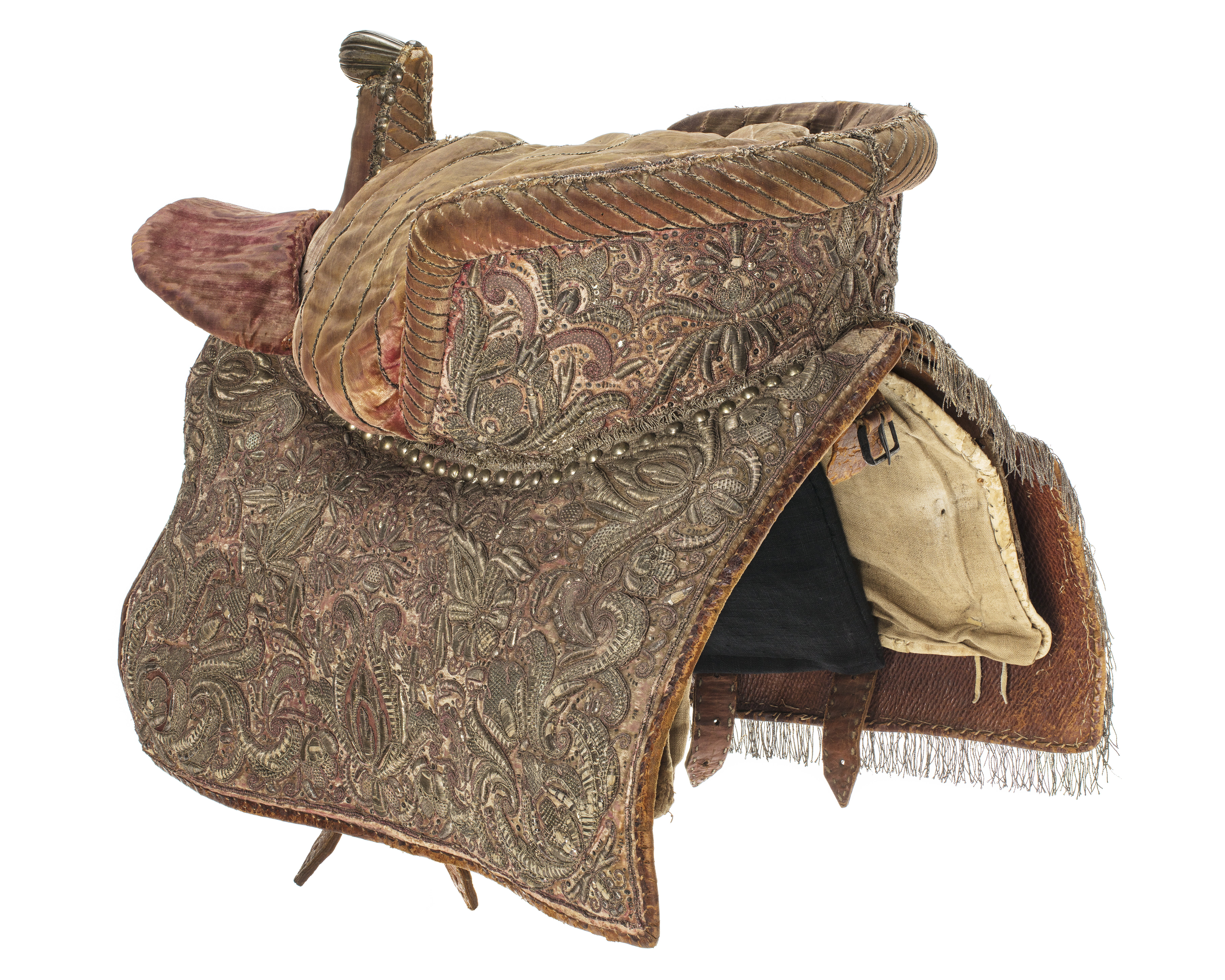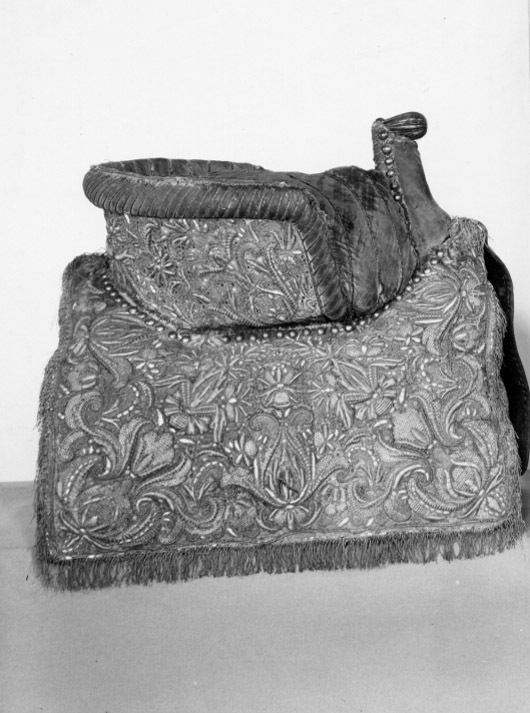 Damsadel, s.k. sidsadel, av ljust rosa sammet med yttäckande broderi av blommor, rankor och voluter med silvertråd, silverlan och delvis paljetter. Rektangulära kappor, fodrade och kantade med mörkbrunt läder och silverfrans. Sitsen till största delen omsluten av en 145 mm hög bom, på utsidan med stoppad vulstformig kant. Sitsen, bommens insida och kanten stickade med tvinnad silvertråd. Hög sadelknapp utan broderier överst rundad framåt utdragen, räfflad av försilvrad mässing. Sadelknappen och sitsen utanför bommen kantade med tännlikor av försilvrad mässing. Lös rundad kudde att lägga framför sadelknappen som stöd för högerbenet. Bom klädd med ljust skinn. Bossor av naturfärgat linne, kantade med vitt skinn och fodrade med ljusbrunt skinn. Tre stroppar av brunt kläder för sadelgjord. En skinnklädd sölja för stigläder. Två söljor för förbygel och en för svansrem, alla av stål.