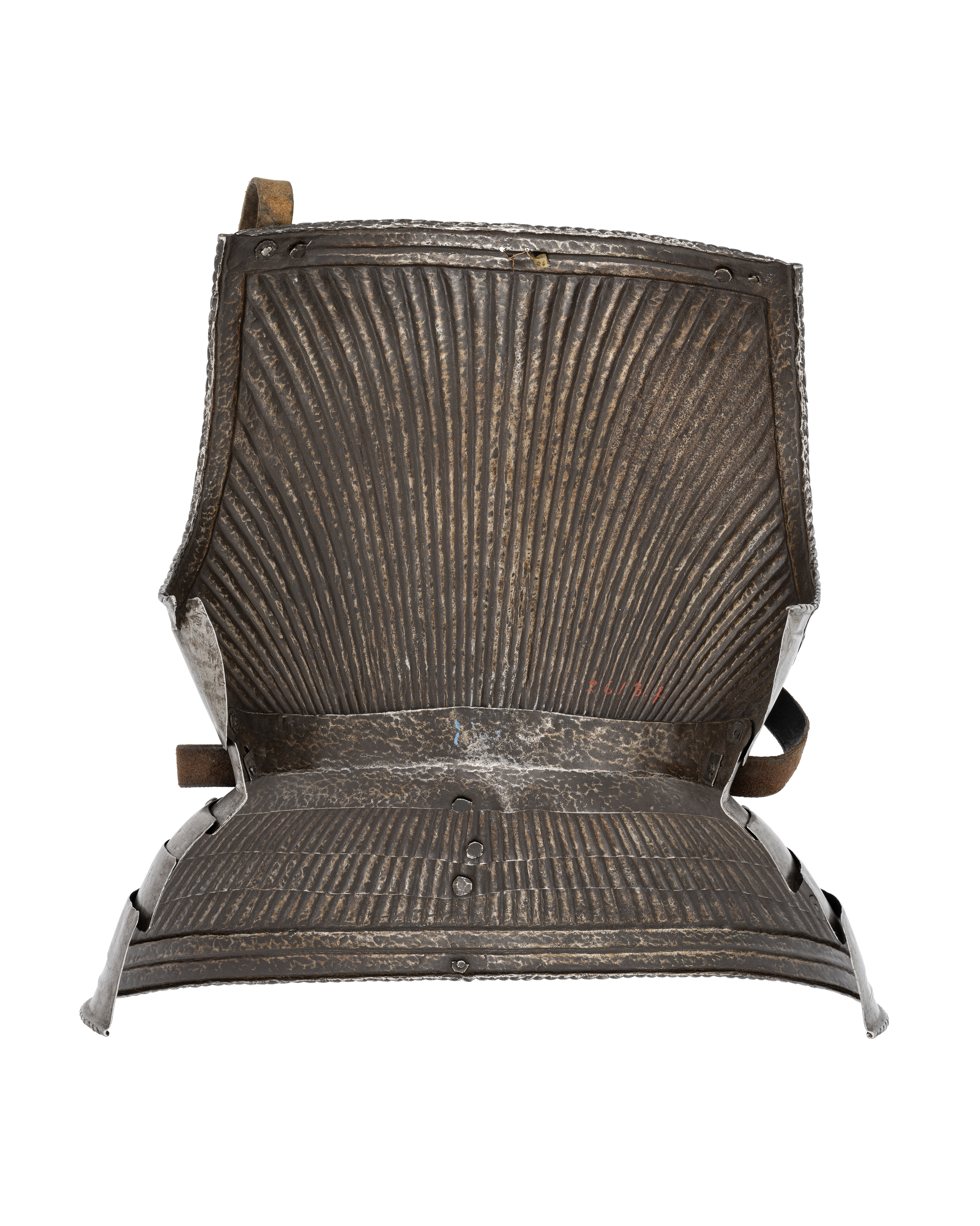 Ryggharnesk i stål av maximiliantyp; ryggdelen med täta ränder, åsar, svagt sammanstrålande mot midjan; ovankant och ärmhål med repdekor; slät midjedel; höftskört med tre lameller med fjälldekor, den understa även med en slät del och avslutad med repdekor; spännremmar vid axlar och midja, sannolikt sentida.