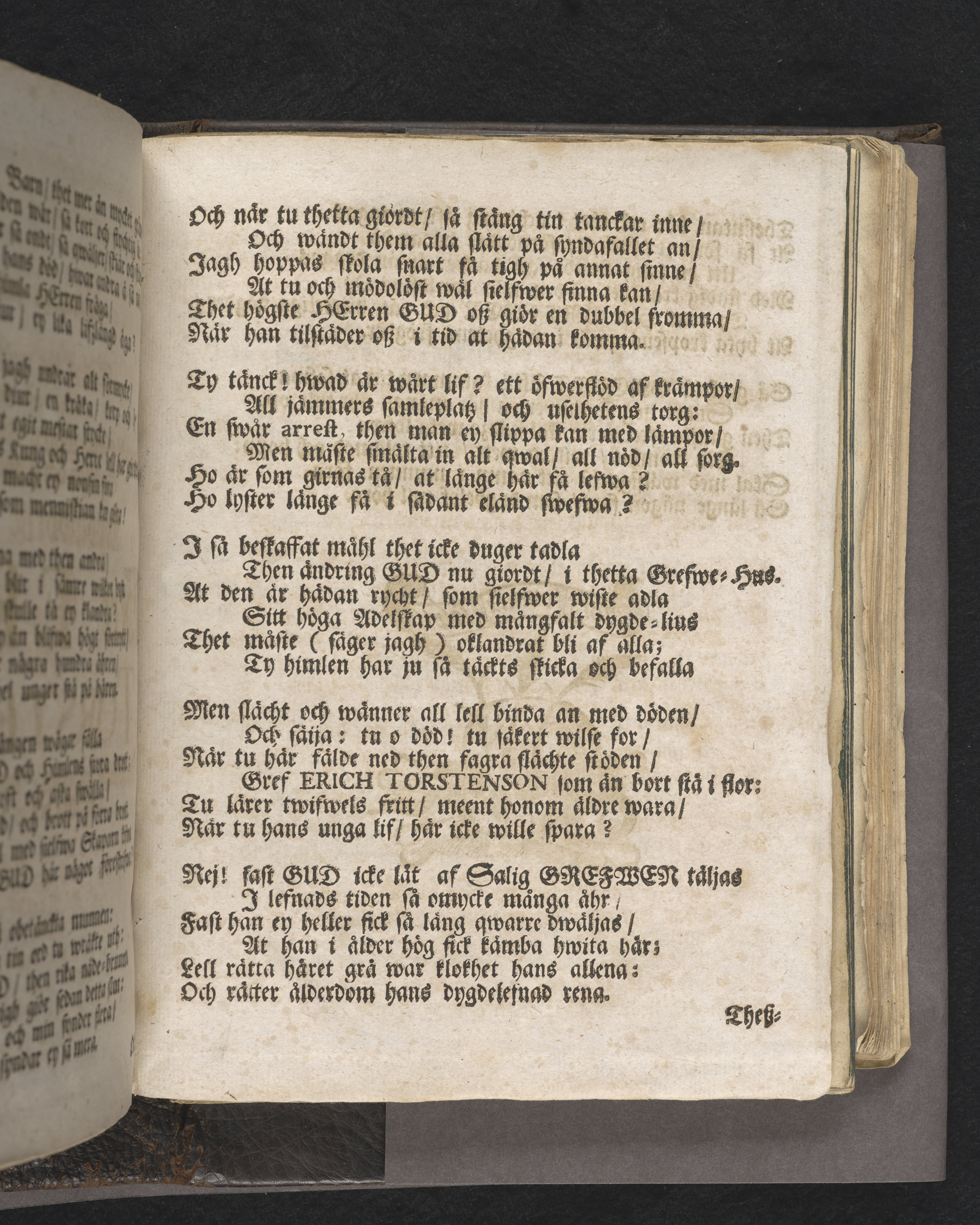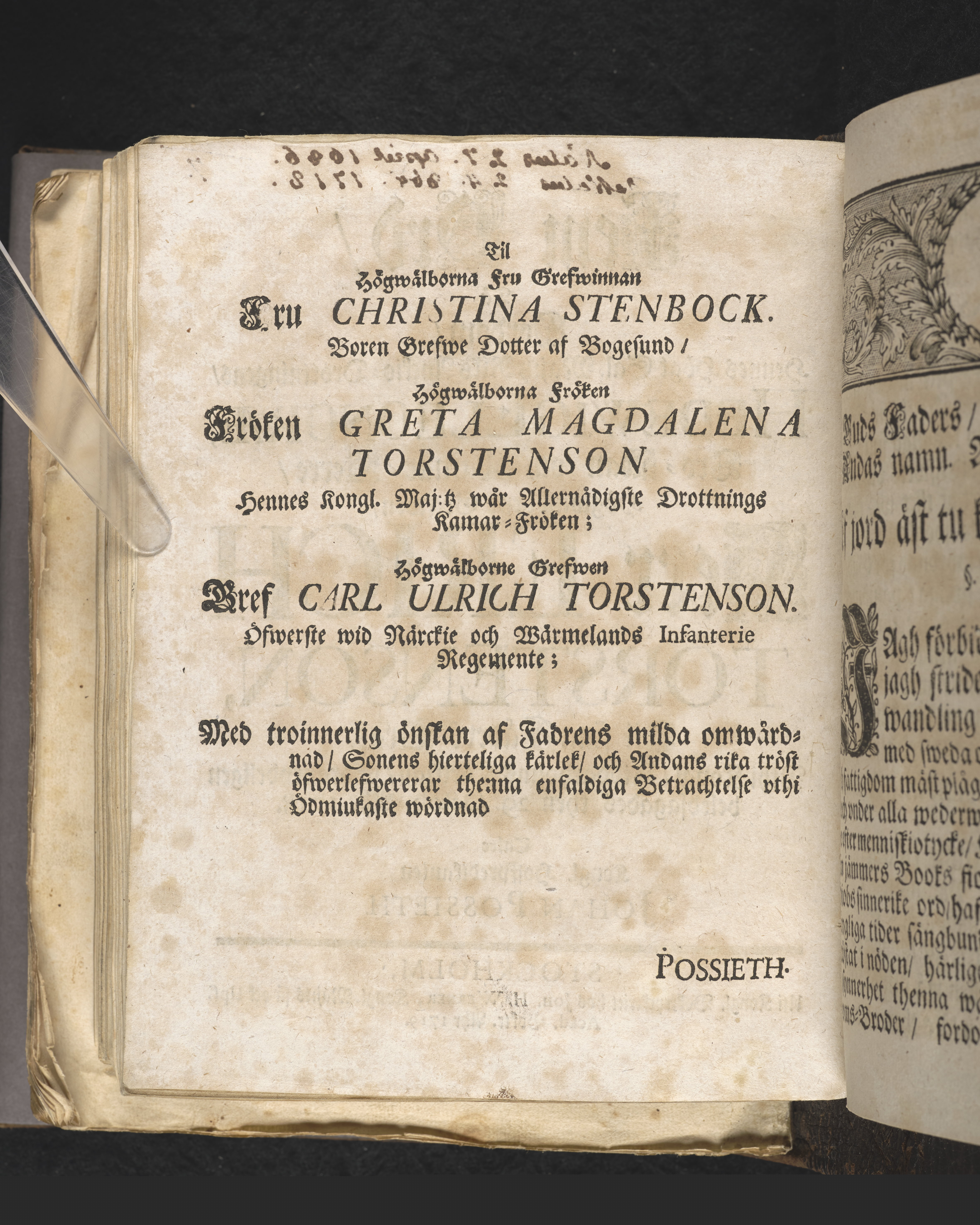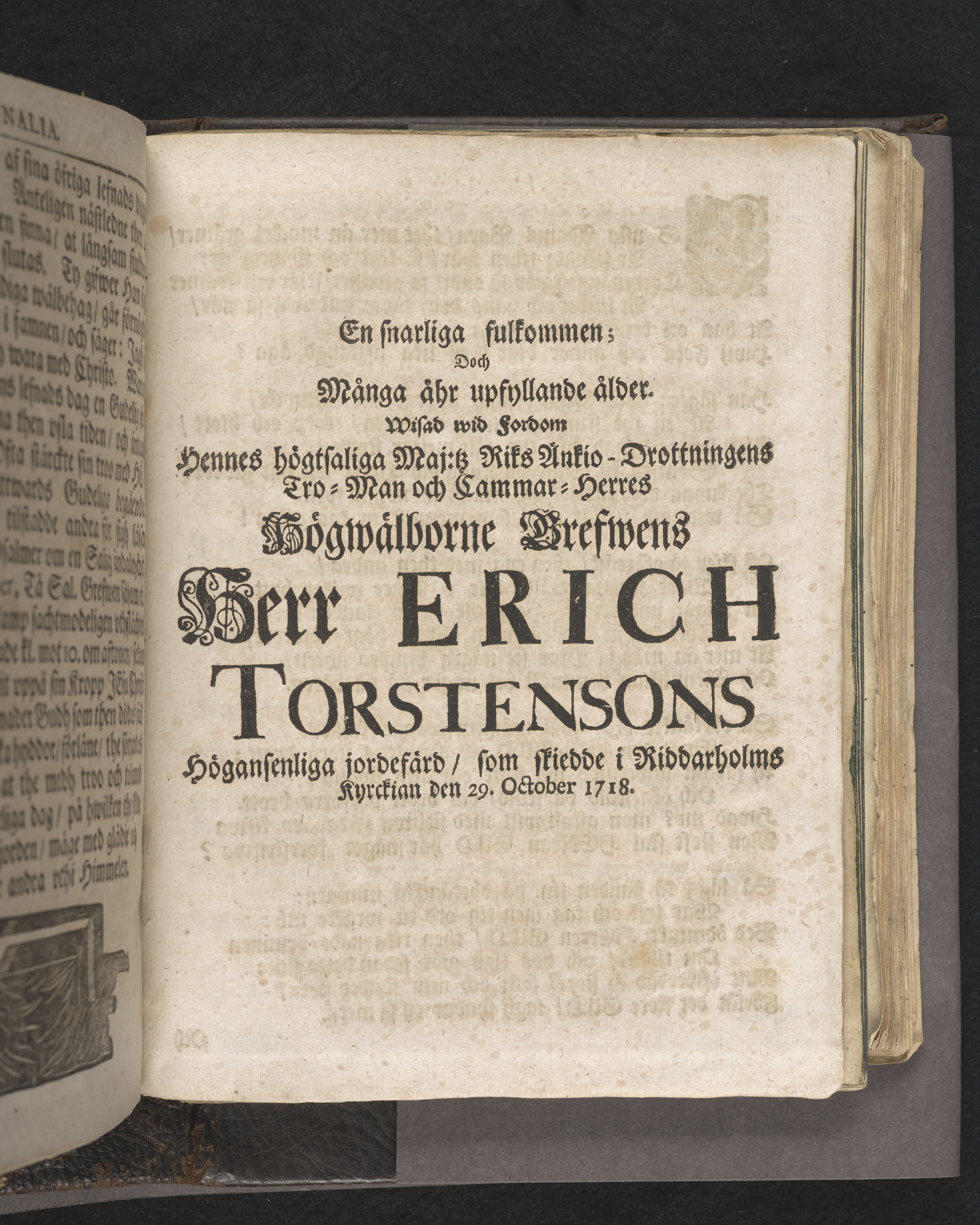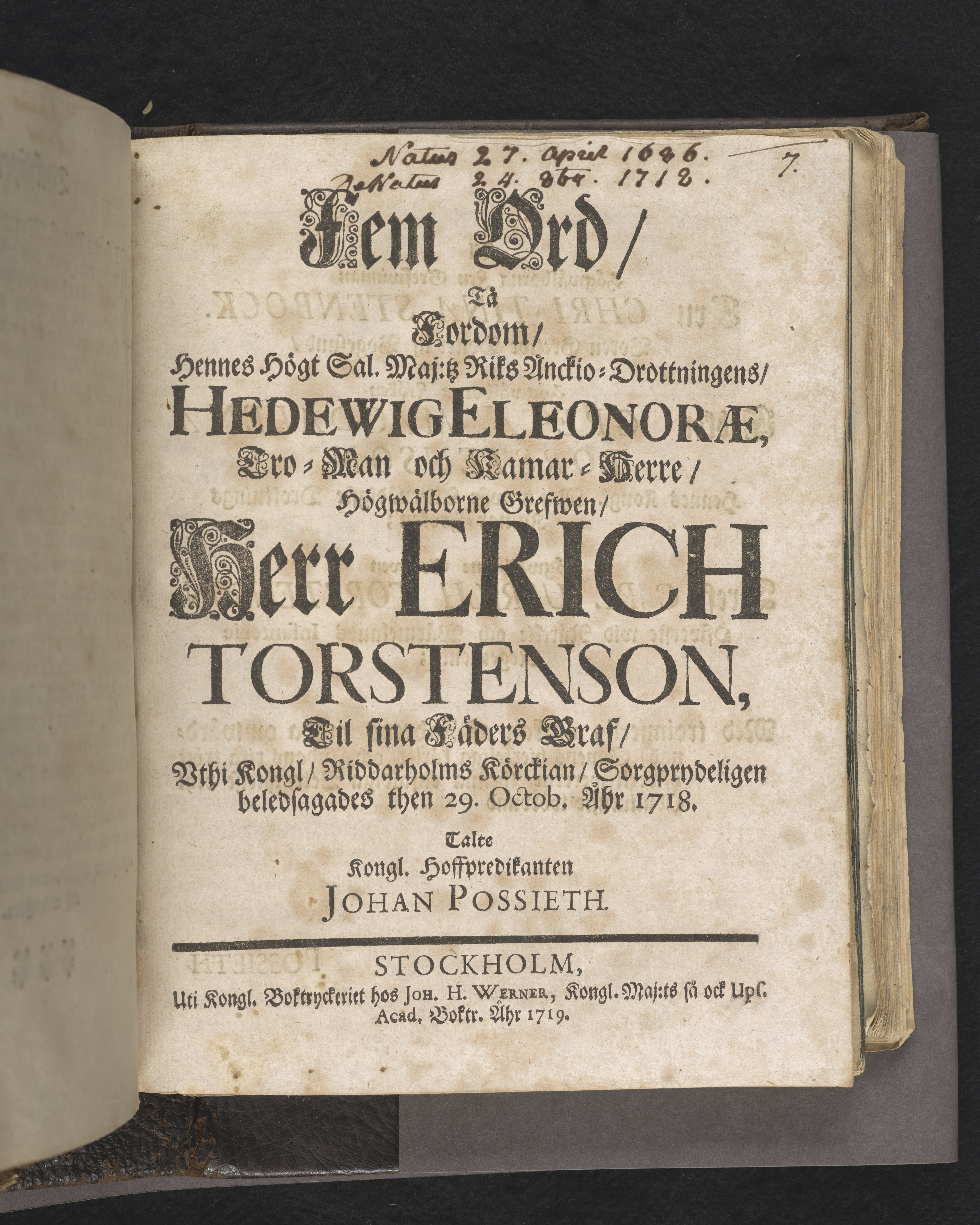 Fem ord, tå fordom ... Hedewig Eleonoræ, tro-man och kamar-herre, högwälborne grefwen, herr Erich Torstenson, til sina fäders graf, vthi kongl, Riddarholms körckian, sorgprydeligen beledsagades then 29. octob. åhr 1718. talte ... Johan Possieth. Stockholm, uti kongl. boktryckeriet hos Joh. H. Werner, kongl. maj:ts så ock Ups. acad. boktr. åhr 1719.