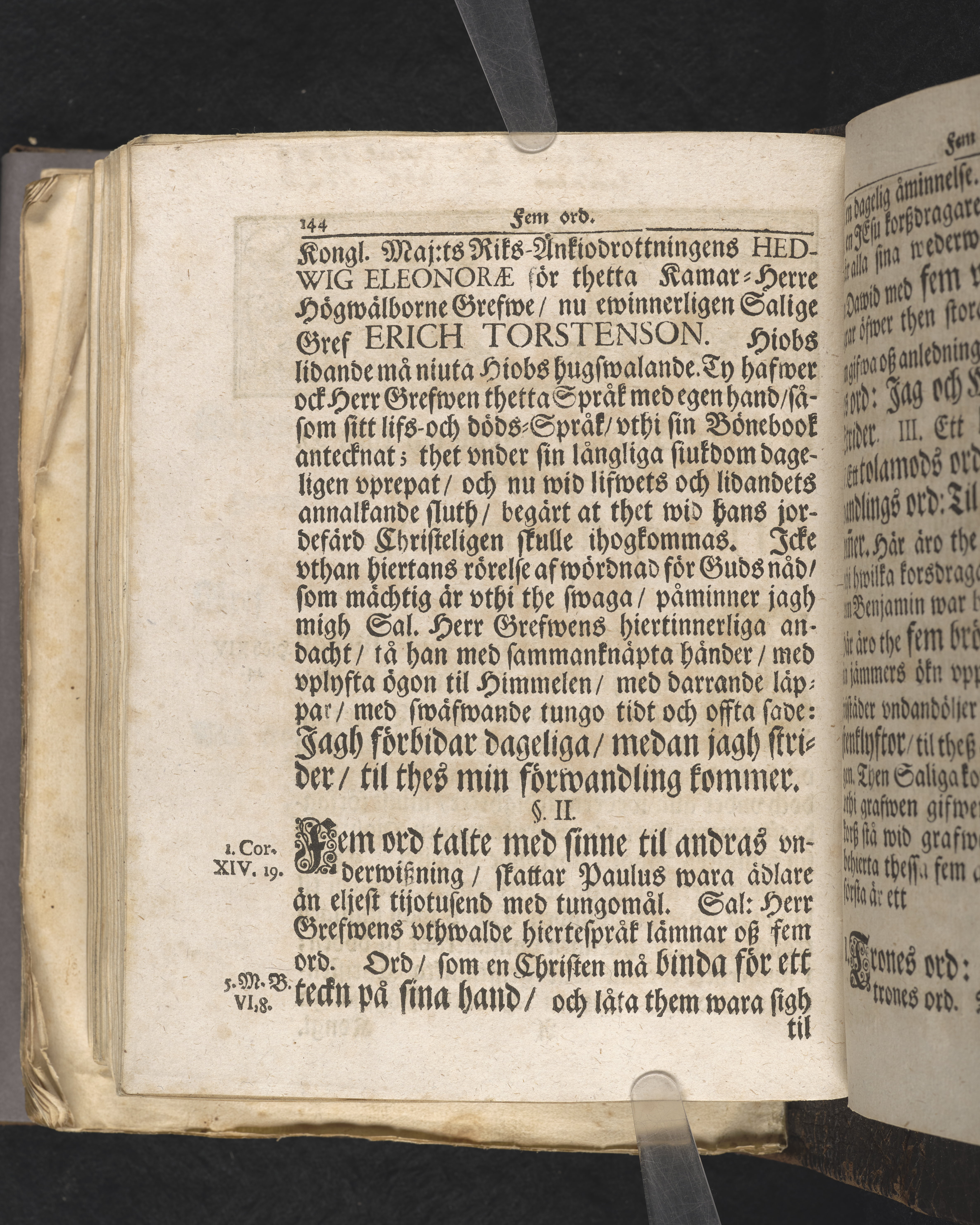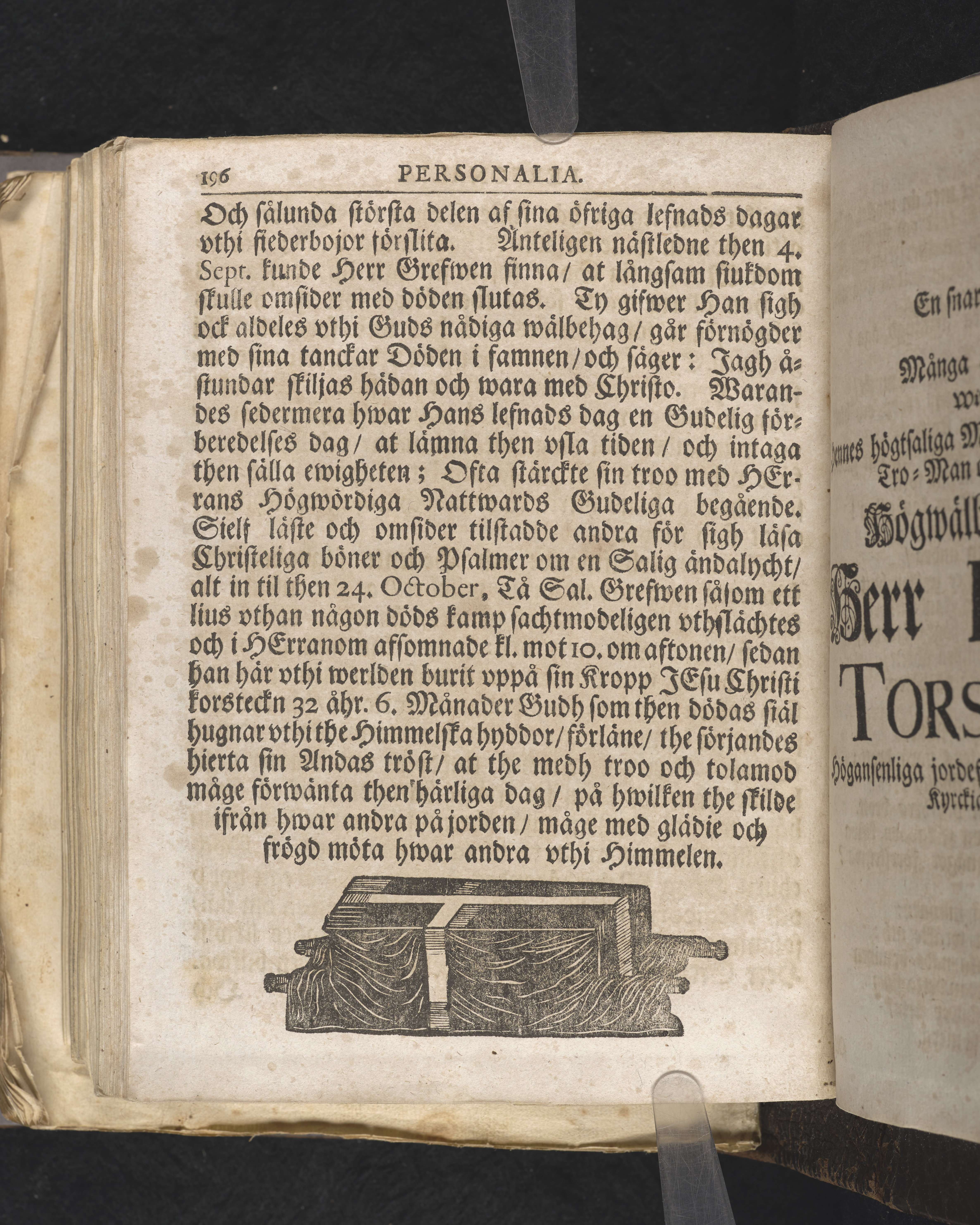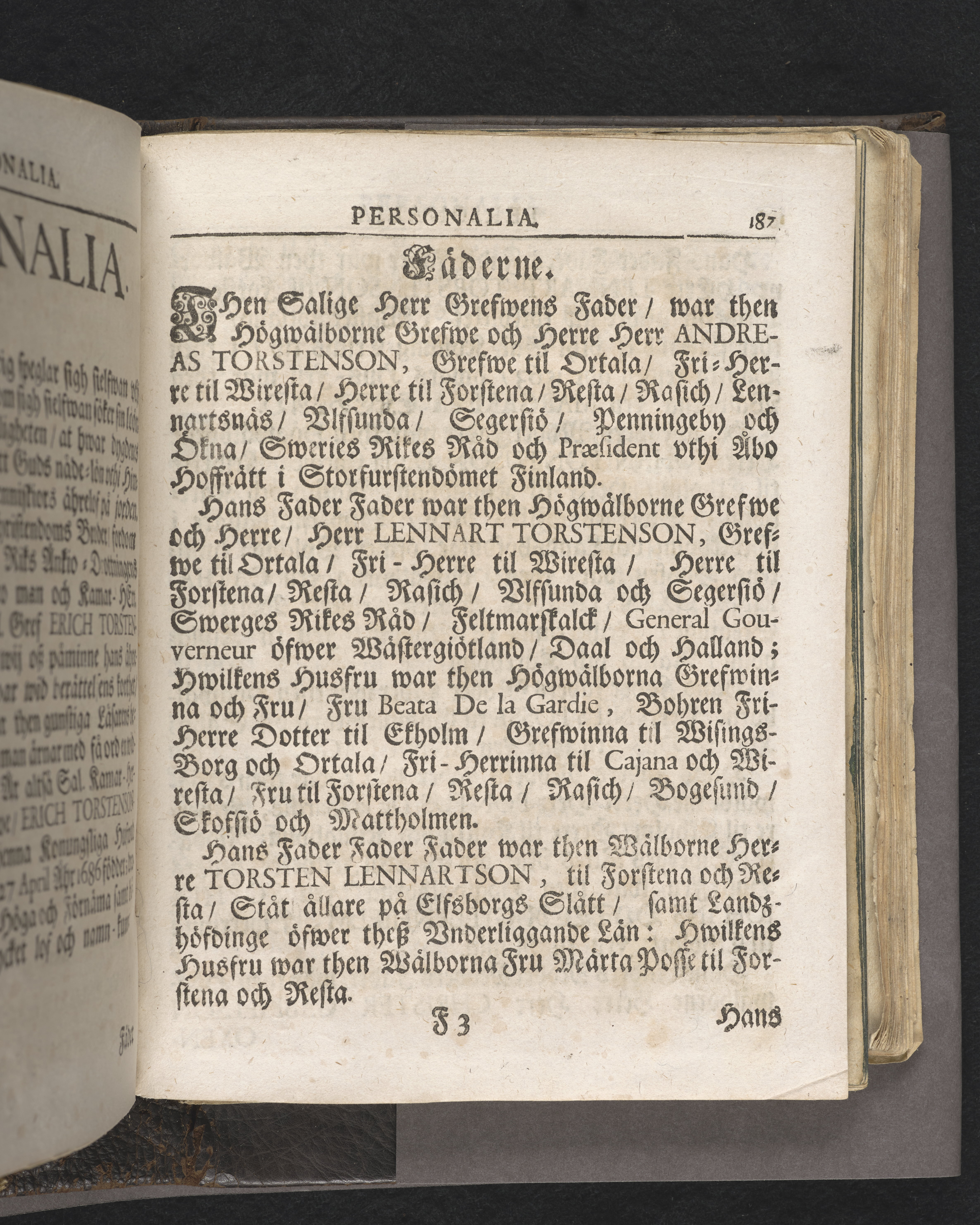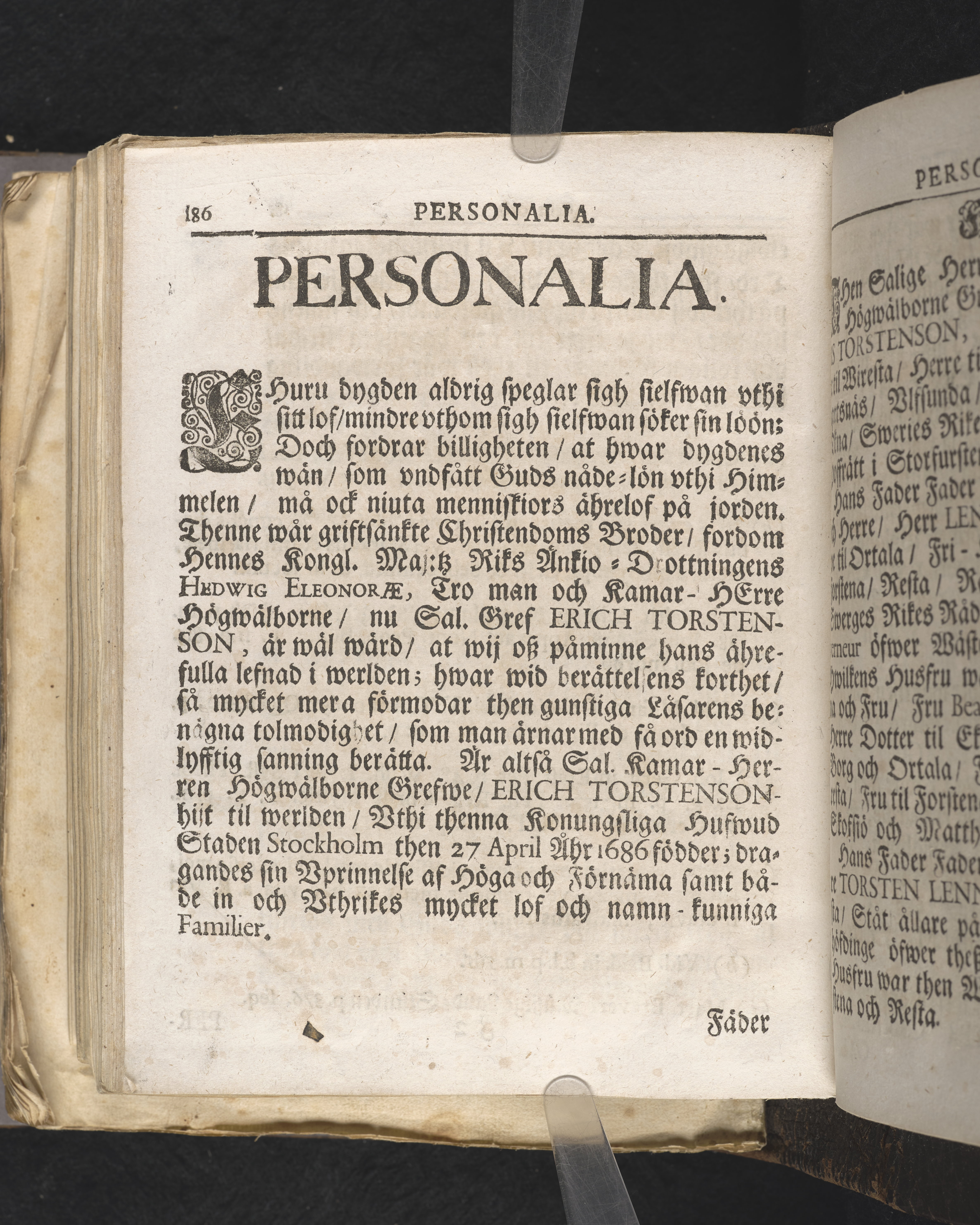 Fem ord, tå fordom ... Hedewig Eleonoræ, tro-man och kamar-herre, högwälborne grefwen, herr Erich Torstenson, til sina fäders graf, vthi kongl, Riddarholms körckian, sorgprydeligen beledsagades then 29. octob. åhr 1718. talte ... Johan Possieth. Stockholm, uti kongl. boktryckeriet hos Joh. H. Werner, kongl. maj:ts så ock Ups. acad. boktr. åhr 1719.