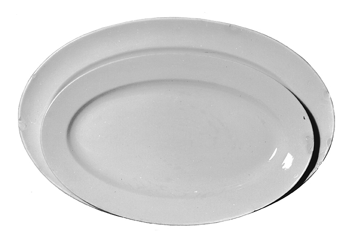 FAT,Fyra ovala fat av halväkta porslin, två större och två mindre. Av s. k. halväkta porslin (ironstone china). Ovala med plan botten, kälformig kep samt snett utstående brätte, de båda mindre på låg fotkant. De mindre, H: 3,1; L: 30,5; B: 19,2 cm. De större, H: 2,7; L: 36; B: 23,3 cm