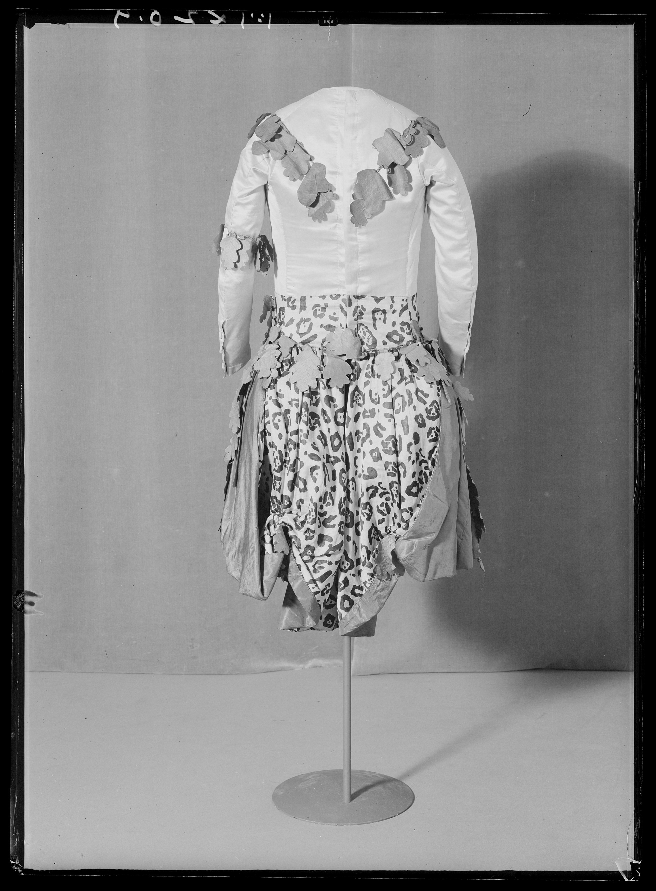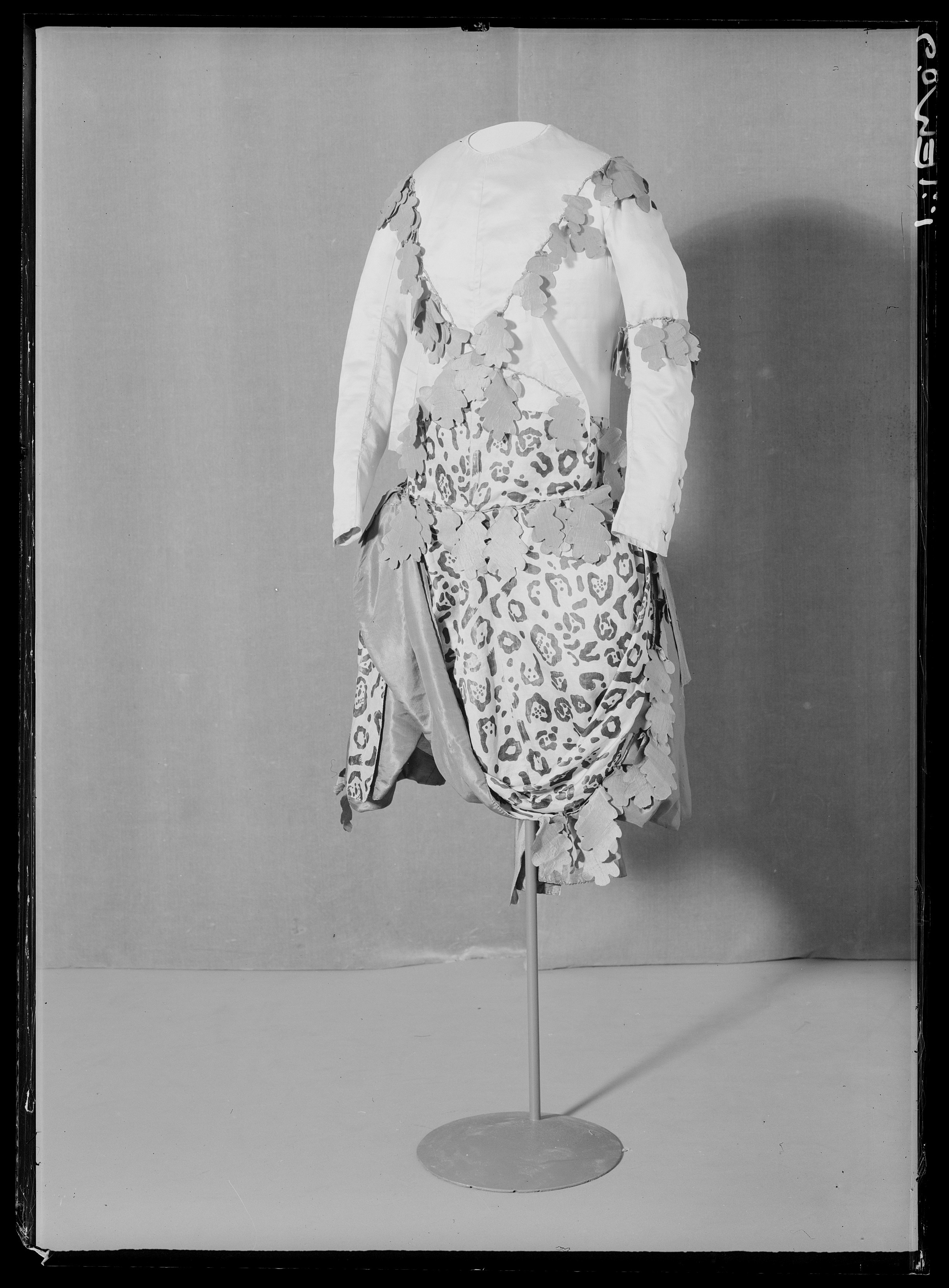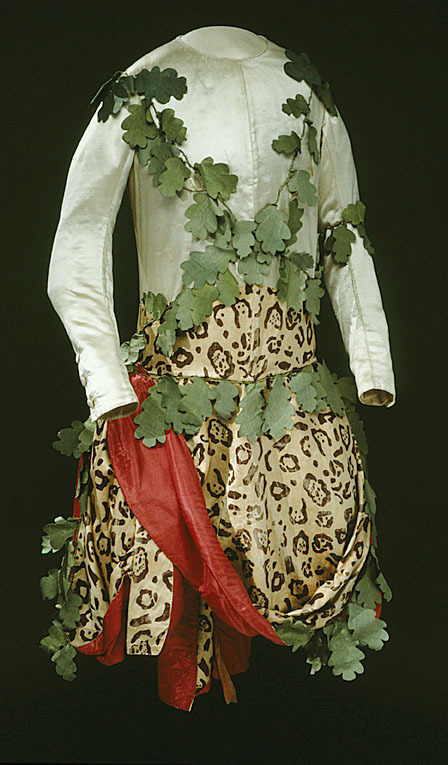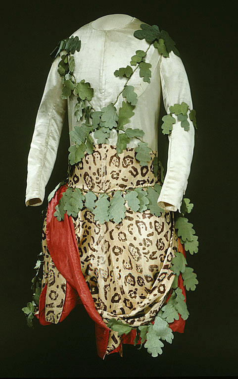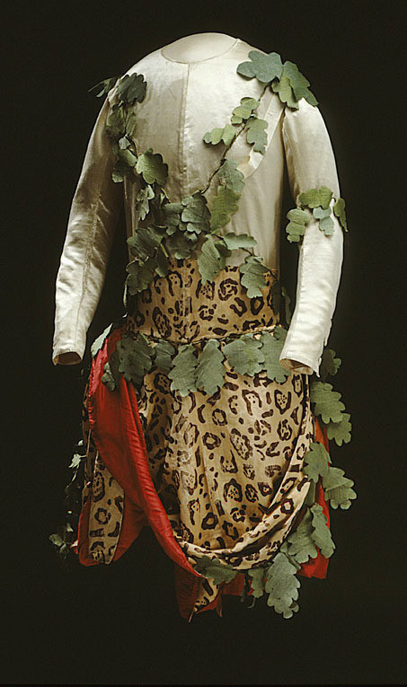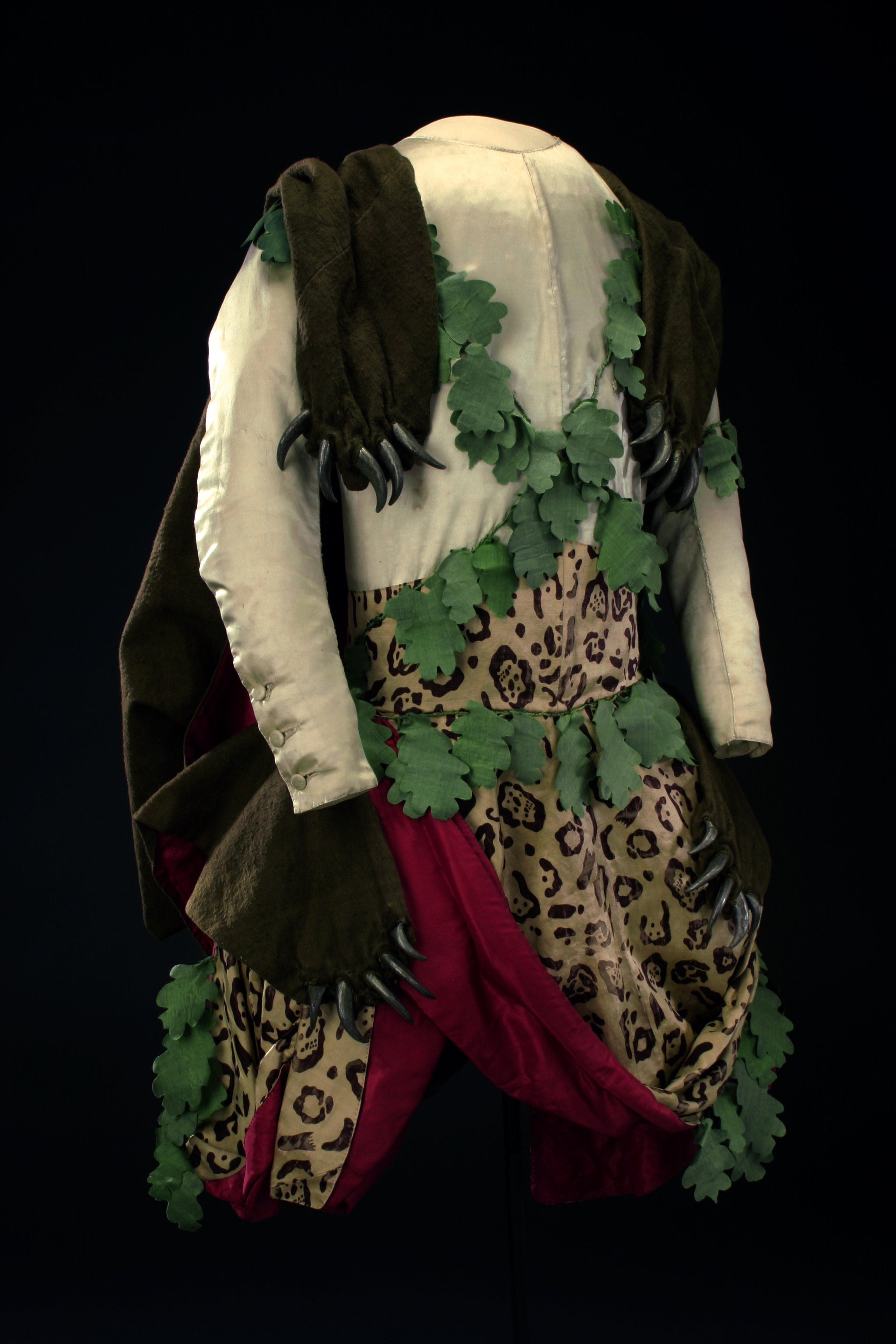 Hertig Karls dräkt från "Dianas fest", karusell på Drottningholm i augusti 1778, där han uppträdde som faunernas anförare Nessus. Liv av vit atlas som snöres i ryggen. Fastsydd kjol av ljusbrunt siden med målat leopardmönster, fodrad med cerisefärgad taft. Besättningar över livet och runt midjan av rankor med urklippa löv av grönt siden. Ärmens insida märkt "Hertig Karl".