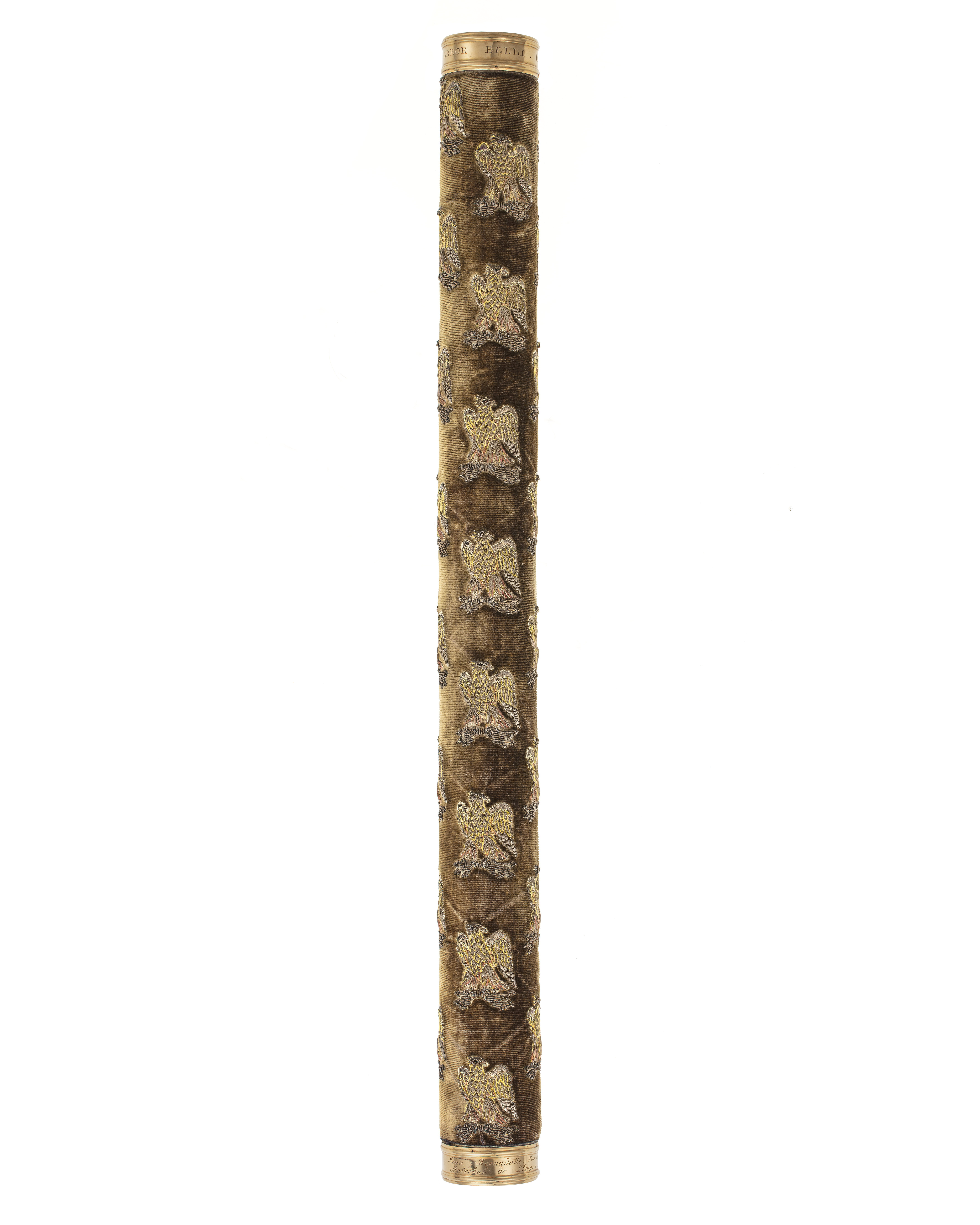 Cylindrisk stav, klädd med nu brun, ursprungligen purpurfärgad sammet med i guld och gult silke broderade franska, kejserliga örnar (32 st). Ändarna likaså klädda med sammet med broderade lagerkransar. Ringformiga ändbeslag av guld med släta kantringar. Otydliga stämplar, oval med tupp och 3 (3.e Titre d'or 1798-1809, se Carré), oval med manshuvud, fas, till v. 8 (Grosse Garantie d'or), stämpel med hundhuvud (?) samt en rombisk mästarstämpel, varav bokstäverna M och I möjligen kan uttydas. På den nedre ringen graverad text: "Jean Bernadotte, Nommé par L'Empereur Napoleon // Maréchal de l'Empire, le 29 Floréal An 12.e". På den övre ringen graverad text: "TERROR BELLI, DECUS PACIS". Givare: Karl XIV Johans arvingar. Inlämnad till Klädkammaren i december 1844.
