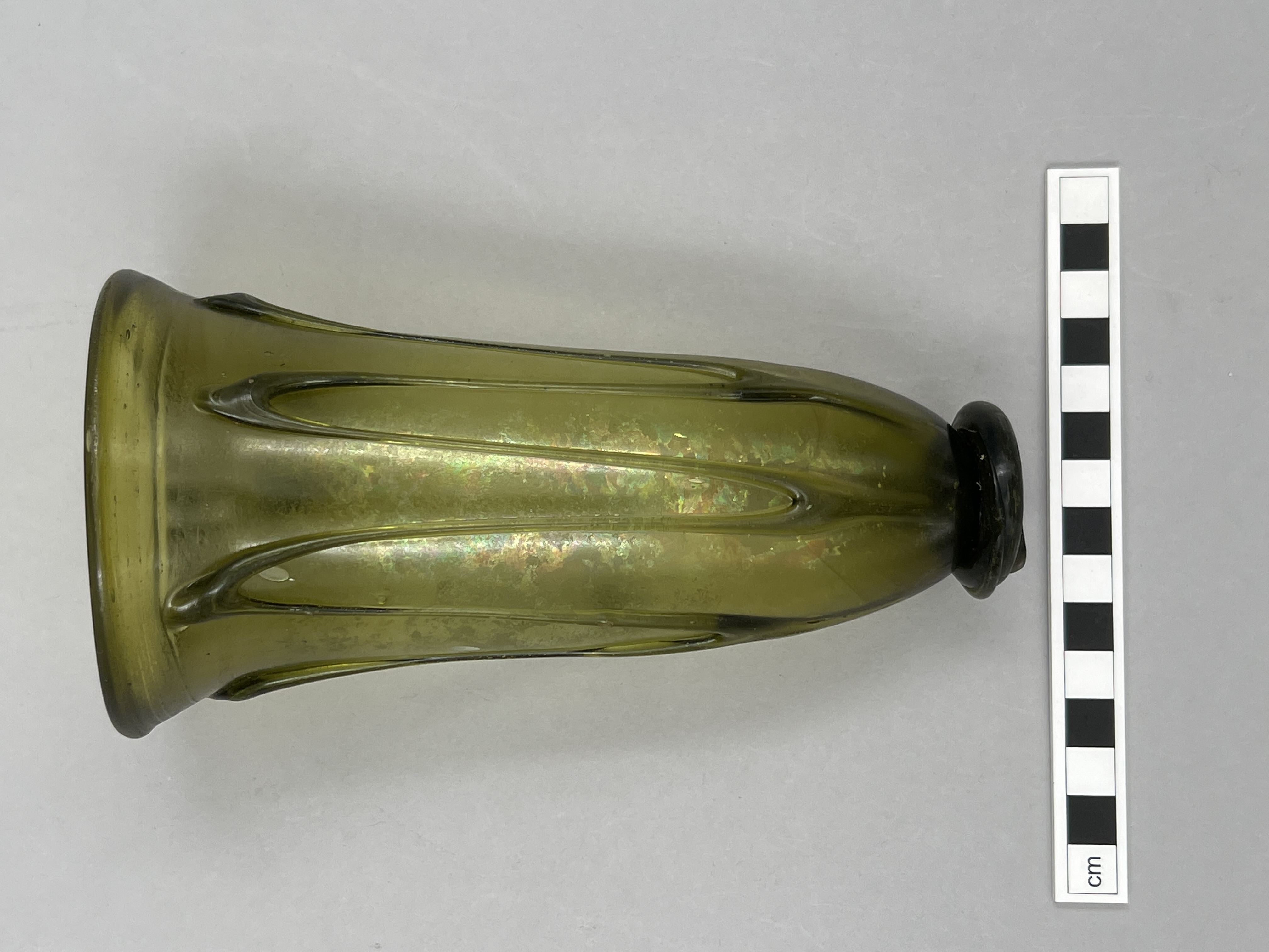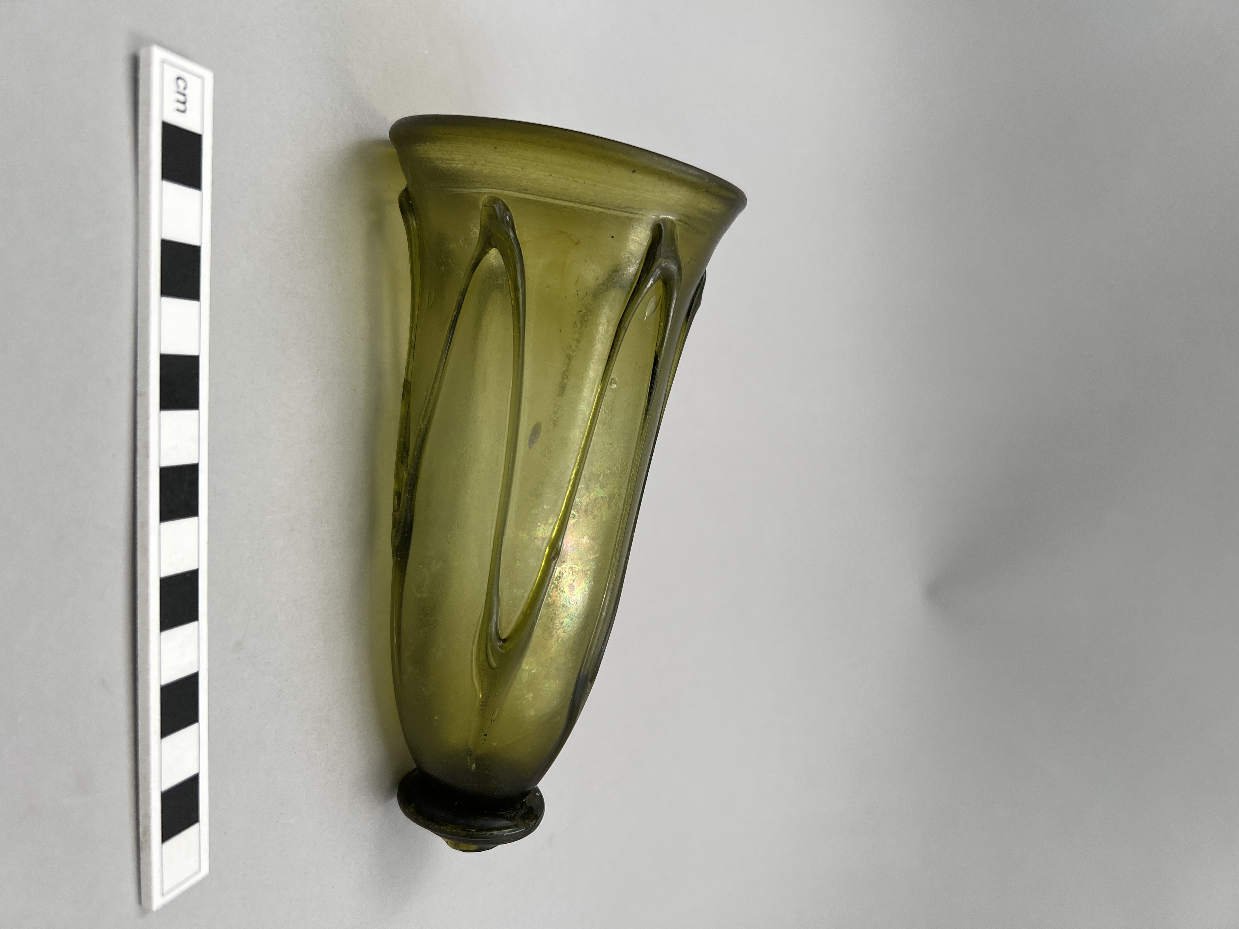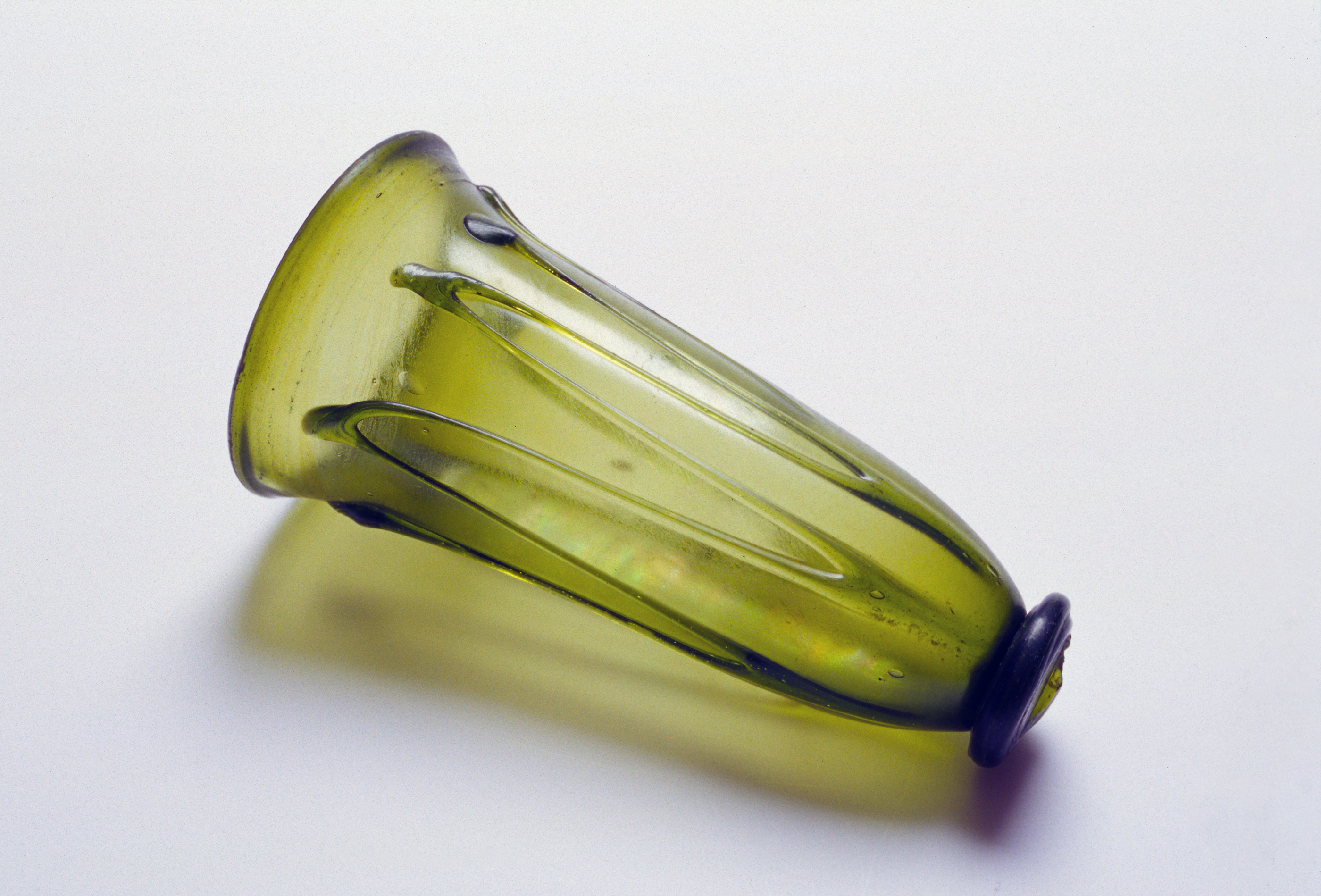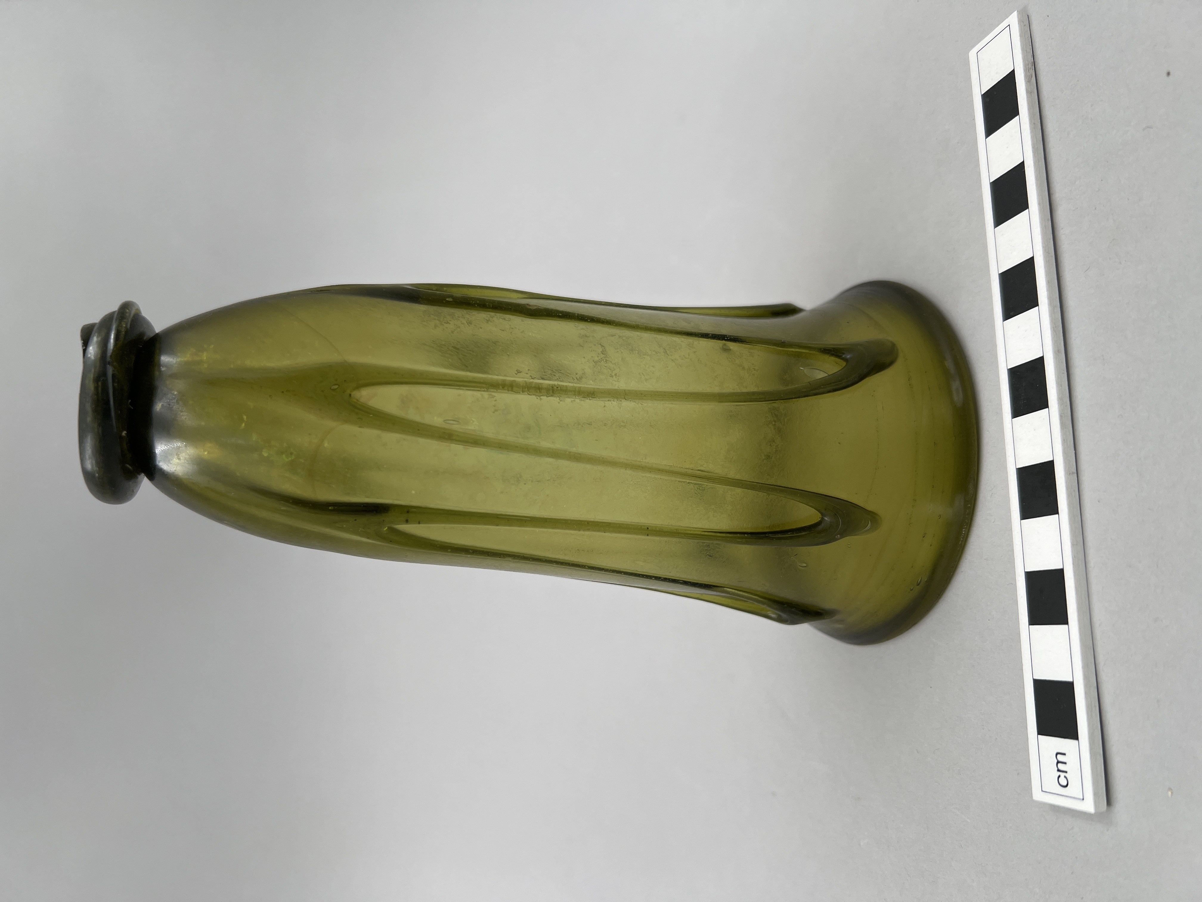 Grönt glas. S.k fotbägare med smal halsspiralzon och slingor på buken