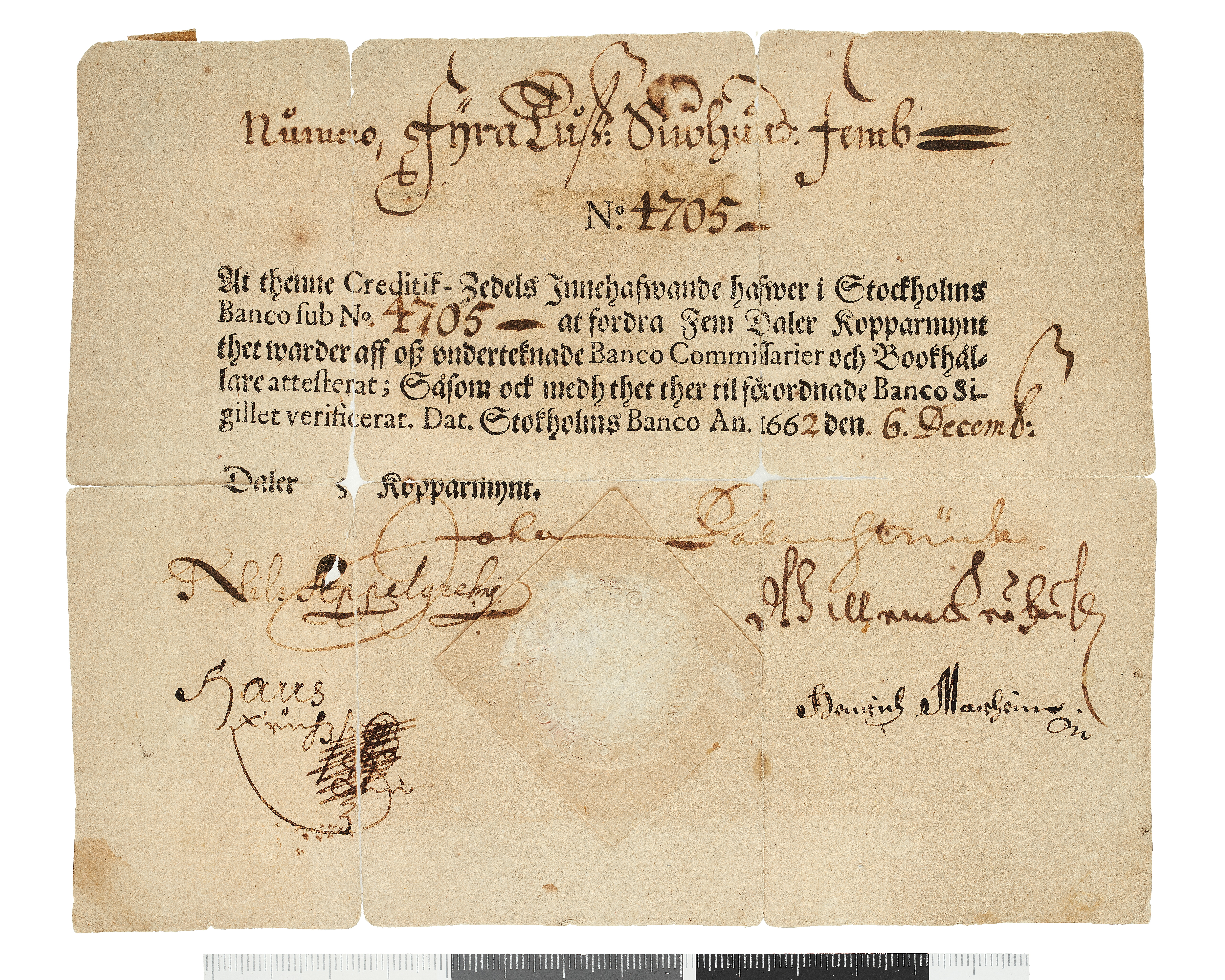 Upphov: Stockholms banco, Ekonomiska museet - Kungliga myntkabinettet/SHM (PDM) Upphovsrätten till detta verk har gått ut och är därmed fritt att använda på alla sätt. Ange gärna upphovsperson om denne är känd.