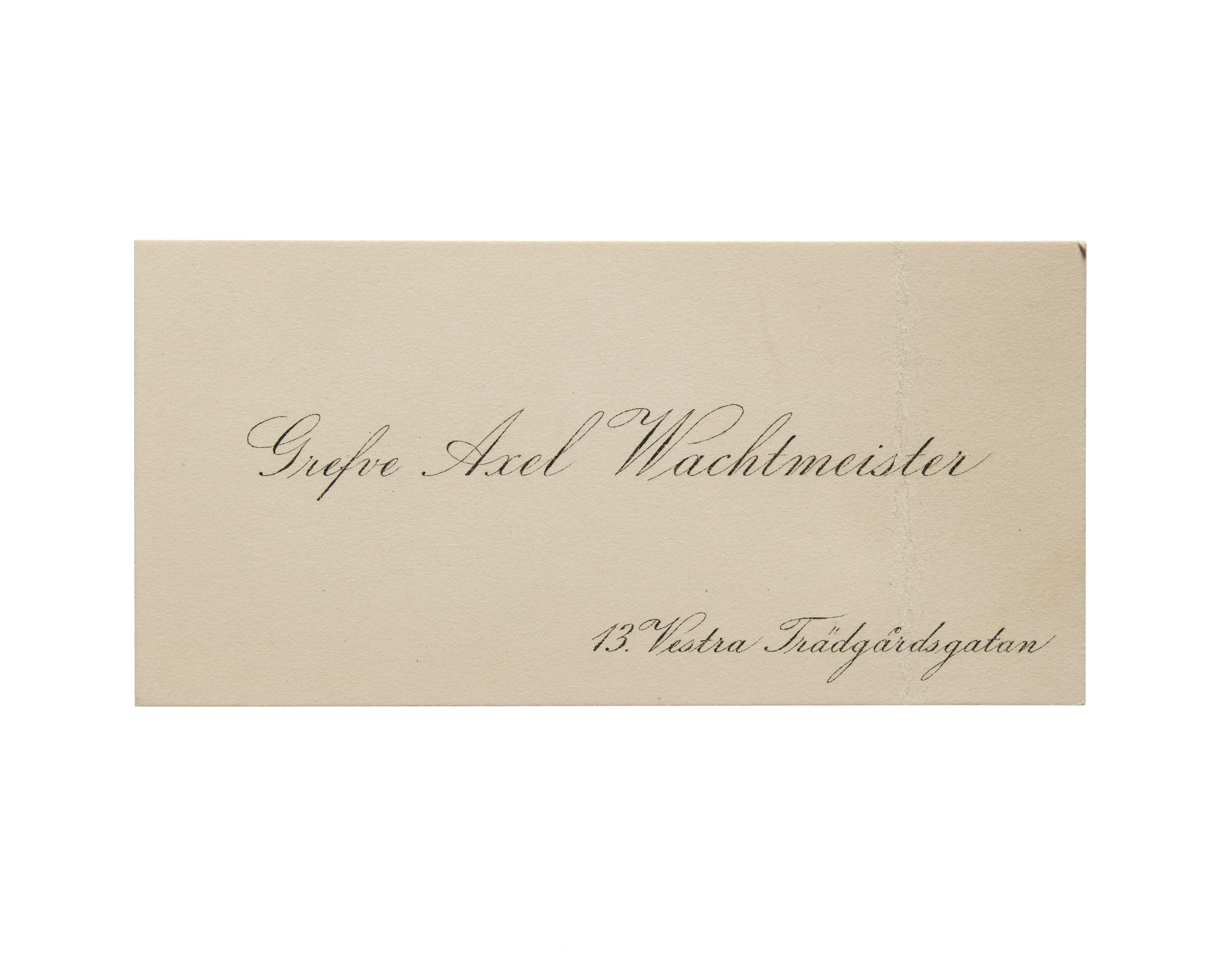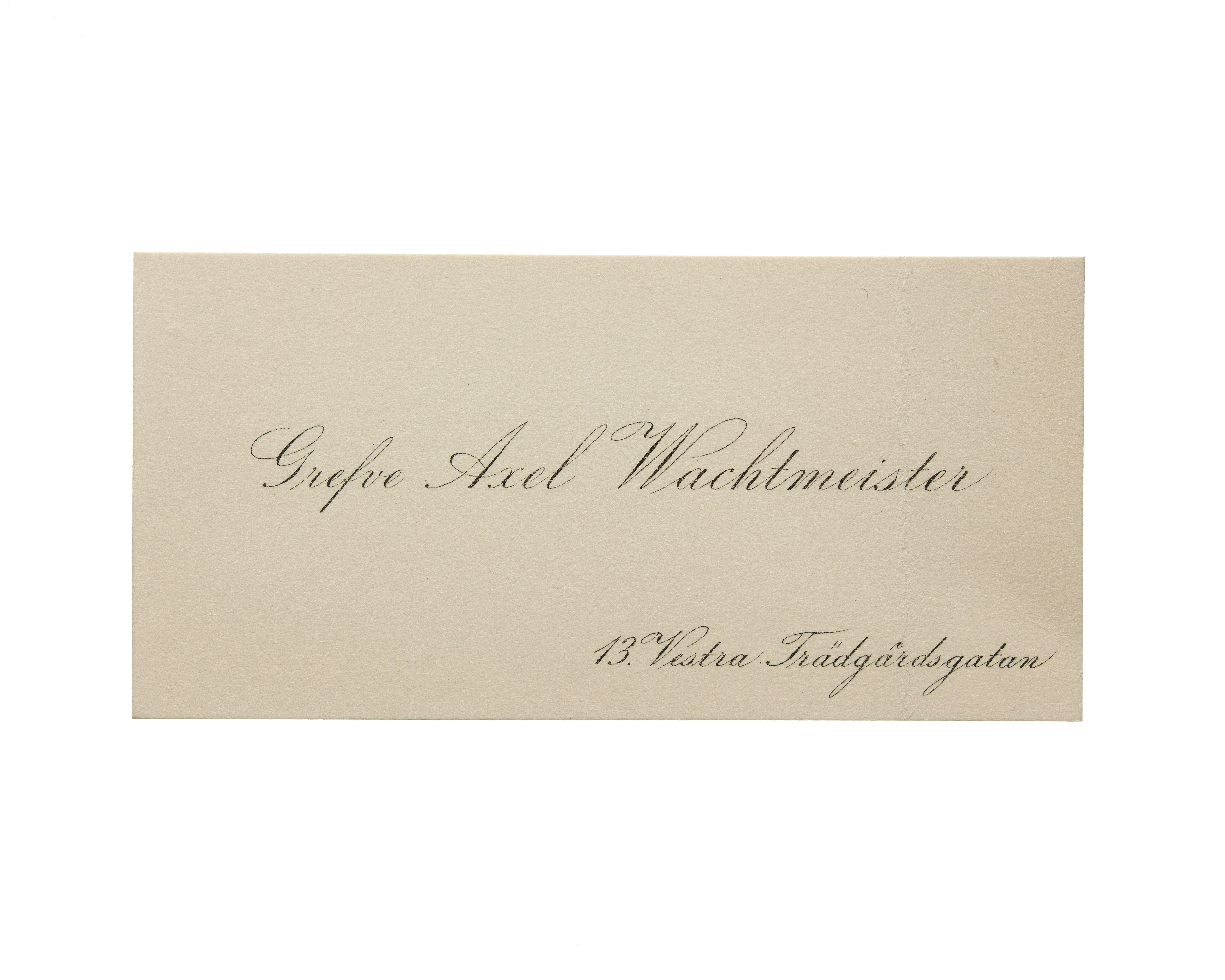Två visitkort från greve Axel Wachtmeister. Båda daterat 1916, vikt i högra sidan. Adress (nedre högra hörnet) 13. Vestra Trädgårdsgatan.