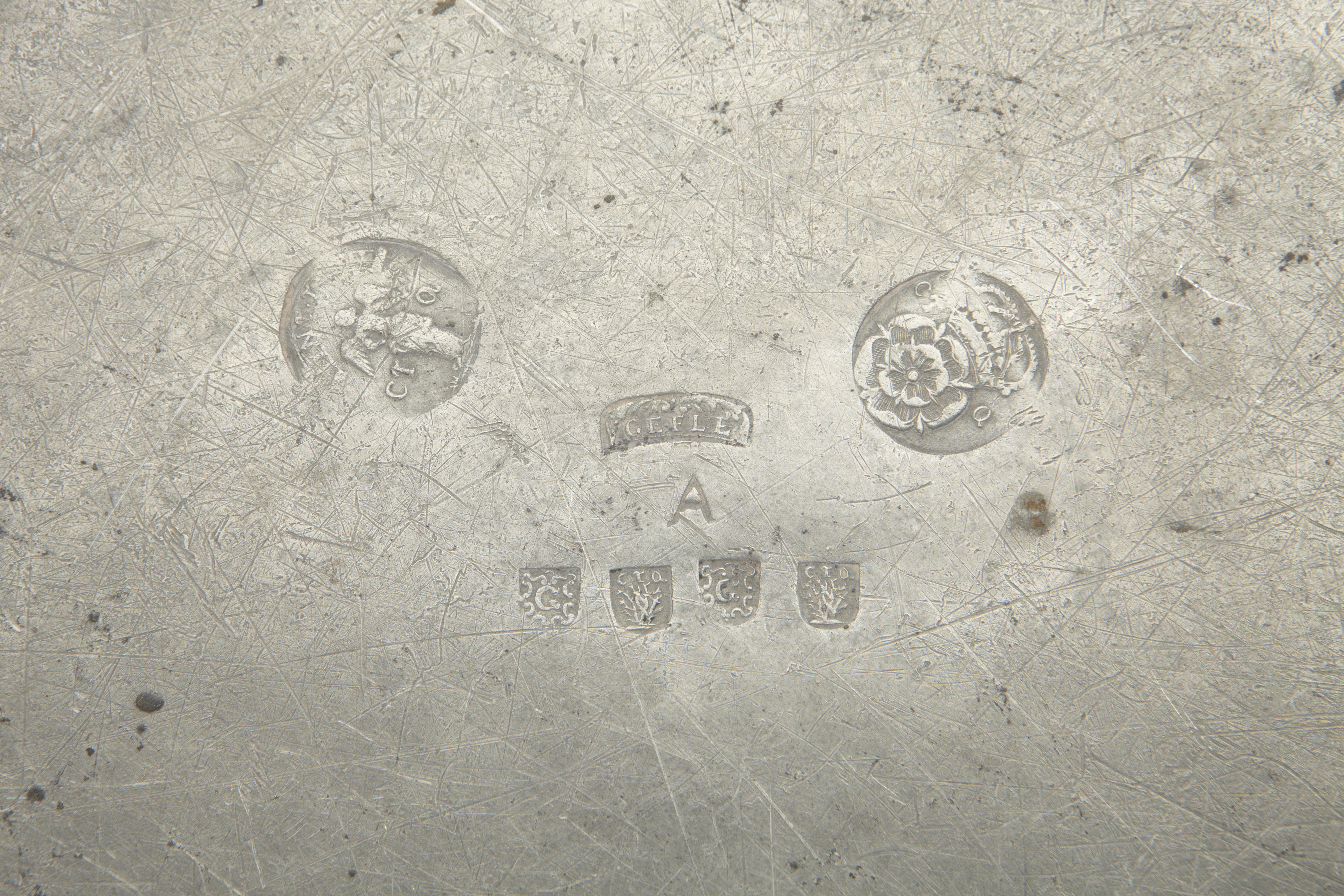 Runt fat med uppvikt brätte av 4-stämplat tenn. Runt, kupat lock med knopp av 4-stämplat tenn. Stämplar, fatet:Ängelstämpel och rosstämpel med bokstäverna CTQ, 2 stadsstämplar (i sköldformat fält bokstaven G inom ornamentbård), 2 mästarstämplar (i sköldformat fält bokstäverna CTQ över törnkvist), GEFLE, årsbokstav A: 1742 (versal i antikvastil. ÄVen stor bokstav med antikva versaler/skrivstil användes i landsortsstäder för åren 1742-1782, enl. Santesson). Ristat MB. Stämplar, locket: 2 stadsstämplar och 2 mästarstämplar (som ovan) ordnade i ring. Fatet stämplat på undersidan av spegeln. Ängel- och rosstämpeln visar att tennet är av bästa kvalitet, enl. Magnus Green, Nordiska museet, 2006-10-26. Angripet av tennpest.