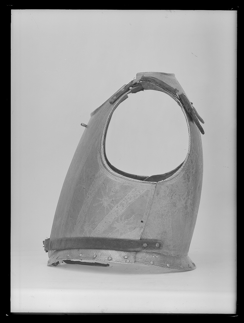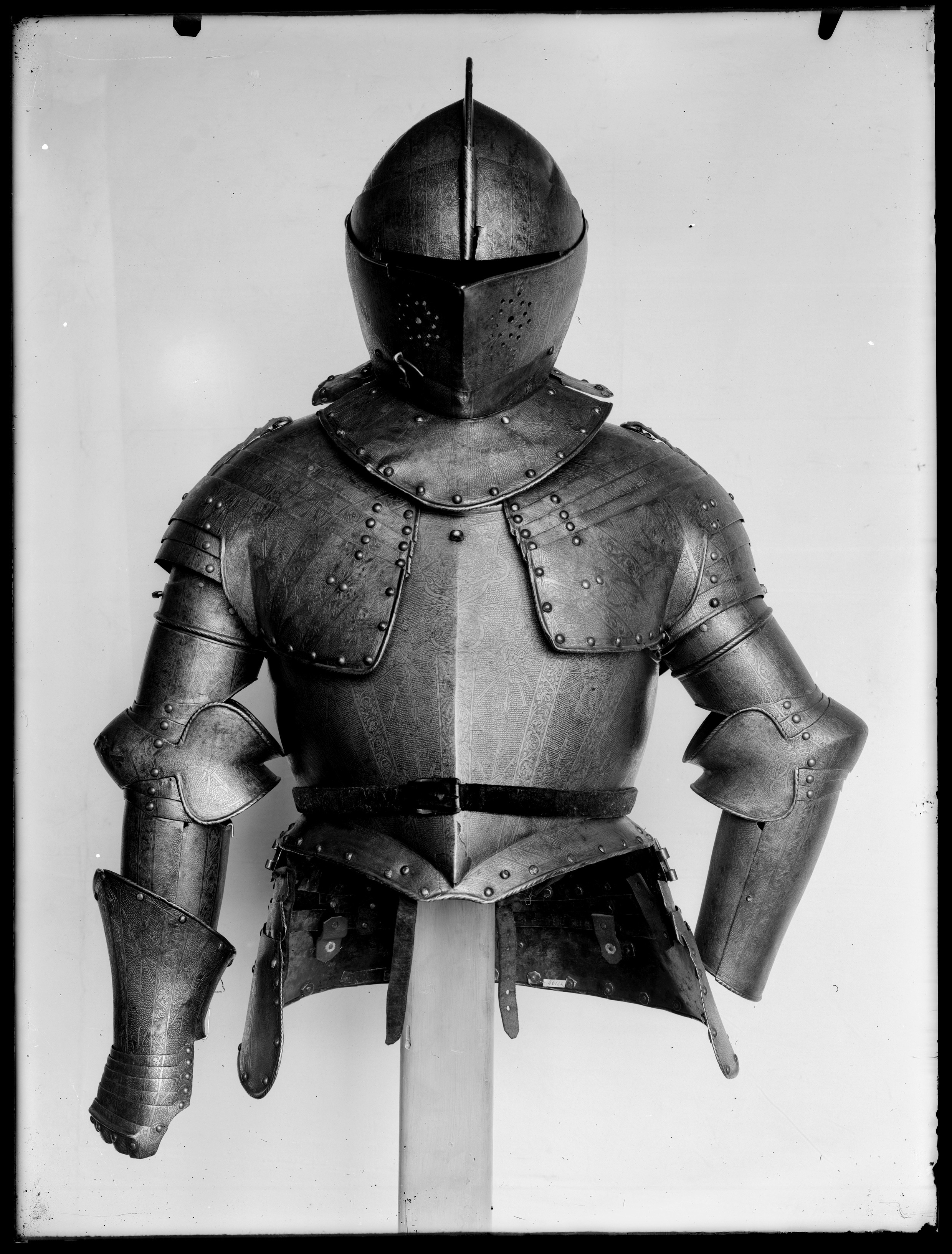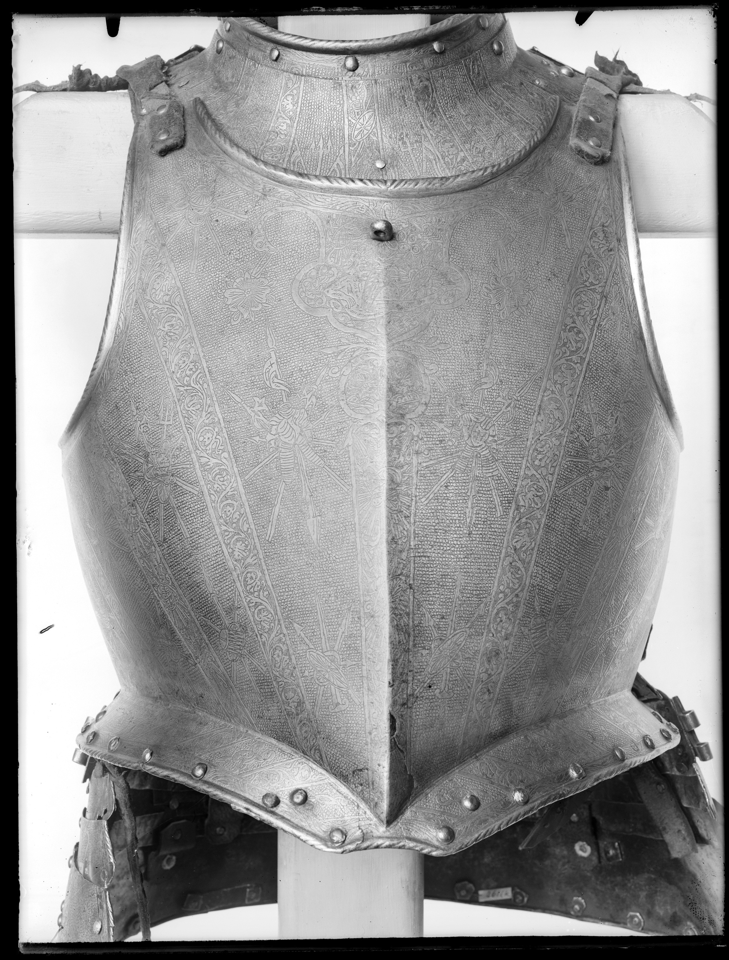 - Konung Erik XIV rustning af jern, etsad i ornementer och förgylld, består af:
