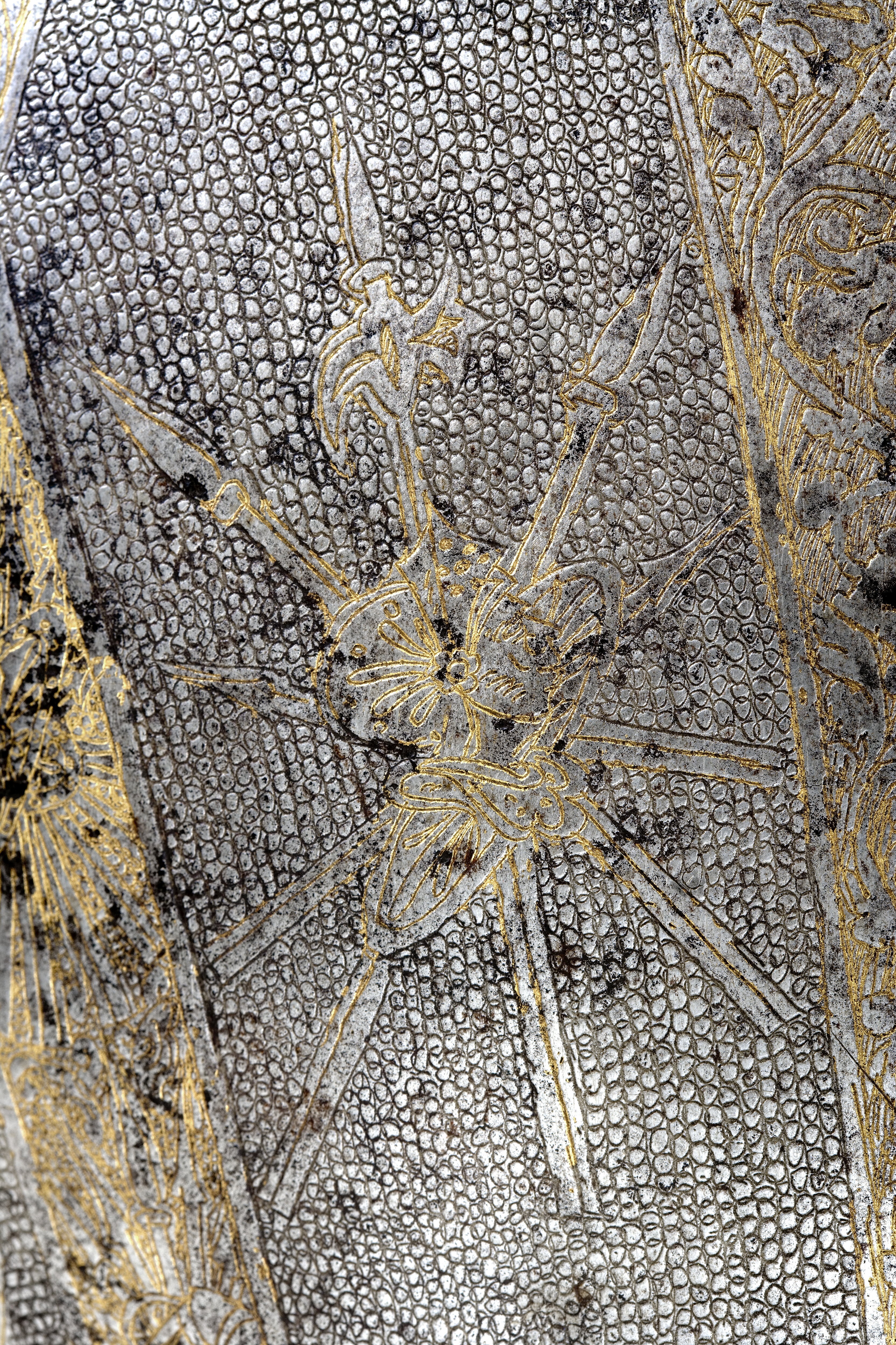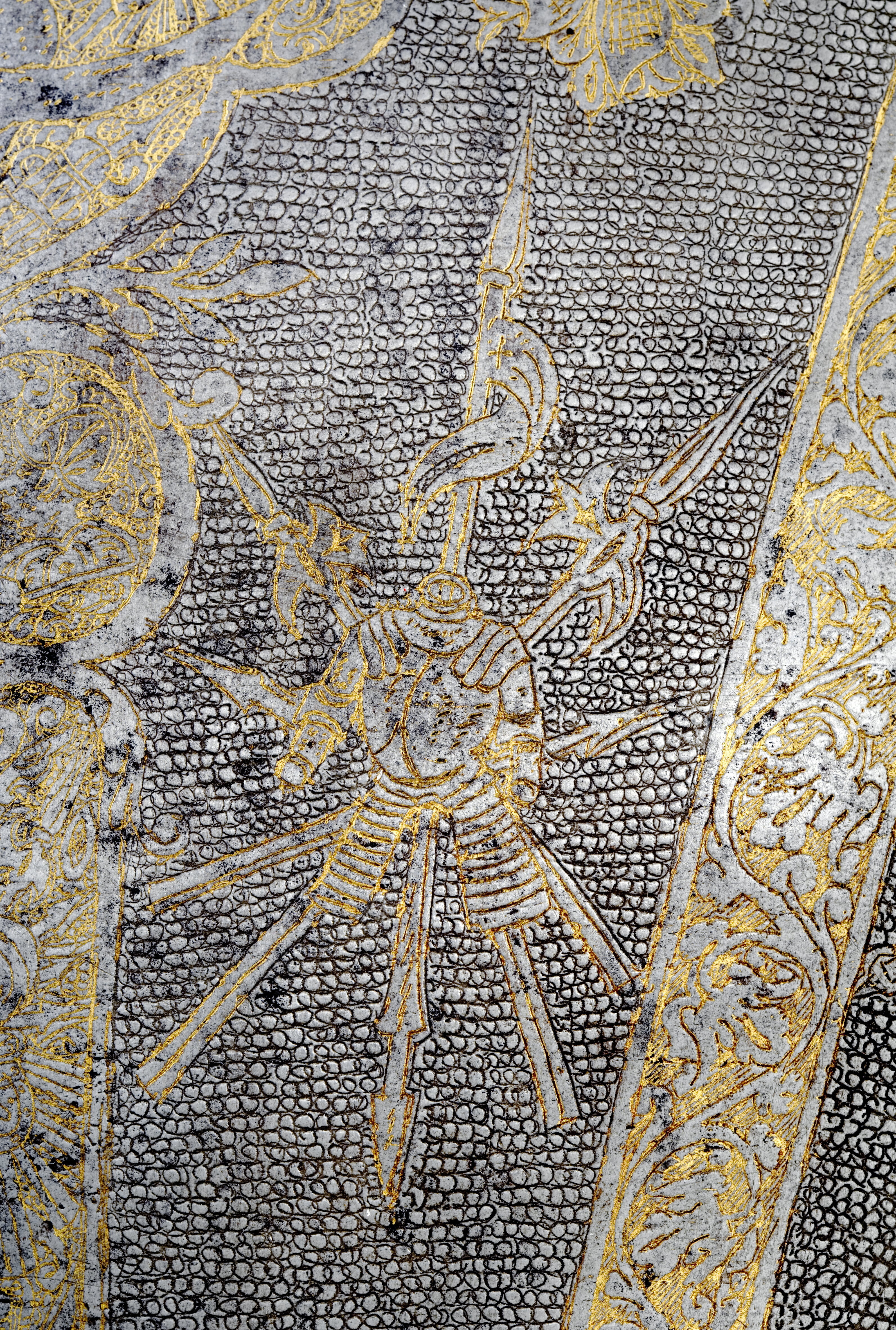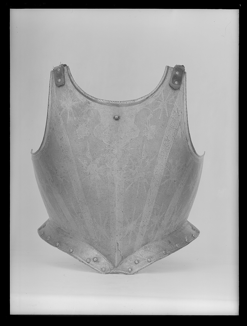 - Konung Erik XIV rustning af jern, etsad i ornementer och förgylld, består af: