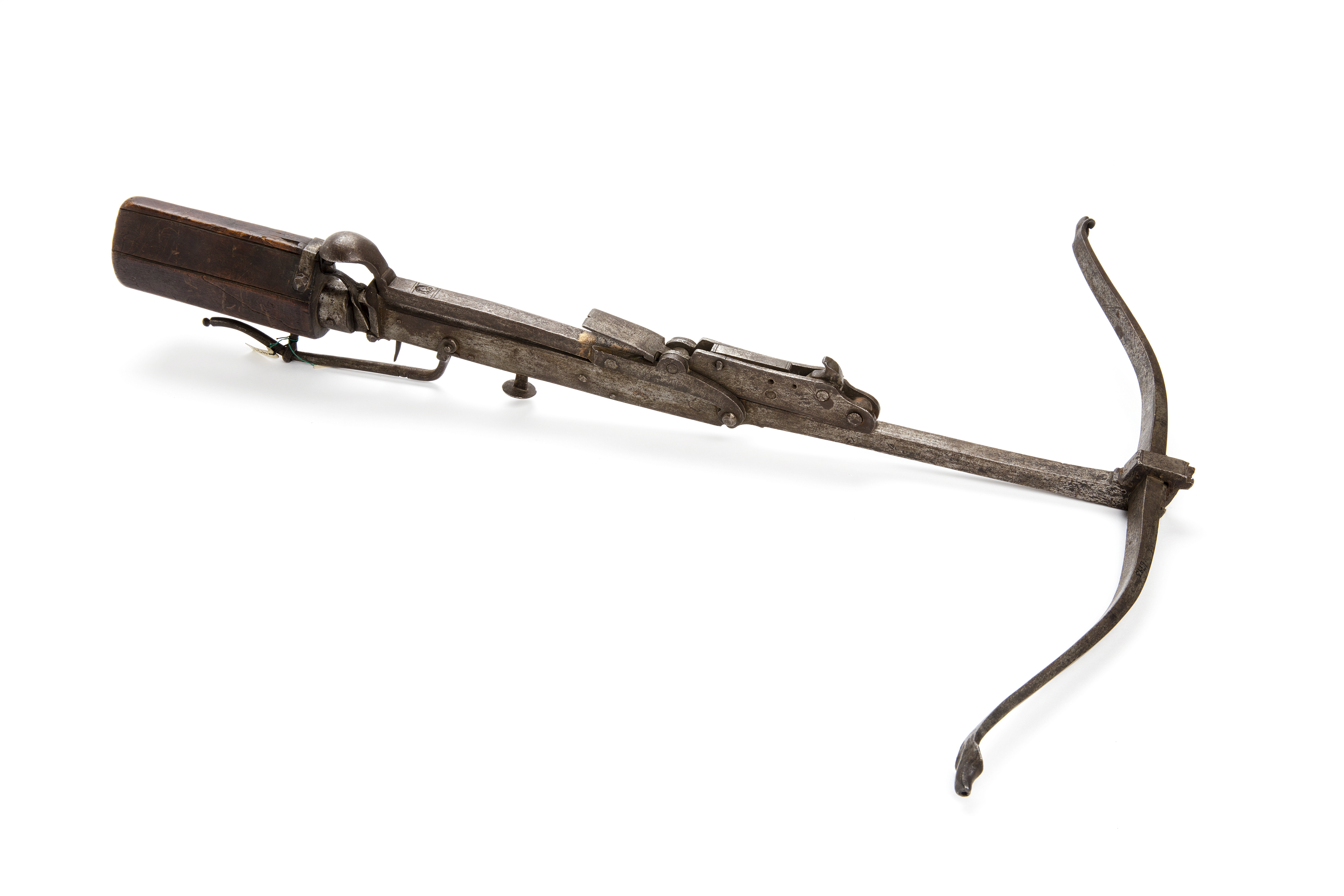 Båge av stål, fäst med kil i stockens framända. Lås i låshus av två låsbleck friliggande på stockens ovansida. Lås med snälltryck som spännes när man trycker på en rund knapp på stockens undersida framför varbygeln. Nöt av stål med stränghållare. Vid låshuset och framstocken är en spänninrättning med hävarm av stål fäst med stort runt välvt handtag. På spännarens översida stämpel i form av ekorre (jfr Stöckel nr 6415-6417). Stock av stål med kolv av brunt trä. Kolv av tysk typ. På anslaget märke efter oval inläggning. På framstocken bakom låset högt rektangulärt fällbart sikte. Varbygel av böjd, rund stålten.
