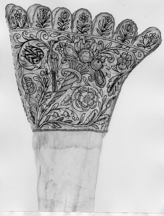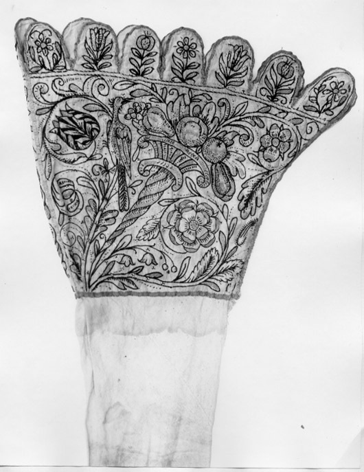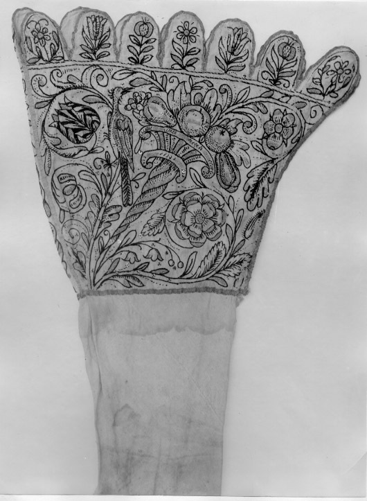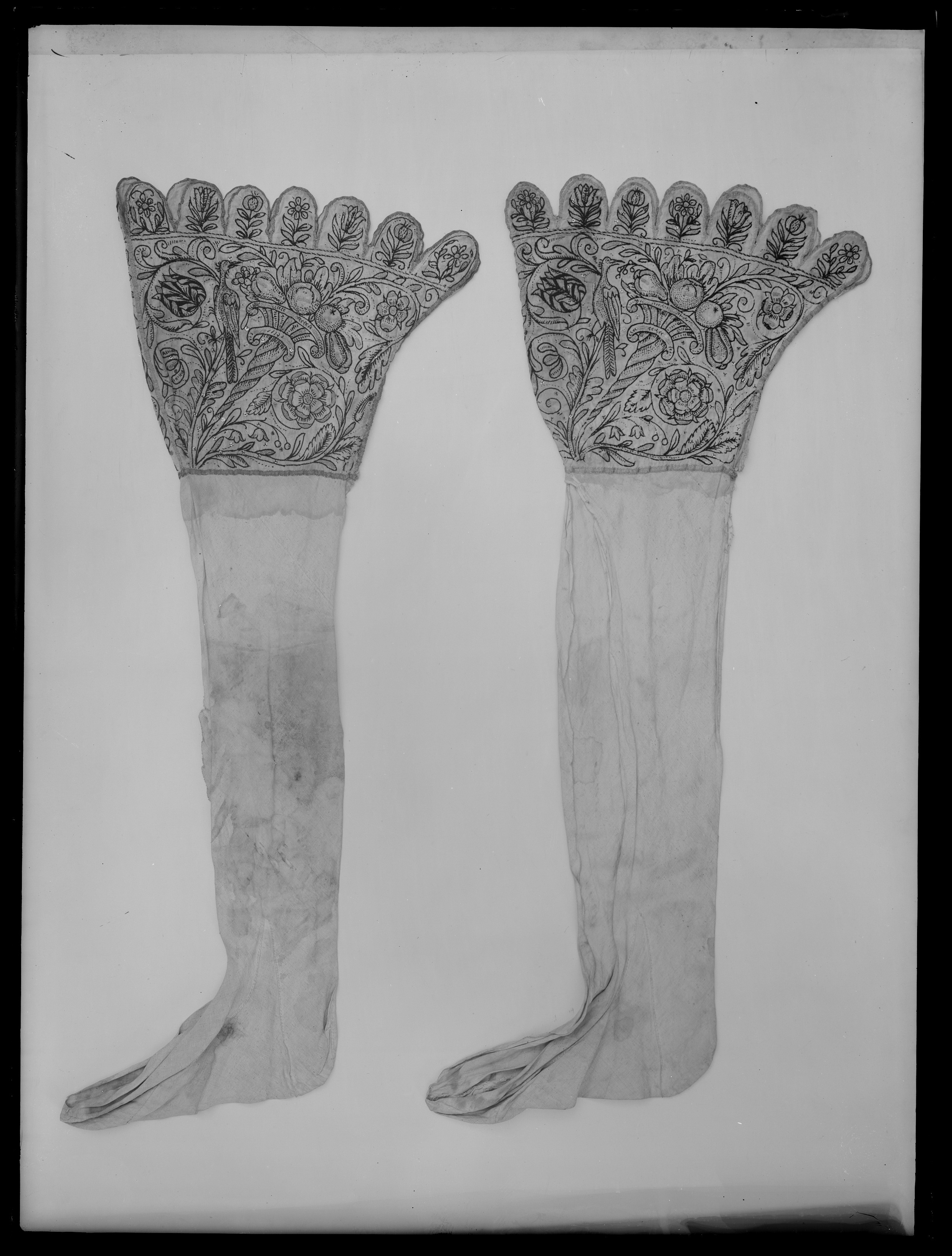 Strumpa sydd av tuskaftsvävt linne, trådtäthet 37x37 per cm2. Tillskuren i fyra delar: två kragstycken, ben och fot, som är hopsydda med efterstygn. Kragens övre kant avslutas med 14 flikar formade som bågar. Formen påminner om reticella-spetsens bågformade kanter. Den är fodrad med ett grövre linne som skyddar broderiets baksida. Kragens höjd är 28 cm och dess övre omkrets 68 cm. Broderade i svart silke och guldtråd, huvudsakligen i stjälkstygn. Motivet är lika på kragens båda sidor. Huvudmotivet är ett ymnighetshorn med frukter som äpple, päron och druvor. Vid sidan av hornet en fågel. Den återstående ytan täcks av slingrande blad och stjälkar samt blommor som tulpan, ros och liljekonvalj. På varje flik på kragen är en liten blomma broderad. Motiven är dekorerade med guldtrådar (lan på silkekärna) som sytts i flätmönster. Över sömmarna och kring den övre kanten ligger ett slätt guldband. Broderiet överensstämmer med den engelska typen av broderi med svart tråd som man kan se på linneplagg från sent 1500-tal och tidigt 1600-tal. Strumpans ben respektive fot är skurna på snedden för att ge bättre elasticitet och passform. Benstycket har en liten triangulär skarvbit placerad vid mittbaksömmen uppe vid kragen. Foten är skarvad framme vid tån. Första gången omnämnda i Klädkammarens inventarium 1661 bland de kläder som "Sal. Kongl. Maij:t hade oppå sigh tå han blev dödh An:1632". Strumporna bär spår av att ha fläckats med blod, men det är inte helt klart om strumporna bars av Gustav Adolf under själva slaget i Lützen, eller om de möjligen kläddes på liket efter balsameringen. Det förra alternativet verkar mest sannolikt, eftersom det trovärdiga kopparsticket av Gustav Adolf på lite de parade återger ett par spetskantade strumpor i stövelkragarna. Strumpor/Stövlingar inv.nr 31124 och 31125 hör ihop och bildar tillsammans ett par.