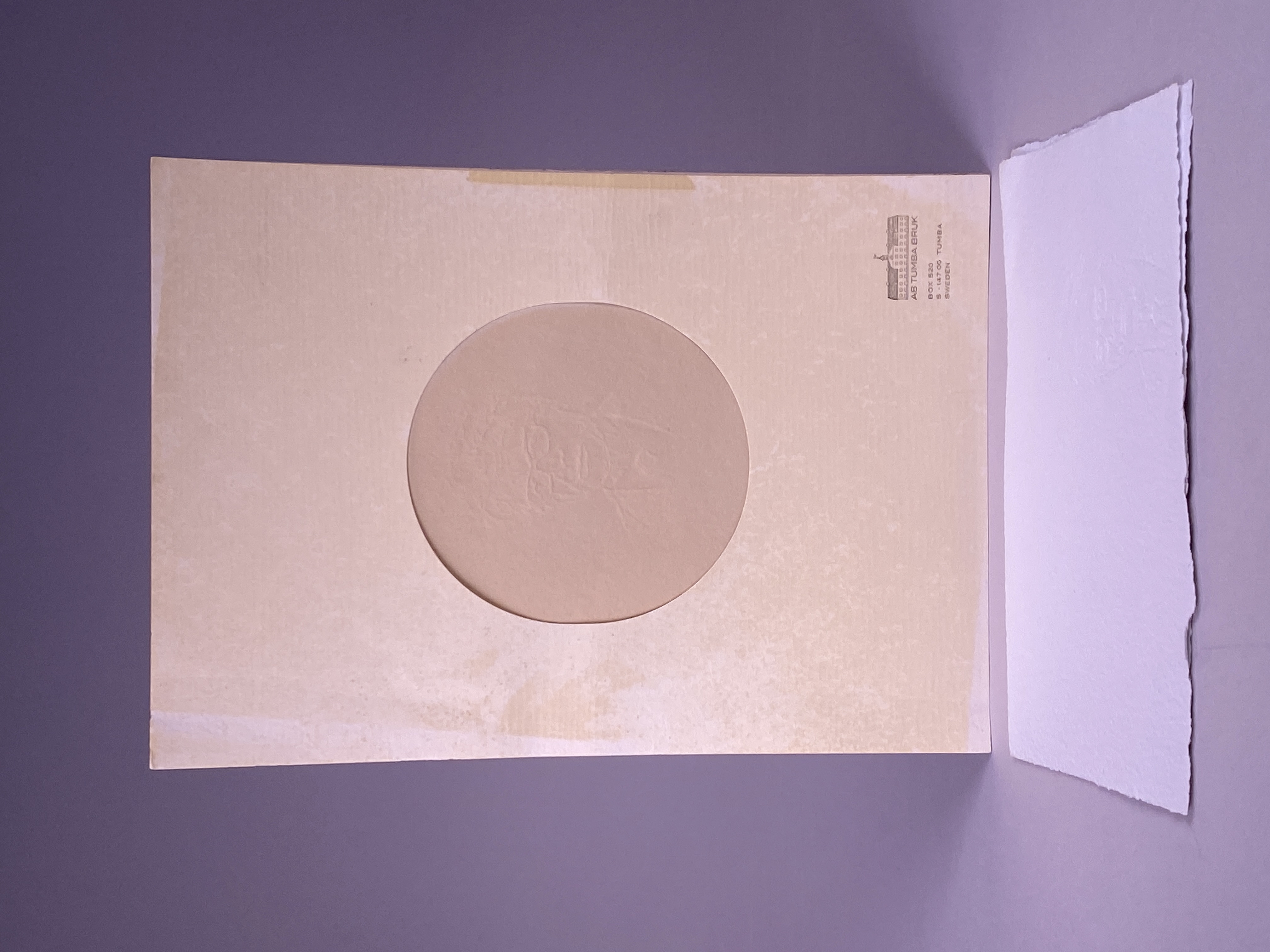 En beige mapp i dåligt skick innehållande tre handgjorda pappersark, alla tre med vattenmärke föreställande ett mansporträtt. Två papper är lösa, medan ett är limmat fast i en ram. Märkningar: Tumba bruks logotyp samt adress finns på omslaget.