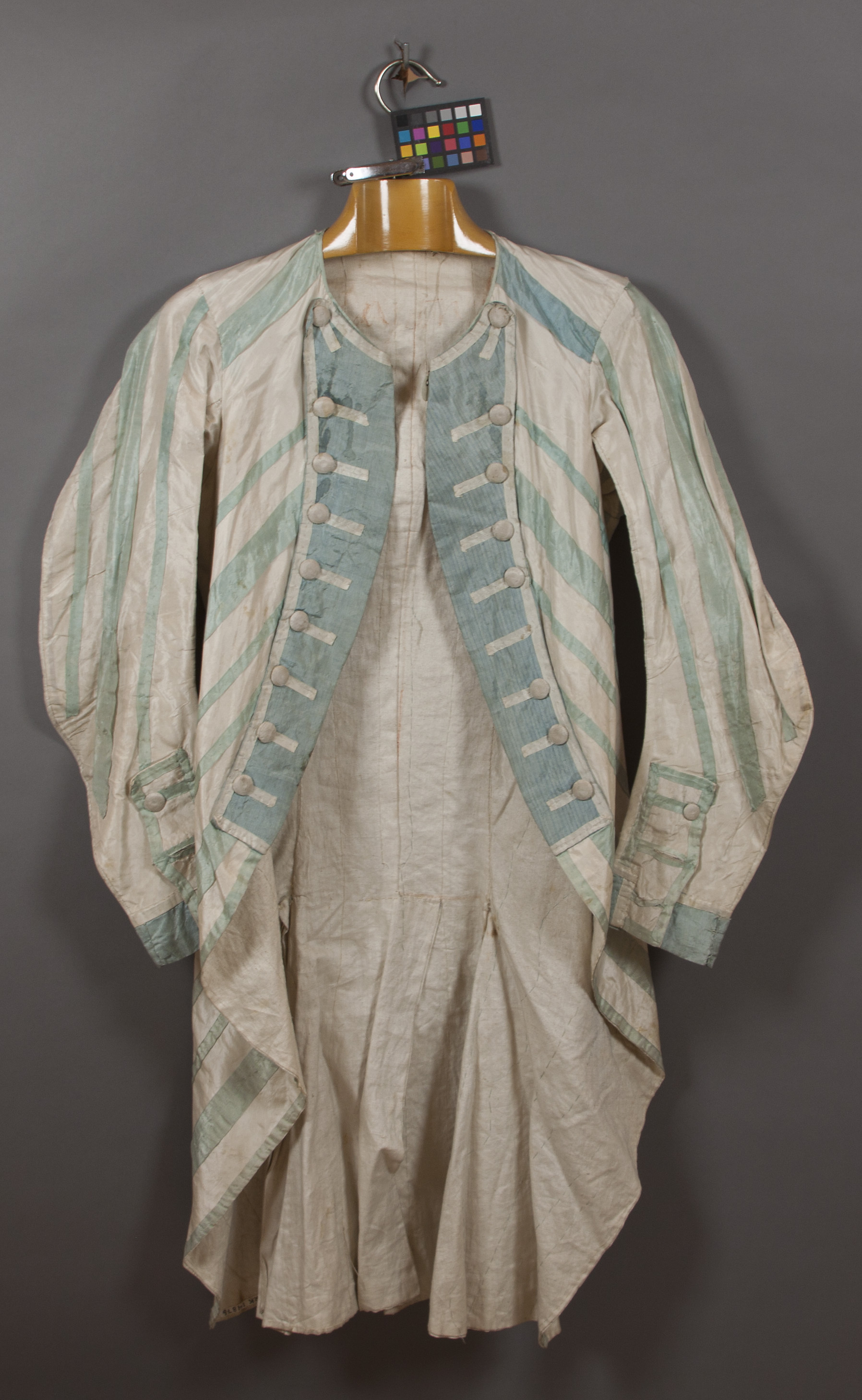 TILLÄGG: Upptagen som "En Catalans klädning" under rubriken "Ballet och Pantomime Kläder" i inventariet över slottsteatern på Rosersbergs slott [1806]. Förteckningen ingår bland Karl XIII:s bouppteckningshandlingar. Sammanlagt nio manliga dansdräkter av detta slag har bevarats i Livrustkammaren. Dräkterna består av rock, väst och byxa. En mössa av vit taft "randad med ljusblå taftsband" har ursprungligen hört till, men är idag inte bevarad. Plaggen följer det sena 1700-talets snitt, men har också flera drag typiska för teaterkostymer som de påsydda ränderna och den falska knäppningen. Regionala karaktärer (som "katalaner") ingick vanligtvis i den komiska dansgenren i tidens pantomimer och baletter. Den vita och blå färgen hänvisar dock inte till någon specifik nationell eller regional dräkt, utan snarare till den typiska framställningen av herdar eller bybor på den franska scenen. I italiensk commedia dell' arte refererar de blå ränderna till karaktären Mezzetino, förebilden för Molières Scapin. Flera av de katalanska dräkterna är märkta med namn som överensstämmer med de hovmän som spelade en grupp sjömän, Castellans, i divertissemanget "En venetiansk fest" på Stockholms slott 1777. Det är därför möjligt att benämningen på dräkten är en felskrivning. Hela arrangemanget var utformat av Gustav III som en överraskning för hans mor, Lovisa Ulrika. Bland annat uppträdde här två grupper med sjömän, eller "Nicolettes et Castellans" som Gustav III skriver. I detta sammanhang är det logiskt och troligt att man vid utformningen kan ha inspirerats av kostymerna från commedia dell'arte-figurer. Utökad dokumentation utförd i samarbete med fil.dr. Petra Dotlačilová.
