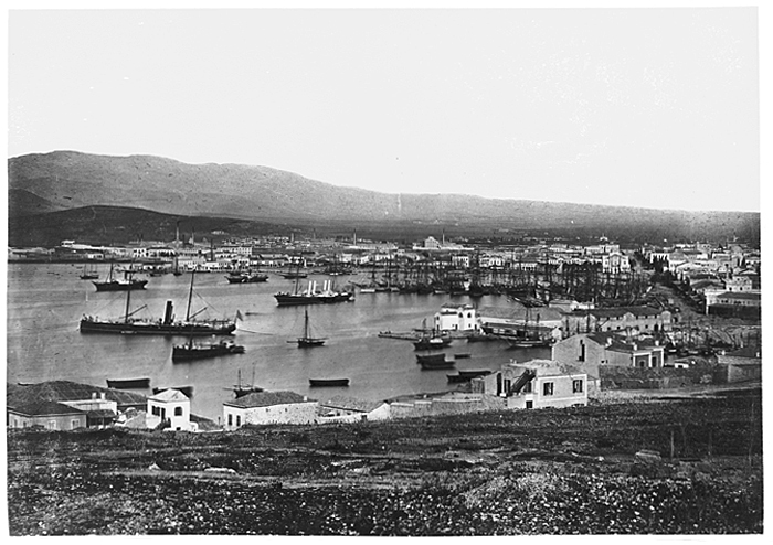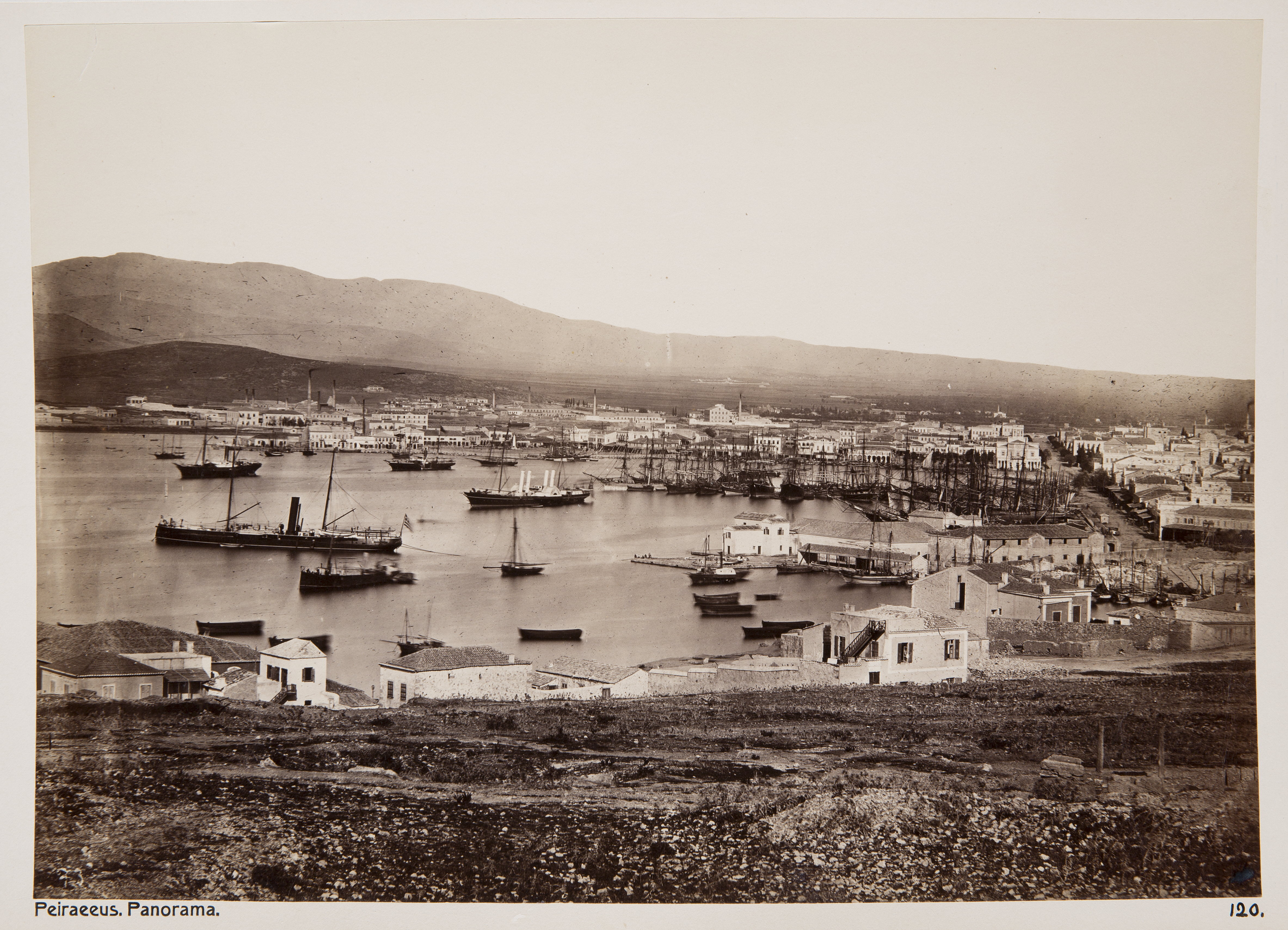 Panorama över Pireus, Grekland. Text på originalet: Piraeus. Panorama. Foto från resa genom Grekland, Makedonien och Serbien, 15 mars-6 juni 1896. Fotografierna LXVI:K.18.-147. är köpta av Wilhelmina von Hallwyl, f. Kempe på Korfu samt i Patras, Nafplion, Aten, Thessaloniki och Belgrad. Med på resan var maken Walther von Hallwyl och fröken Ida Uhse. Uppgifterna kommer från Ida Uhses reseanteckningar.