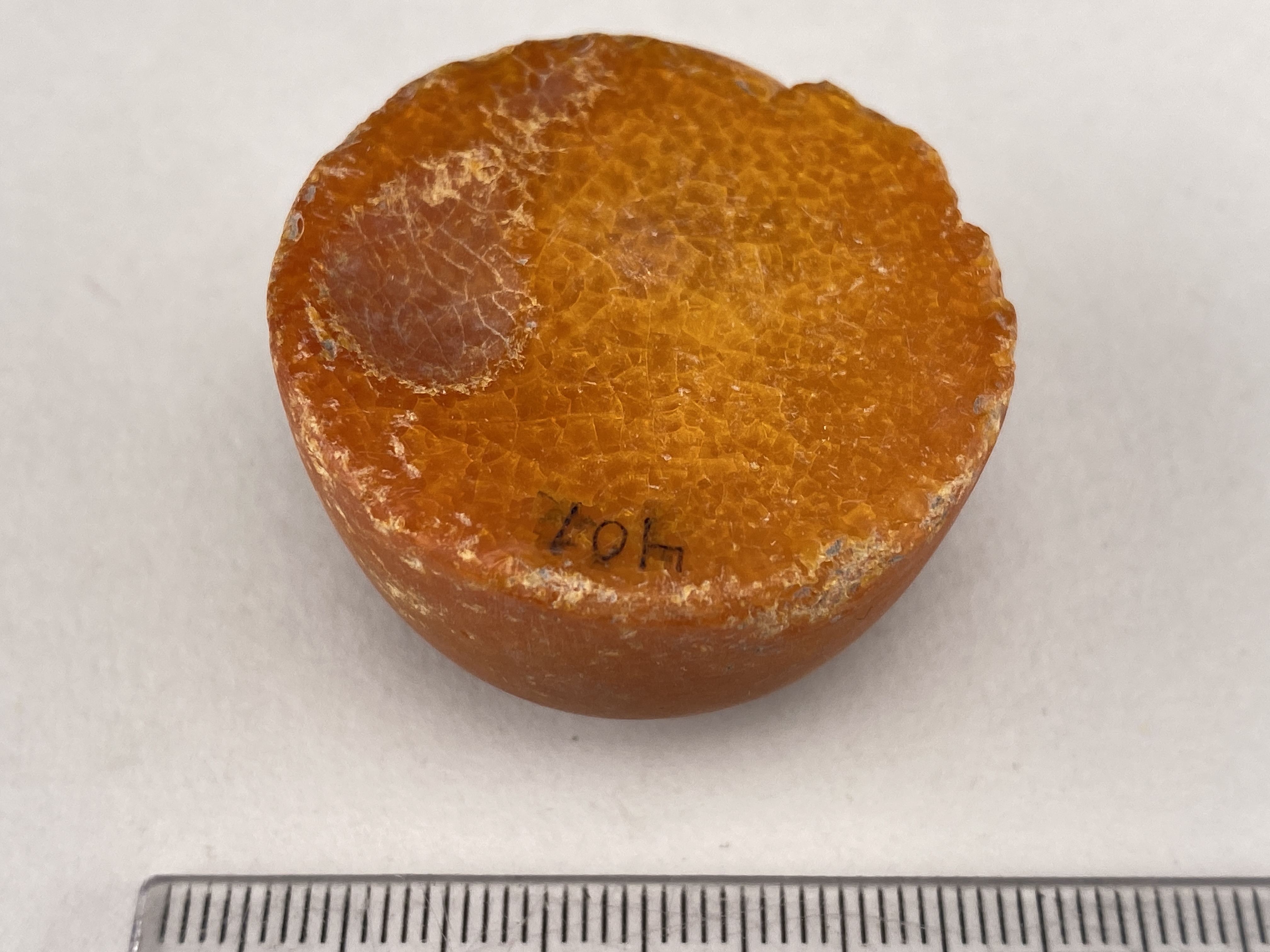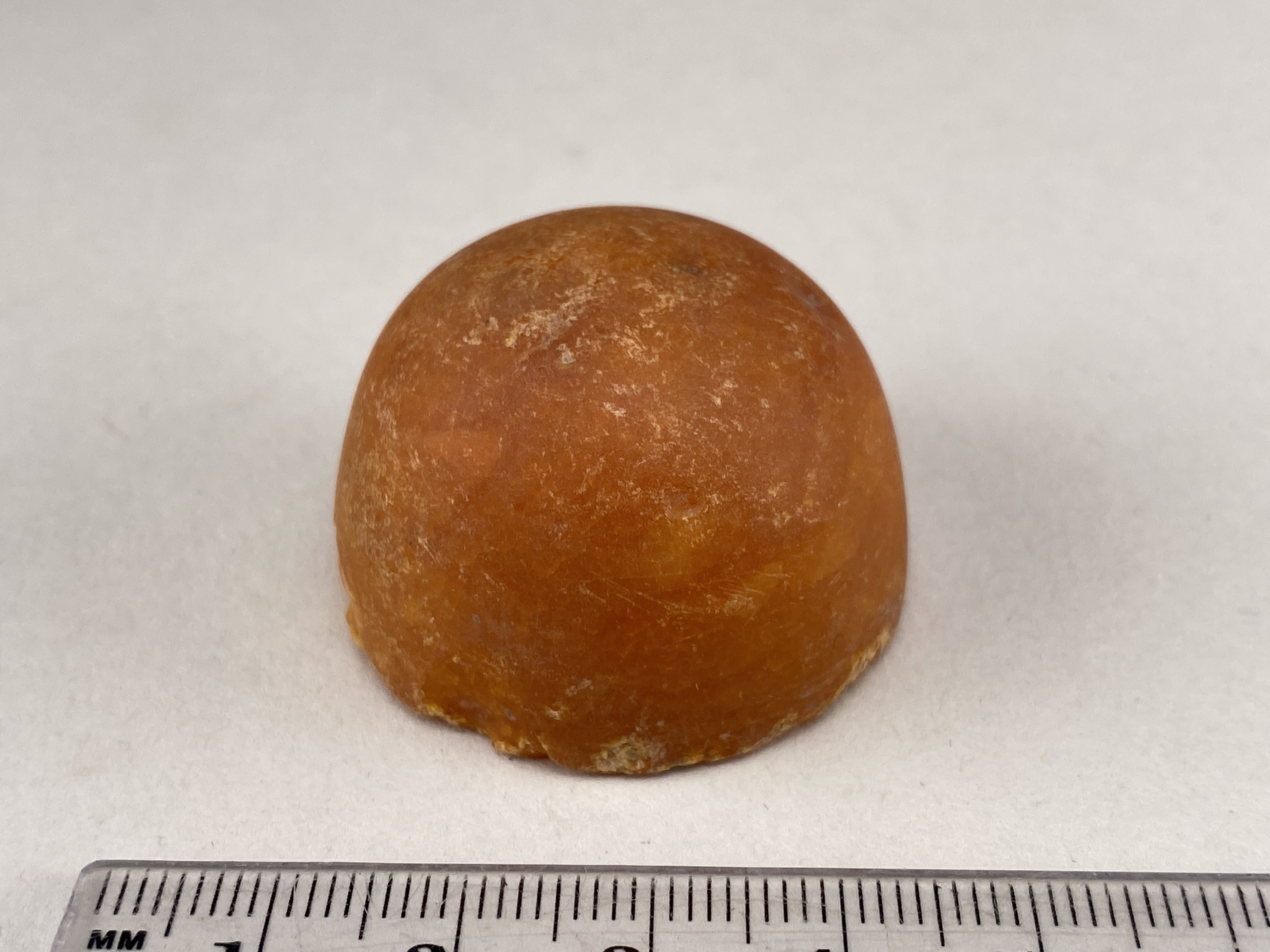 välbevarad spelpjäs, halvsfärisk. Mindre nagg längs kanterna