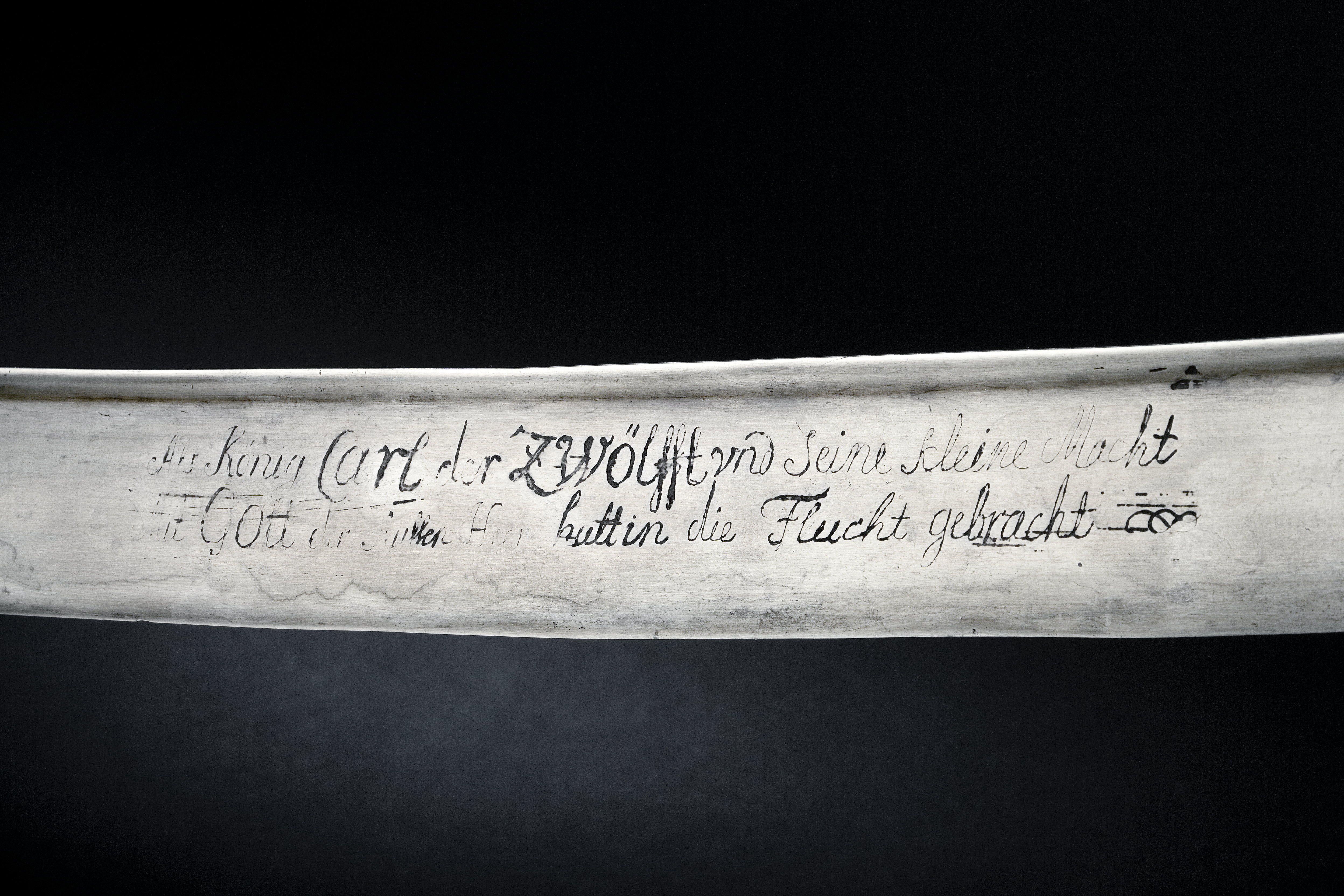 Kavel av brunt, hårt lövträ (möjligen valnöt) snidat på båda sidor med vinkelställda förhöjda dubbla ränder, utgående från en mittås; överdelen breddad, framtill näbbformigt utdragen, översidan runduddad; utmed mitten av kavelns framsida, överdel och baksida en sammanhängande 5-6 mm bred infälld slät list av stål. Utmed mitten av kavelns ut- och insida har ursprungligen funnits en rad av tre stift med runda silverhuvuden (nu återstår endast ett på vardera sidan). Fäste korsformigt. Kryss med styrskenor och parerstänger av slätt stål, parerstänger korta, nedåtböjda. Främre parerstångens ytterände med ojämnt rund avslutning. Klinga något böjd, kraftig, eneggad med tvåeggat spetsparti, rygg förtjockad, ryggsidan plan. På starka delen av klingan etsad inskription i skrivstil med latinska bokstäver; på klingans insida "Als König Carl der Zwölfft und seine kleine Macht Mit Gott der Russen Heer hatt in die Flucht gebracht" och på klingans utsida spår av en numera bortslipad text lydande (enligt inventarium 1867) "Dis Czaarens Schwerd Furst Croij an Eccard musste geben beij Narv als Stenbock lees auff seine bitt ihn leben".