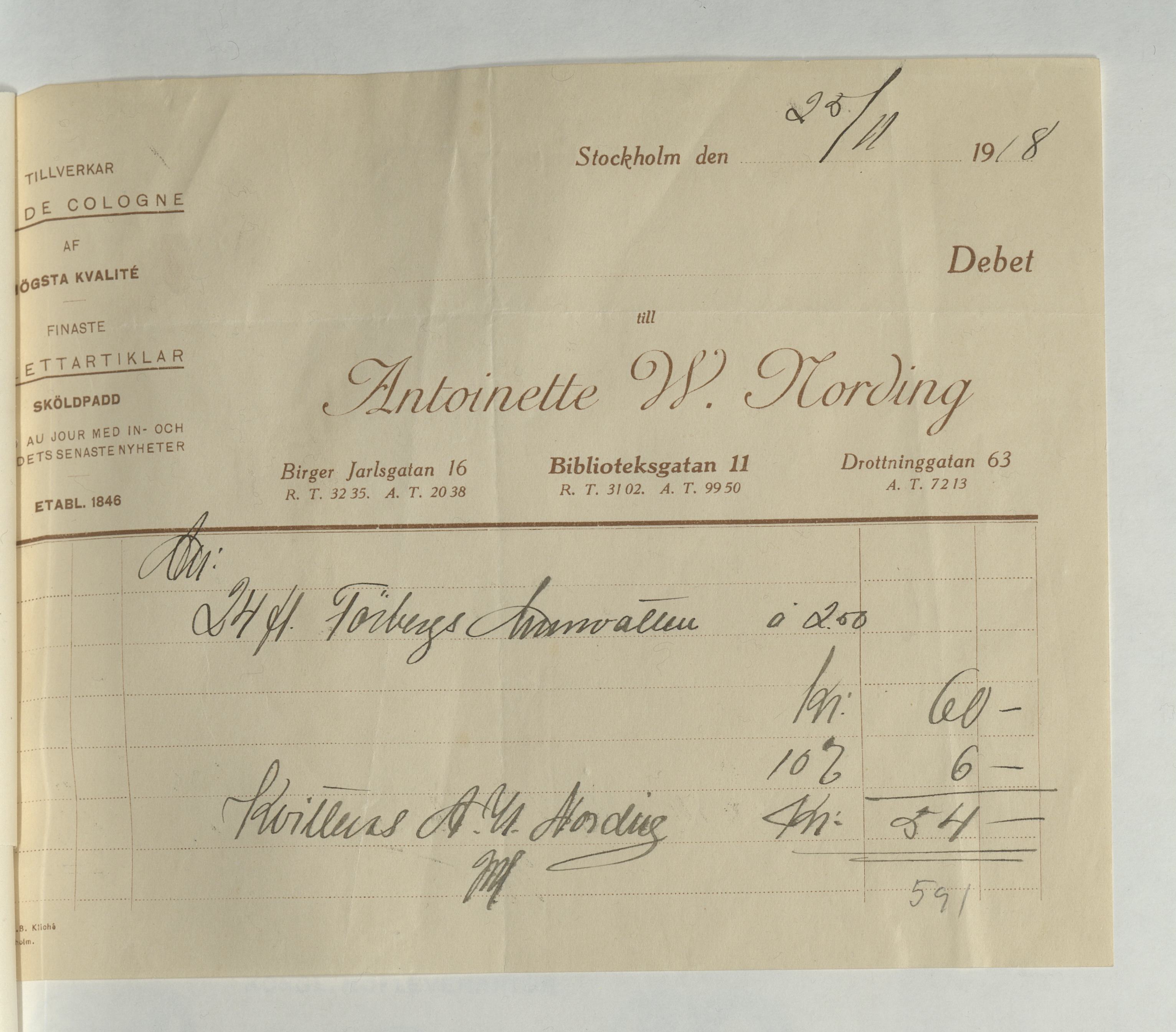 Kvitto från Antoinette W. Nording. Stockholm, 1918.