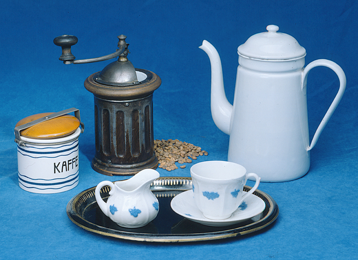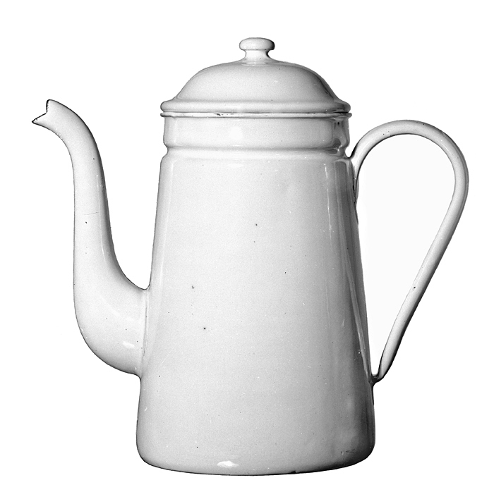 KAFFEPANNA (brygg-) Av vitemaljerad stålplåt. Konisk, med handtag, pip och trycklock samt plan botten. Kring mynningen en utstående stav, nedanför denna en kälformig inknipning. Handtag av en flackstavigt hopvikt plåtremsa, bågformigt utsvängd. Pip S-formad, avsmalnande uppåt, med något kluven mynning. Lock kupigt, med stavformig kant, hög sarg och liten tryckt hjässknopp Höjd med lock: 24,5 cm.; utan lock: 19,9 cm.; diameter: 13,5 cm. Lock, höjd: 5,7 cm.; diameter: 10,8 cm.