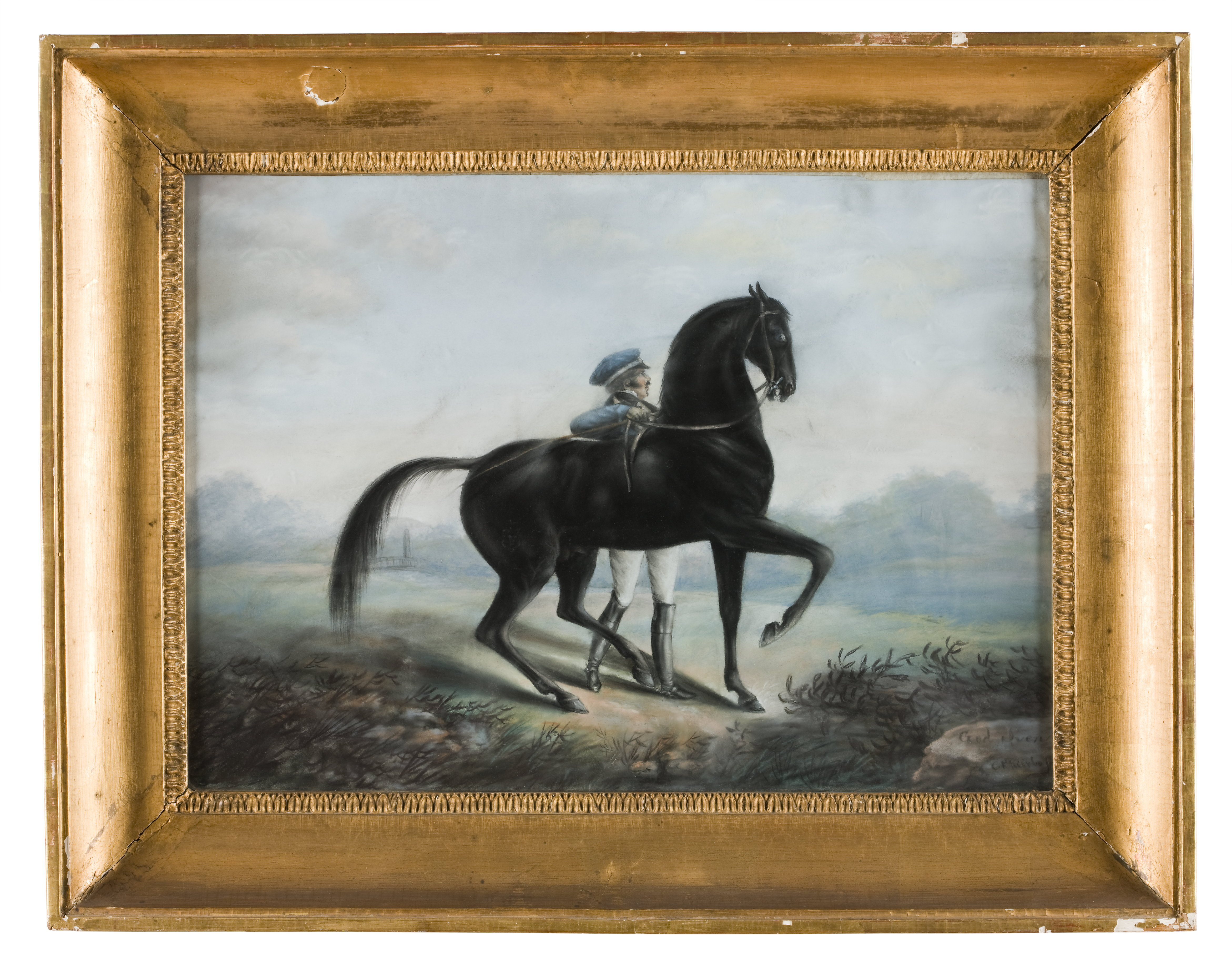 Pastell på pergament. Svart häst stående åt höger, hållen av jockey. I bakgrunden välvd bro och trädkuliss. Inskrift "God Sven". Pannå som bakre stöd klistrat med franskt tidningspapper (Le Figaro) från 1880-talet. På pannån skrivet med röd krita "No 237 JM", med vit krita "Wenster om Hebe (?) . . . 15 236", med blyerts "N 12". Förgylld, profilerad ram med pastellagelist, bredd 80 mm. På ramens baksida skrivet med blyerts "No 14" m.m., med krita "18" m.m. Glas. Signatur: "C F Kiörbo fe (c)". Godsven 184 svenskt halvblod, född 1805 efter Favorit undan Kaja II, efter Godsven 84. Avelshingst på stuteriet i Strömsholm 1810-1830. Mätte 151,5 bakom sadeln. (källa: Waxberg, Henry: Strömsholms stuteri, Borås 1964)