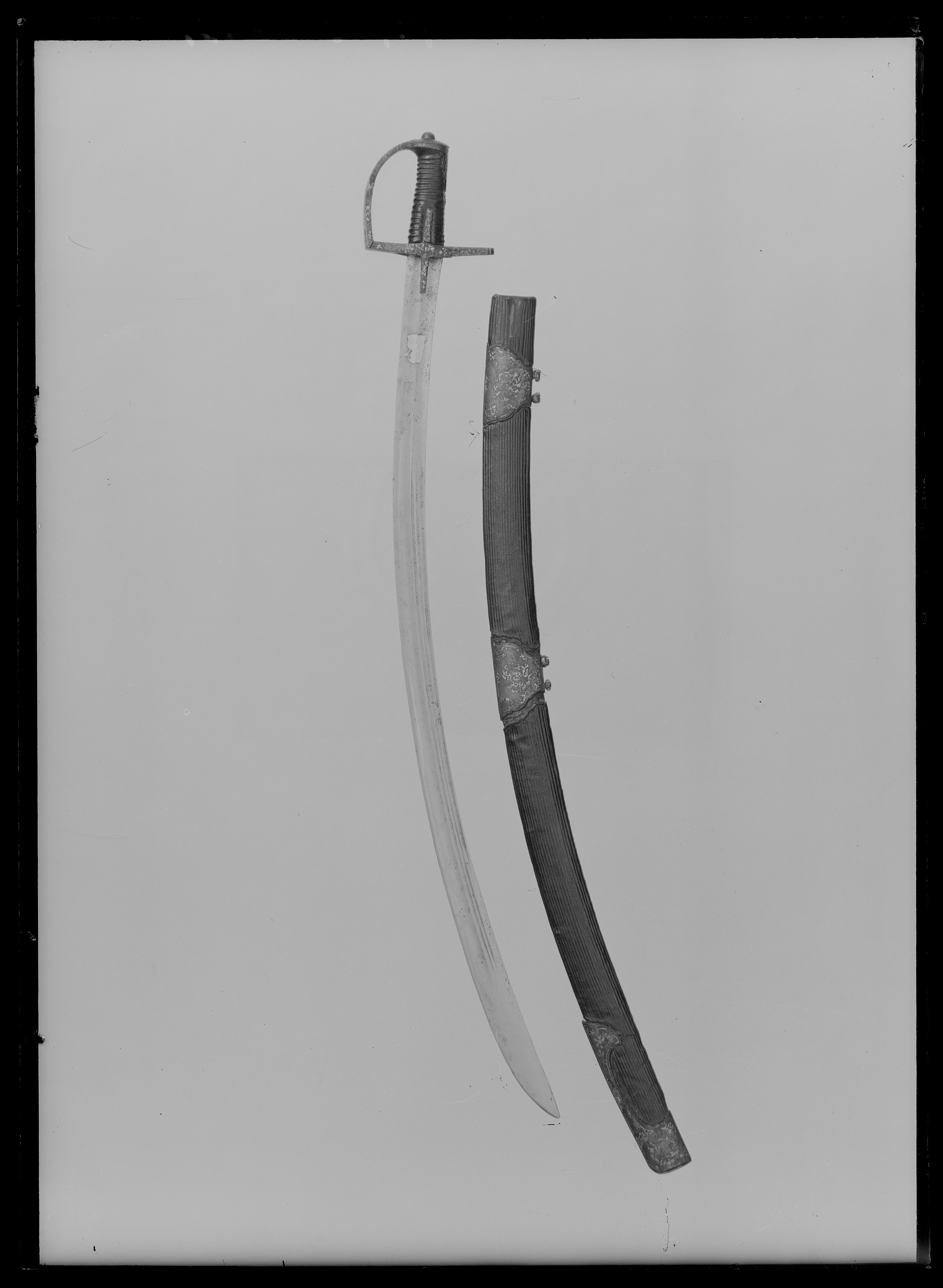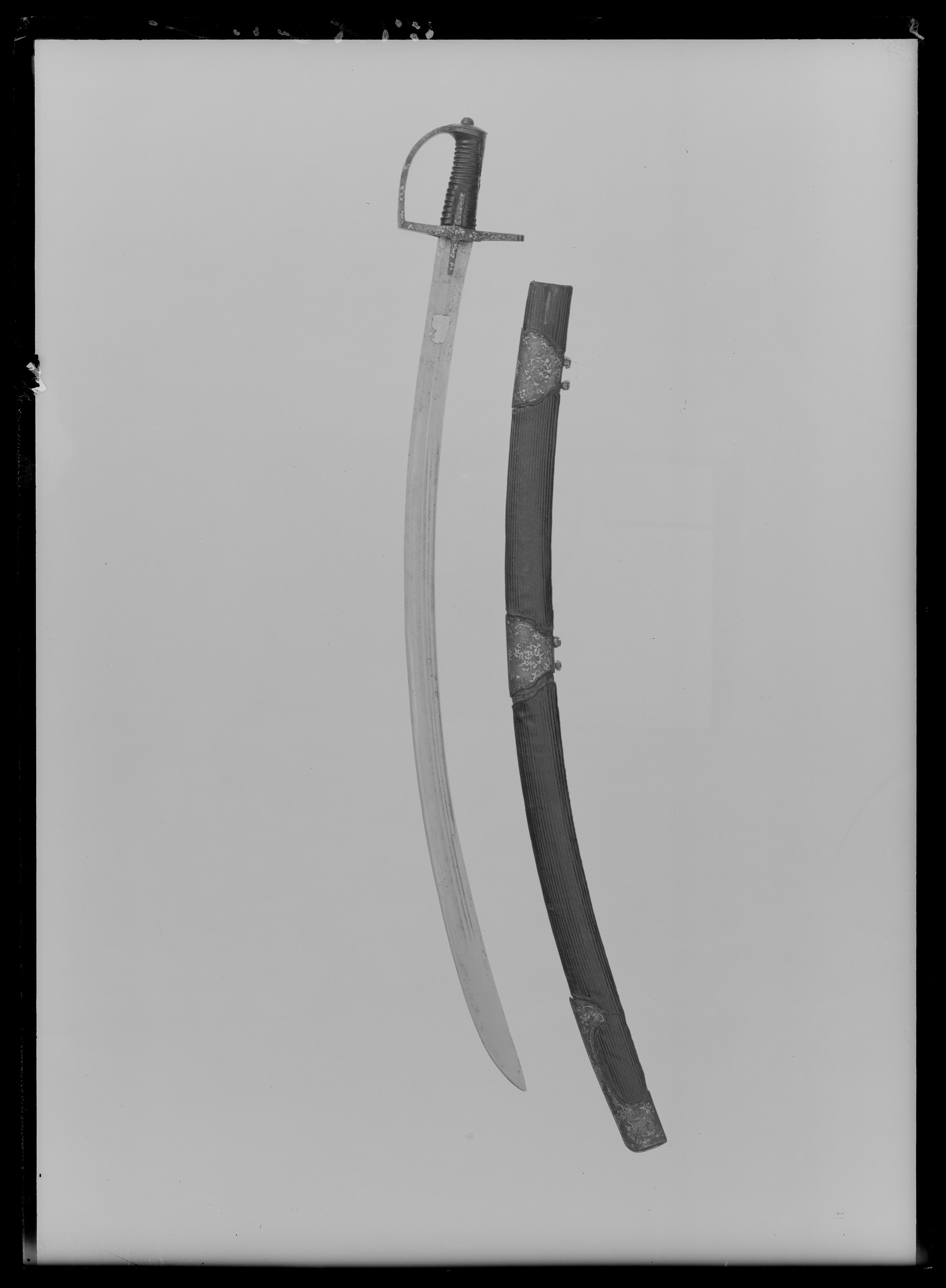Fäste av stål med påslagna rankornament av guld. Kappa baktill utdragen i en profilerad spets. Handbygel platt med vidgat mittparti, rätvinkligt övergående i främre parerstången. Styrskenor, l: 80 mm. Kavel överklädd med svärtat läder med 15 tvärgående räfflor. Klinga böjd, eneggad till det 195 mm långa, tvåeggade spetspartiet. På starka delen två breda, grunda hålkälar. Den på ryggsidan övergår i tre hålkälar. På utsidans starka del utmed ryggsidan otydligt etsad och förgylld: "STEFANUS (B)ATORI". Härintill en bröstbild av kungen i påslaget guld. På insidan av starka delen likaså påslaget i guld en vapensköld med tre vargtänder över varandra på heraldiskt v sida (sinister). Skölden krönt av en öppen krona.