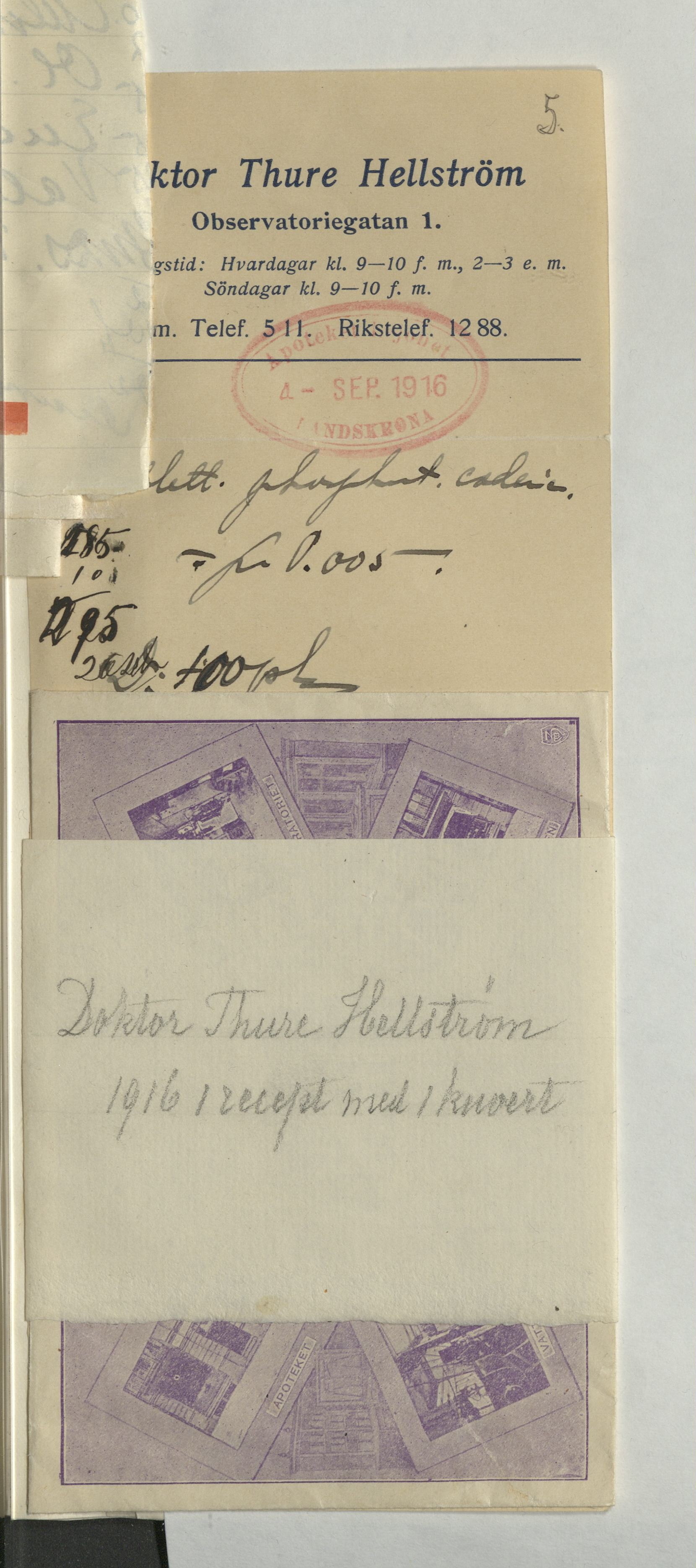 Utdrag ur katalogverket: "Hellström, Thure, professor, öfverläkare vid Epidemisjukhuset. 1916 — 27."