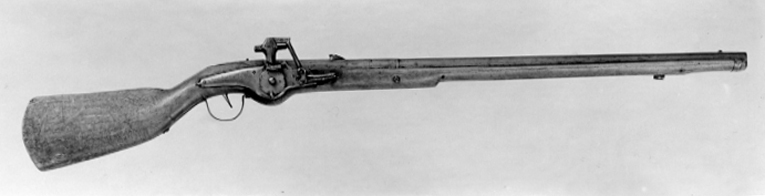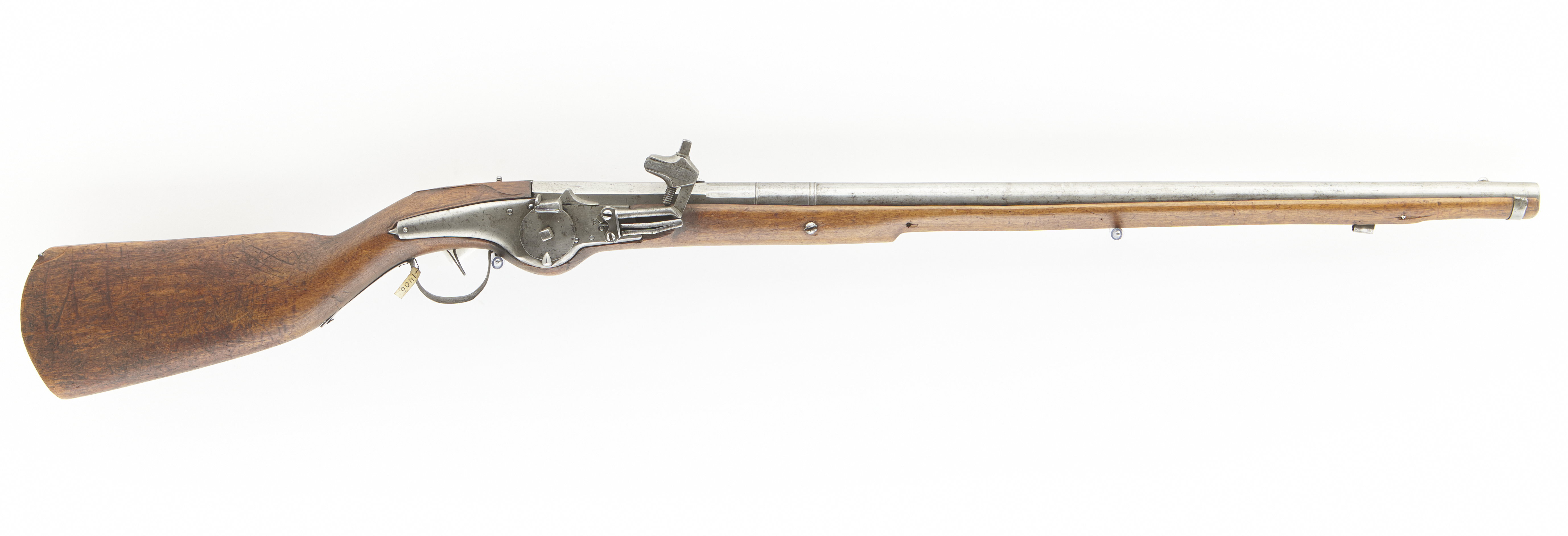 Rund, slätborrad pipa av stål, åttsidig kammare med fasade kanter framtill, därframför ett 39 mm långt parti omgivet av en ring baktill och en profilerad ring framtill (ej parallella). Rakt, baktill tvärt avskuret svansskruvblad. På kammarens ovansida graverat: N.15, därbakom en kronstämpel. På v. sidofas en kvadratisk stämpel I H (I H?). På undersidans v. sidofas en djupt inslagen, smal, rektangulär stämpel (I?), på mittfasen en kronstämpel. Riktmedel: Inlaxat, hjärtformigt ståndsikte och spolformigt stolpkorn av stål. Fästning: Två häften. Pipan fäst med krysskruv underifrån (främre varbygelskruven, ursprunglig?, platt huvud!), samt ett pipstift (det bakre saknas) av stål. Hjullås av västeuropeisk typ med välvt låsbleck, spetsig, försänkt bakspets, framför hjulet en stämpel H med ett inskrivet S(?). Utanpåliggande hjul fäst med en åsad, droppformig studel kl. 6. Fängpanna med låg gavel och undersida med rundad kanter. Fängpannelock med rörlig arm, utan tryckknapp (enbart stoppfjäder). Hane med rak kropp, rundad ytterkant. Rak, fyrsidig hals, l: 27 mm, huvud med lös underkäke, välvda över- resp. undersidor, kubiskt skruvhuvud med rundad ovansida. Hanfjäder (bräckt) med rundade kanter, omvänt B-formig hanstudel med kantlist mot fjädern. Insidan välbearbetad. Fästning och avtryckare: Tre låsskruvar. Avtryckare omvikt till fjäder. Helstock av brunbetsad al. Kolv med rak, smal, plan rygg och rundad undersida, kindstöd med skuren bladvolut framtill och 95 mm lång, plan yta på nederkanten. Svängd kolvände, samma övergång vid häl och tå. På kolvänden nertill inskuren + och 3 streck, mellan främre och mellersta låsskruvhålet på v sida G H S (skrivstil), h 17 mm. Framför rundningen nedanför låset inristat namnchiffer S L, A R(ligatur) samt XXX. Kolvens båda sidor repig och kan innehålla flera ägarmärkningar, på h. sida en stor, A-liknande figur, h: 40 mm), Beslag av stål, kolvkappan saknas. Smal, bandformig topprörka(mellanrörkan saknas), smalt, bandformigt näsband. Sidbleck - karbinstång med karbinring, d: 29 mm (går ej över sidblecket), sidbleck för de två bakre låsskruvarna, platta med nederkanten filad i två markerade, rundade flikar, bakre delen närmast rektangulär. Karbinstången framtill fäst med skruv genom framstocken, platta med rundad framände och därbakom en nästan rätvinklig spets. Bandformig varbygel med baktill rundad bakre arm, urspr. fäst med två spikar (den främre saknas), framtill fäst med krysskruven. I låsurtaget möjligen inhugget I C.
