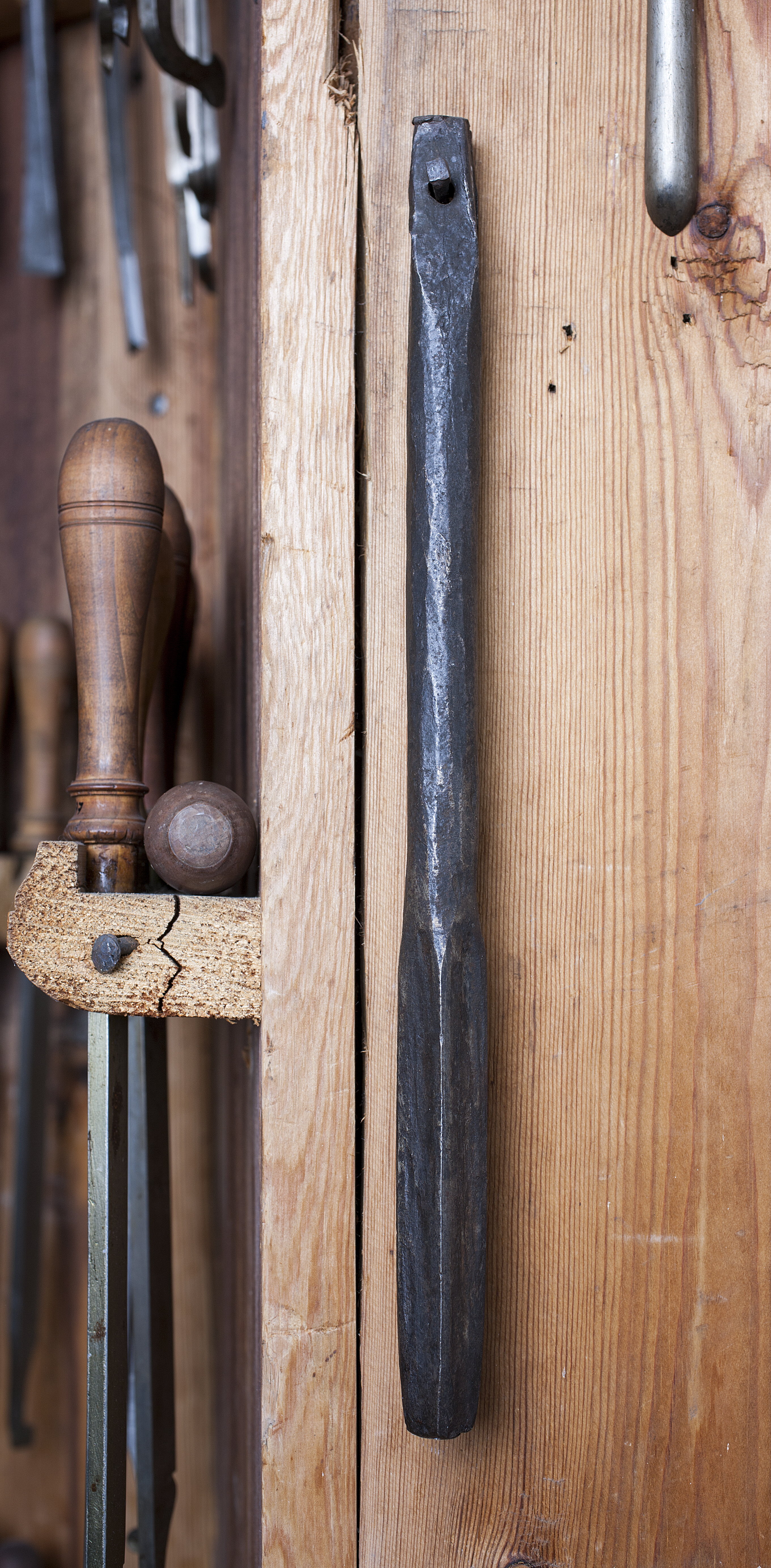 Halvfabrikat. Fyrsidig med runt, upptill fyrsidigt skaft, överst med runt hål. Skär ej utfilade i de fyra eggarna.