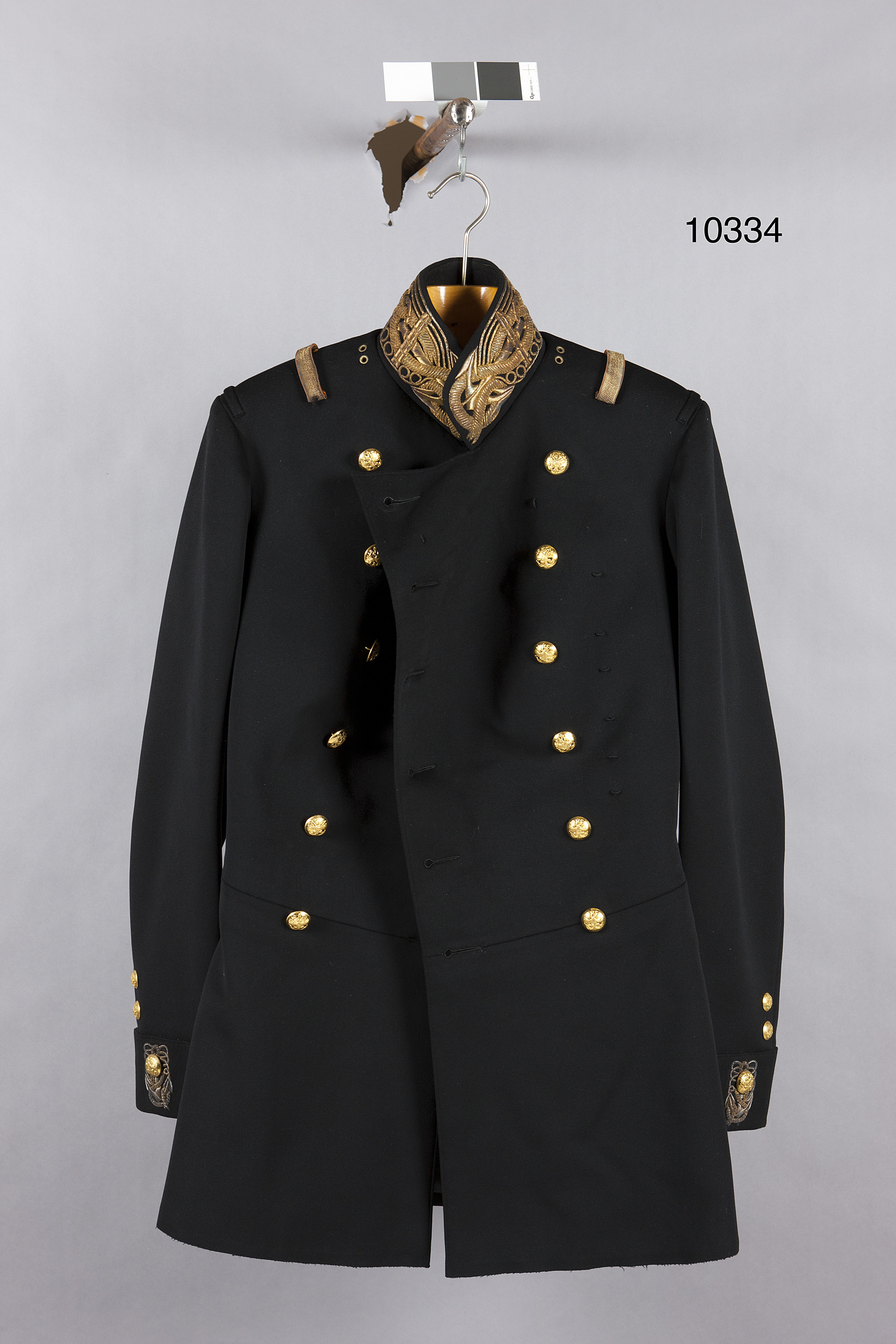 Ryggl: 500 mm, skörtl: 340 mm, ryggb: 385 mm, 90 mm, ärml: 685 mm, kragh: 70 mm, framl: 885 mm, framb: 300 mm, midja: 820 mm Kavaj av svart kläde, tvåradigt med ståndkrage och tillskärning med livsöm. 12 knappar med skålla av förgylld mässing med ryska dubbelörnen i pressad relief 22 mm. På baksidan text: "ASSMANN 1 SORT". På kragens utsida reliefbroderi av guldtråd i formav liggande ankare med slingrande tåg och linor. På axlarna närmast kragen två mässingsskodda hål, därefter epålettslejfar av guldtråd och närmast axelsömmen en smal slejf av kläde. Ärmar med 80 mm brett uppslag med på utsidan två broderade ankare med var sin knapp, där ovanför utmed sidsömmen två mindre knappar d: 18 mm. Delat skört, 90 mm från kanten veck med insydda fickor, på vardera vid livsömmen en, och på fickan en knapp. På vänstra framstycket sju små hällor. Foder i livet av vitt kyprat siden, nedtill av svart atlas. Tillbehör: 6 lösa knappar, tre stora d: 22 mm, tre små 13 mm i diameter. På baksidan av en stor knapp, rysk text: KOPEIKIN // MAKSIM // 1 SORT // S. PETERSBURG. På en: 3 K OBSC OFICEROV MOSK. VOEN OKRUGA 1895, på den tredje: ASSMAN & SÖHNE LUEDENSCHEID. De små utan text. Knapparna förvarade i skörtfickorna).
