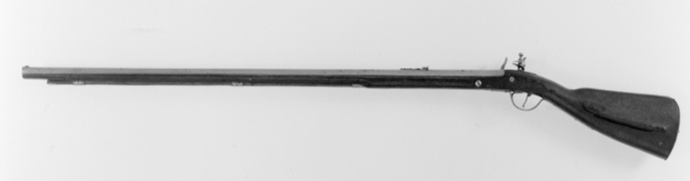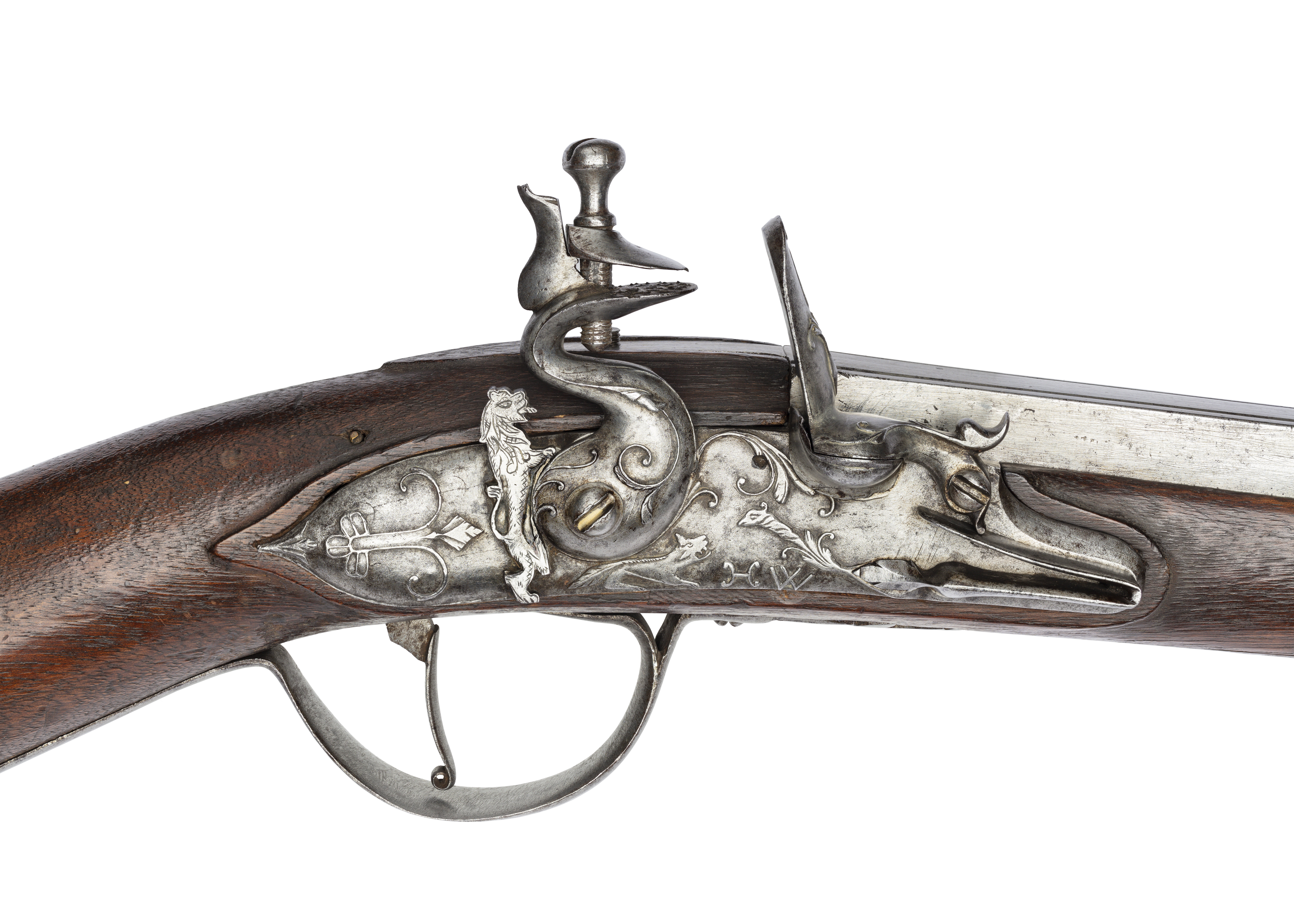 Halv kistpipa, främre delen åttsidig. 8 räfflor, godstjocklek: 5.5 mm. På kammaren punsat: "M W P B". Grovbearbetad undersida. Riktmedel: Klaffsikte med lång, bladformig främre arm. Inlaxat korn av mässing. Fästning: Pipan fäst med krysskruv underifrån samt tre pipstift av stål, det mellersta ersatt av en spik. Snapplås av flintlåsform med hakspänn, välvt låsbleck med dekor i stålsnitt: H W (jfr Stöckel nr 3165-3167), varg och rankor. S-formig, rundad hane med rankdekor. Lös överkäke, avbrutet fingergrepp, motstöd mot hanhalsen. Platt hake i form av ett lejon, graverade detaljer. Rundad fängpanna, eldstål med rundad överkant, rankdekor på ryggen och fängpannelocket. Eldstålsfjäder med treflikigt, fasetterat löv. Avtryckare med bakåt upprulladände. Brun helstock, fransk typ av furu (?). Rakt kindläge med snidat blad framtill. Beslag av stål, bakplåt med kort tunga över hälen, bakom bakplåten ett 145 mm djupt, runt hål täckt med vridbart stållock. Tre profilerade rörkor, spetsrörka med slät spets. Varbygel med kort främre arm, avslutad med flikigt blad, kluven framstolpe, lång, slät bakre arm. Tillbehör: Laddstock av trä, avbruten.