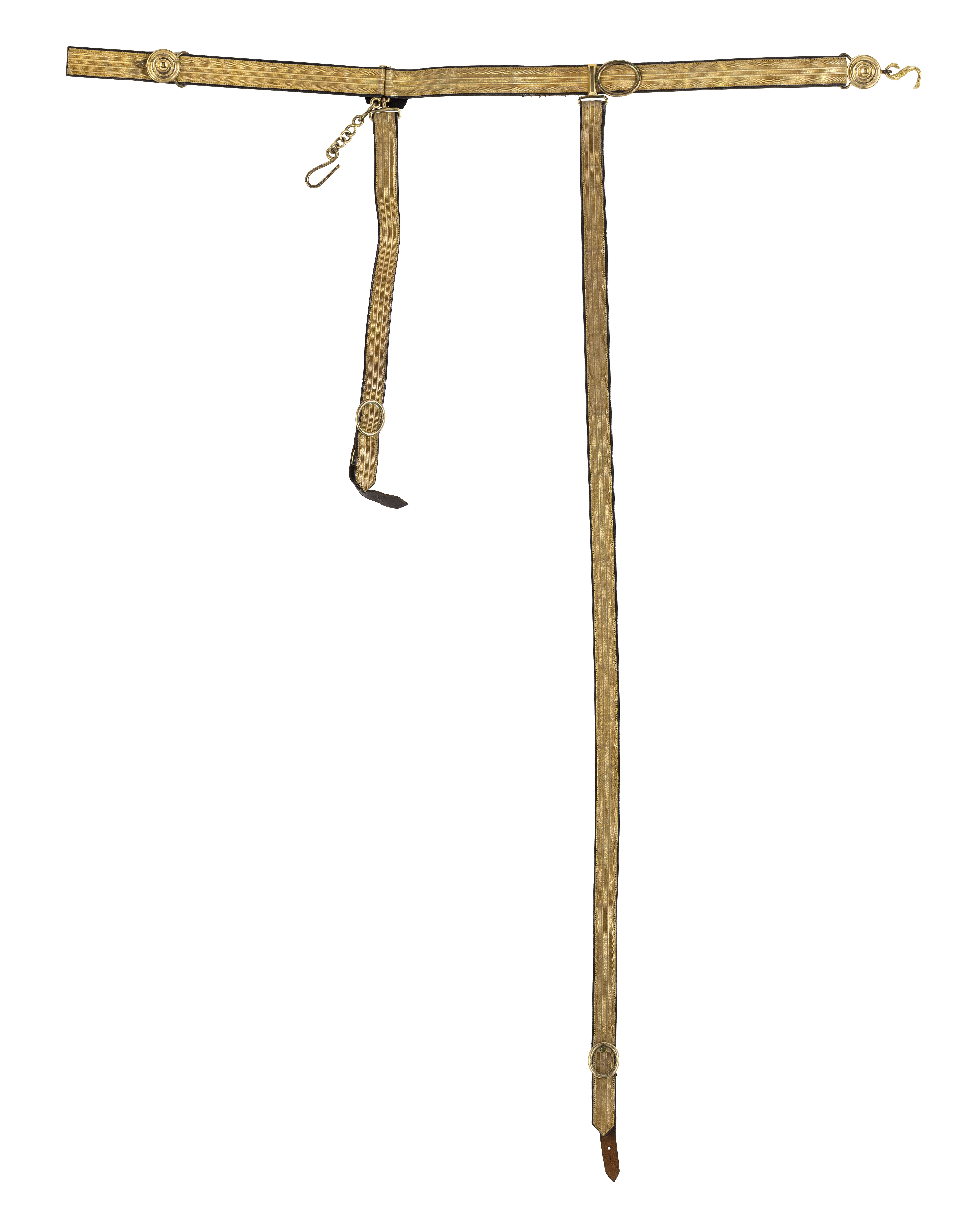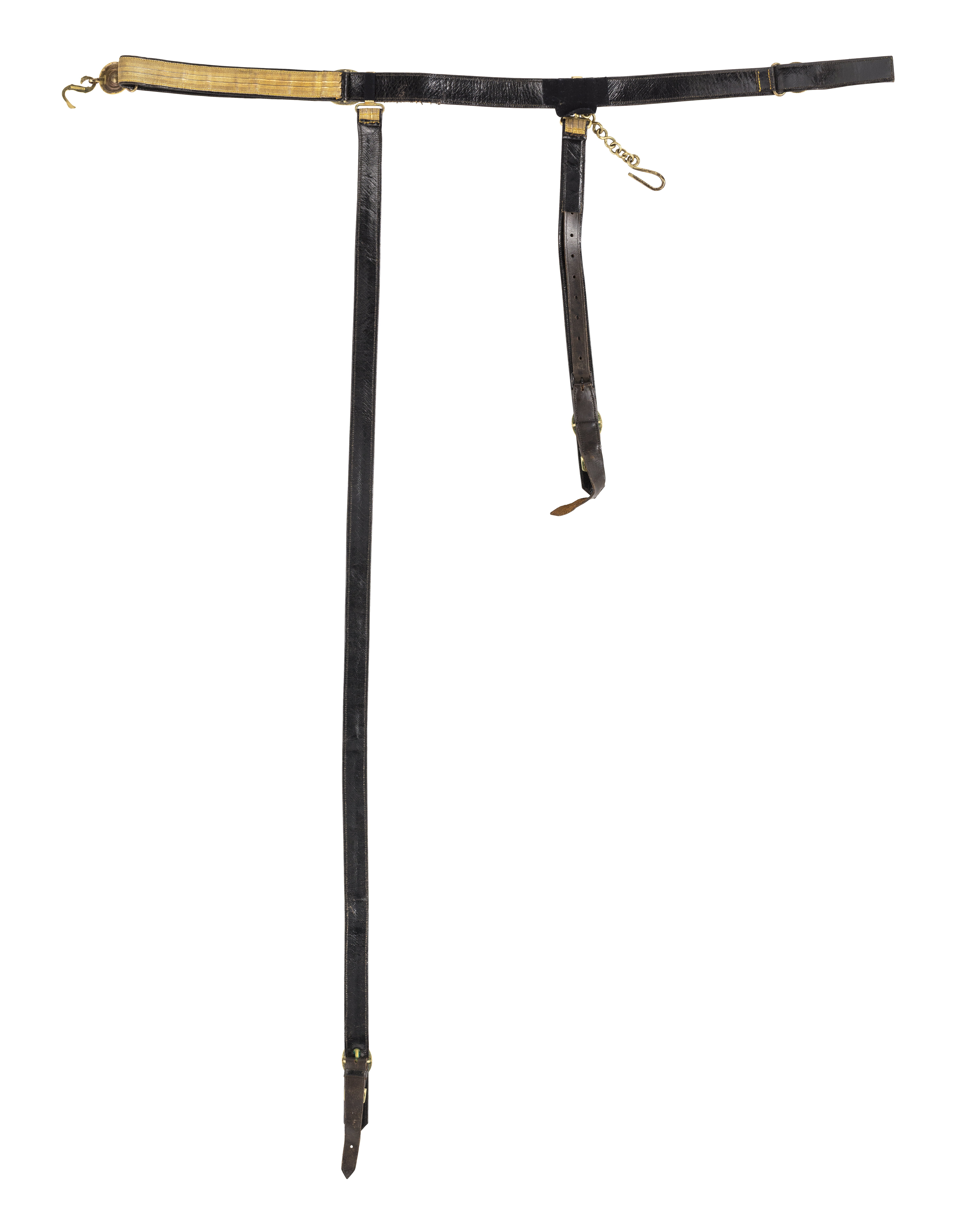 Modellenligt sabelkoppel med svart sammet på insidan vid bärremmarnas beslag. På häktets baksida en firmastämpel: "MORELL & C:NI".