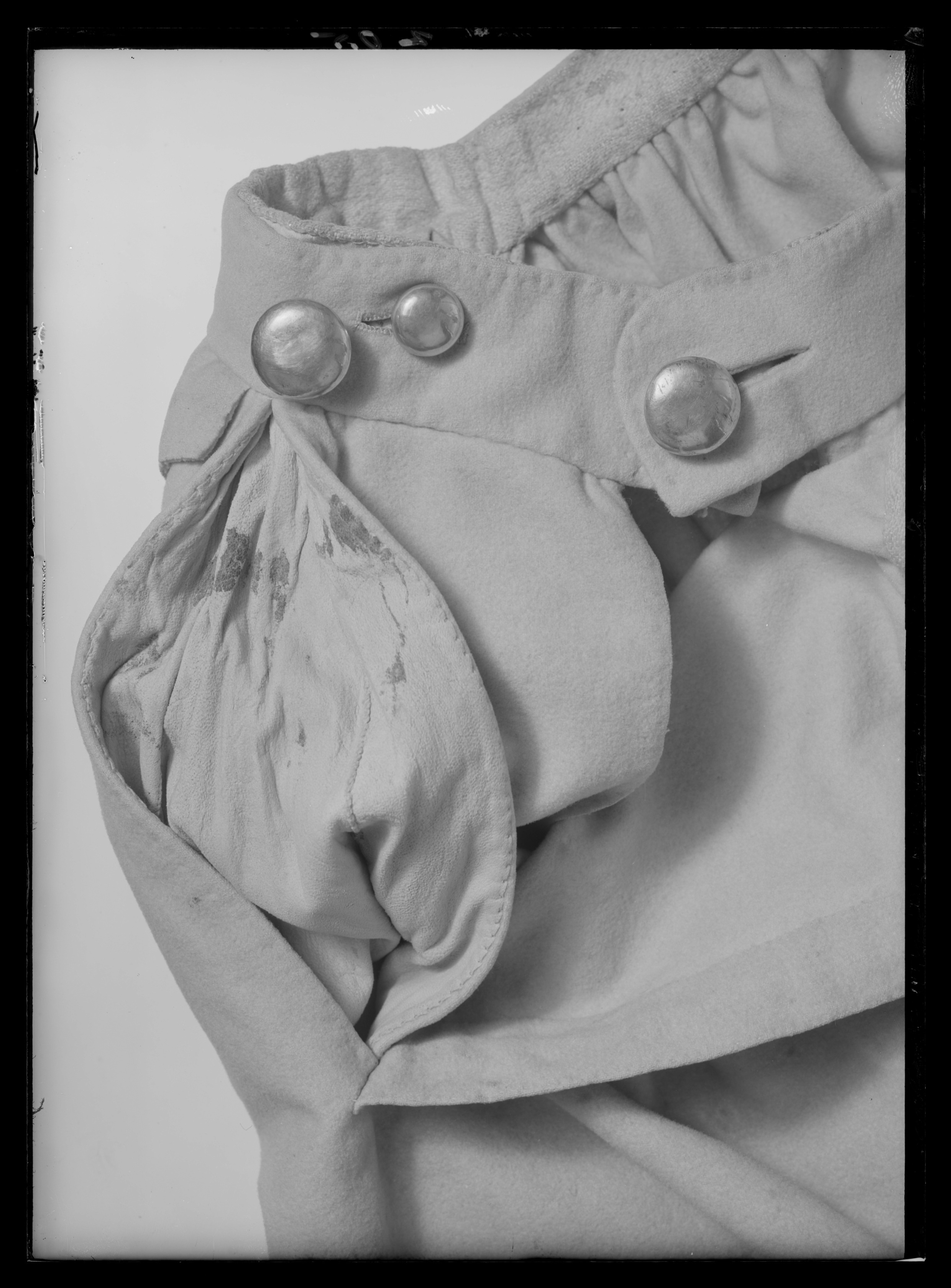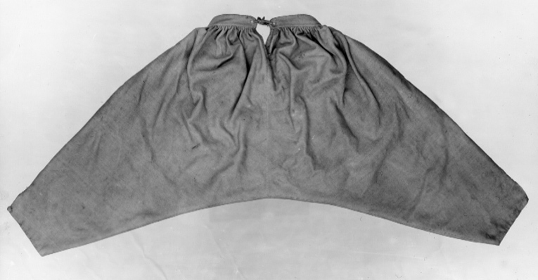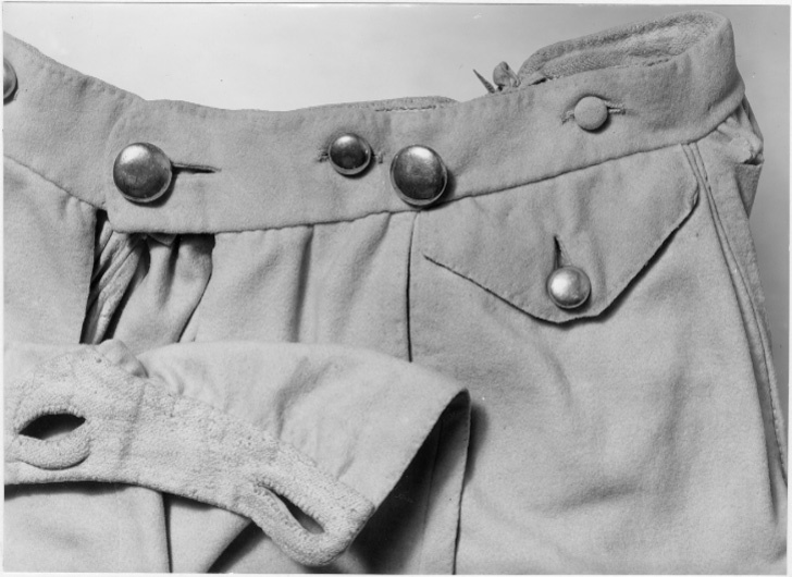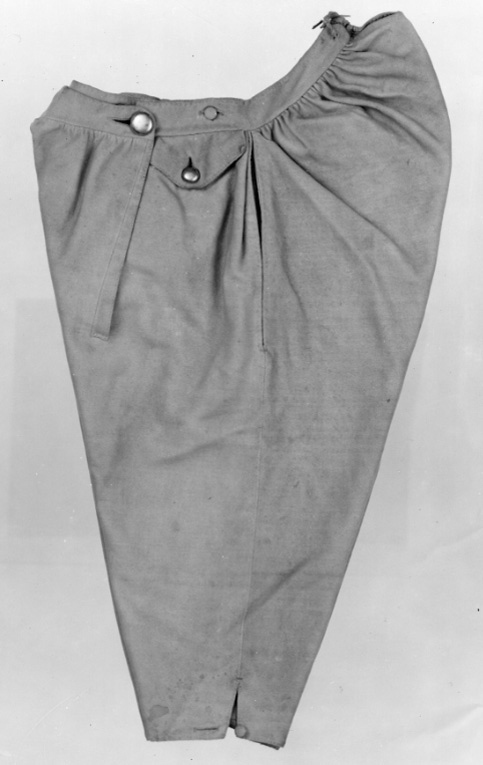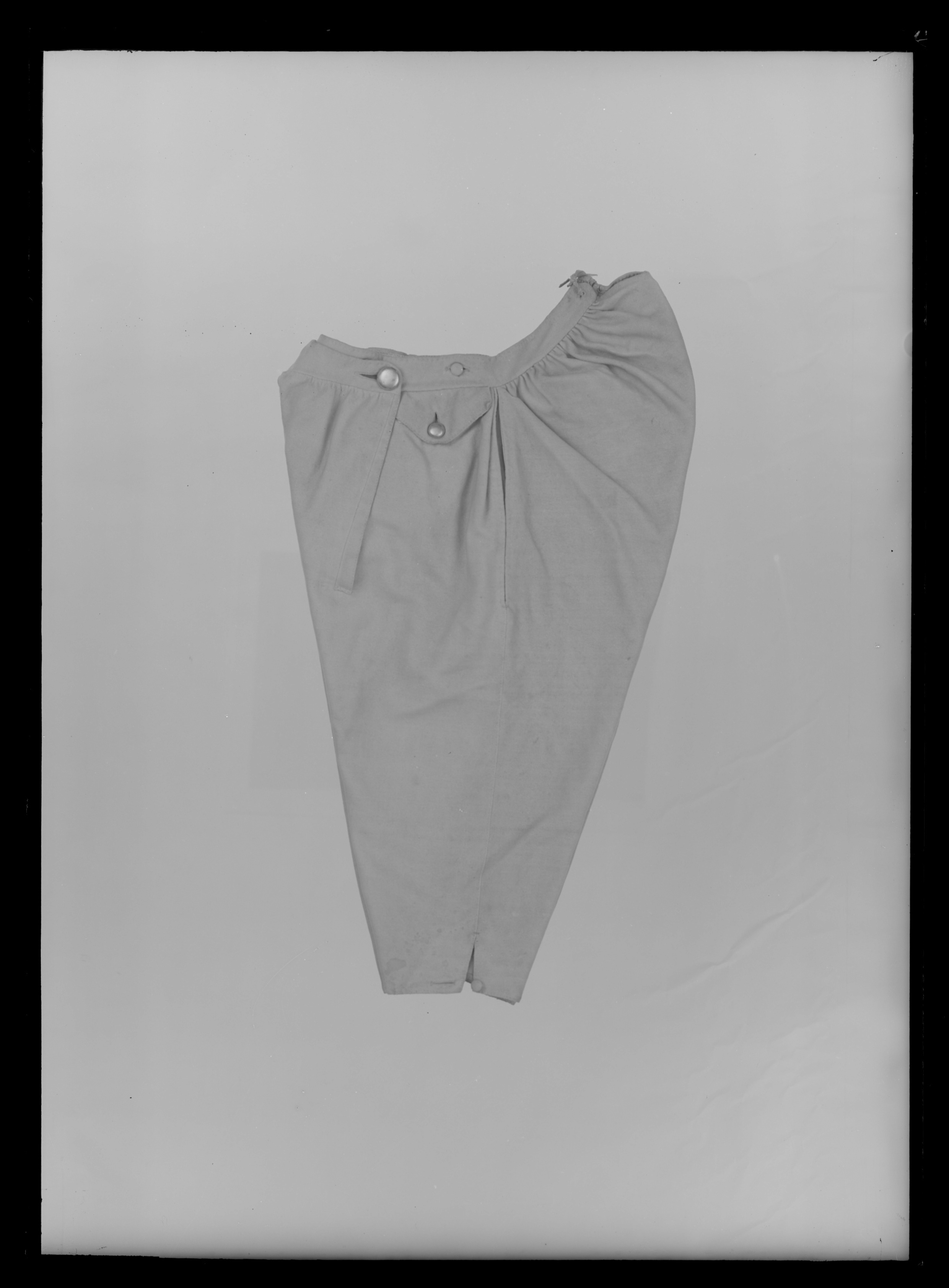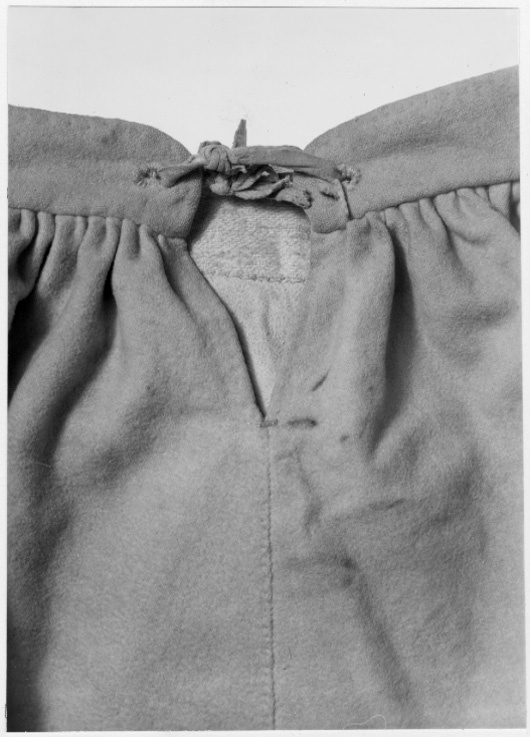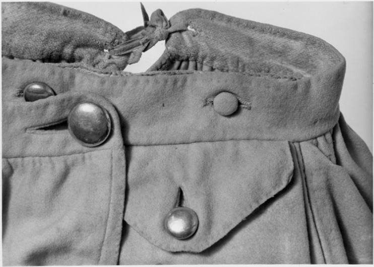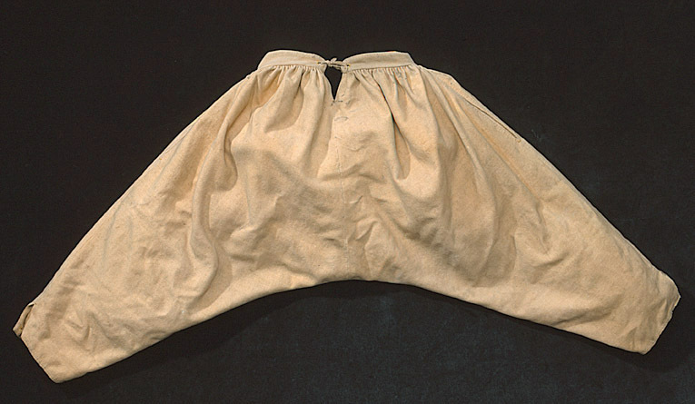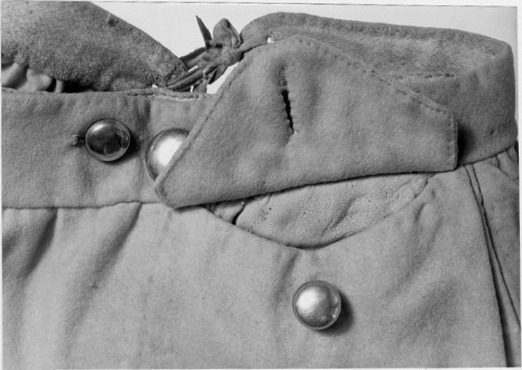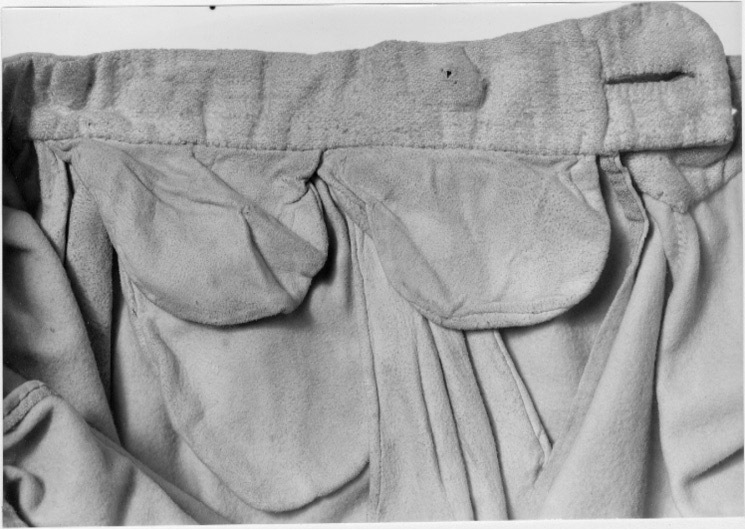 Byxor av ljusgult kläde, vida upptill och smala vid bensluten. Bensluten är försedda med ett 70 mm högt sprund vilket knäpps med en knapp klädd med samma tyg som byxorna. Byxorna öppnas med en lucka mitt fram och baktill finns ett sprund med ett knytband av skinn för att reglera midjevidden. Byxluckan knäpps med tre förgyllda mässingsknappar. Byxorna har en midjelinning med ett sprund mitt fram vilket knäpps med tre förgyllda mässingsknappar varav den mittersta knappen hör till byxluckans knäppning. På midjelinningen sitter två klädda dekorknappar av samma tyg som byxorna. På sidorna nedanför midjelinningen sitter två snett iskurna fickor, l. 125 mm, med rundade ficklock, knäppta med en förgylld mässingsknapp. Fickpåsarna utgörs av ett tunt ljust skinn. Nedanför midjelinningen är på vardera sida iskuret en vertikal ficka, l. 220 mm, likaså fodrade med tunt, ljust skinn. Byxorna är ofodrade men sprund och kanter kantas på insidan av vit linnelärft.