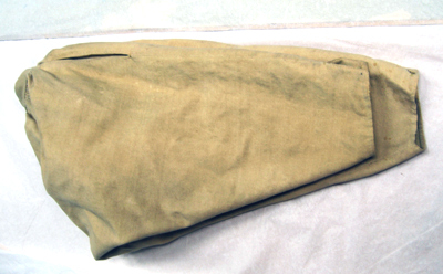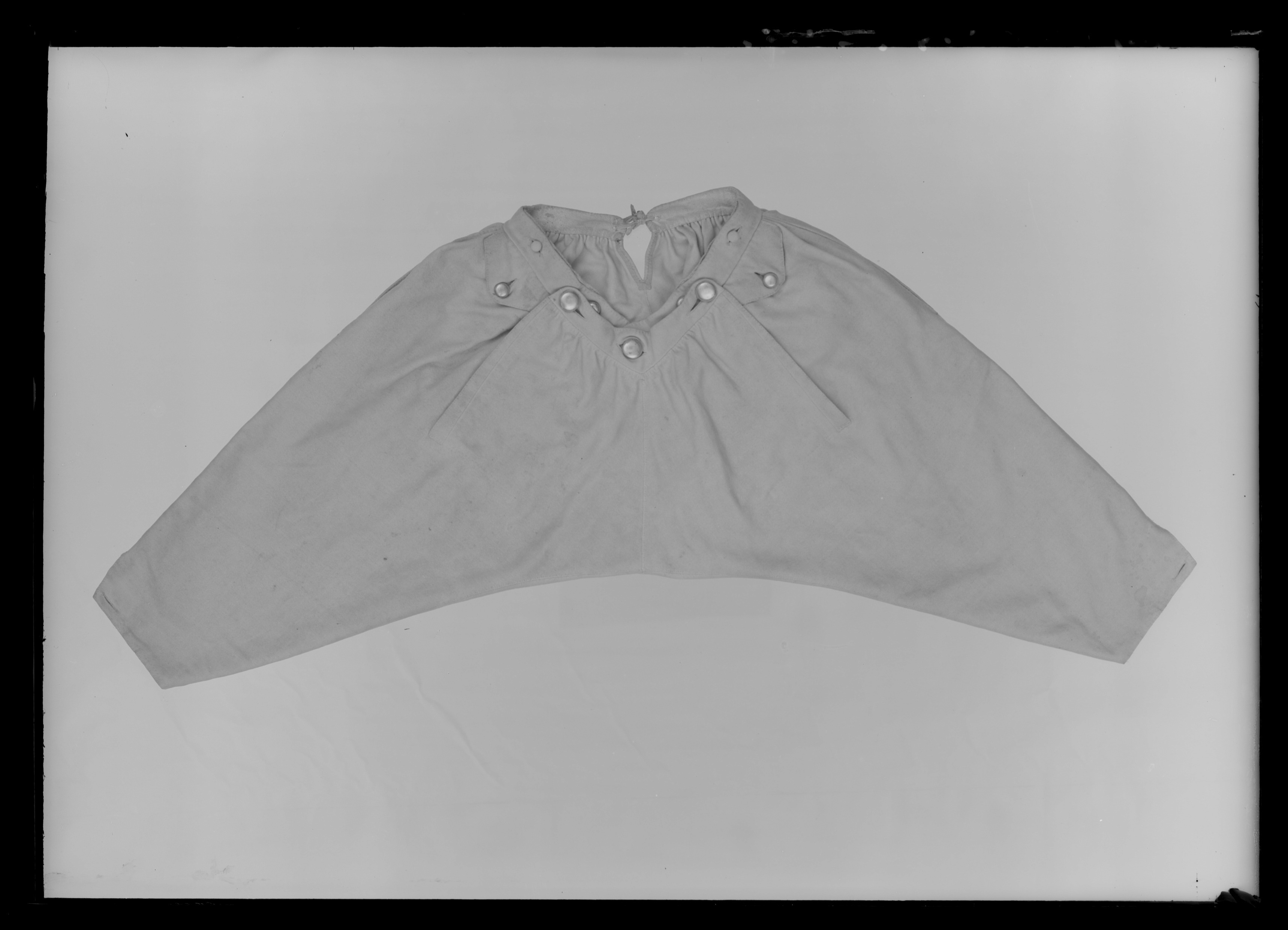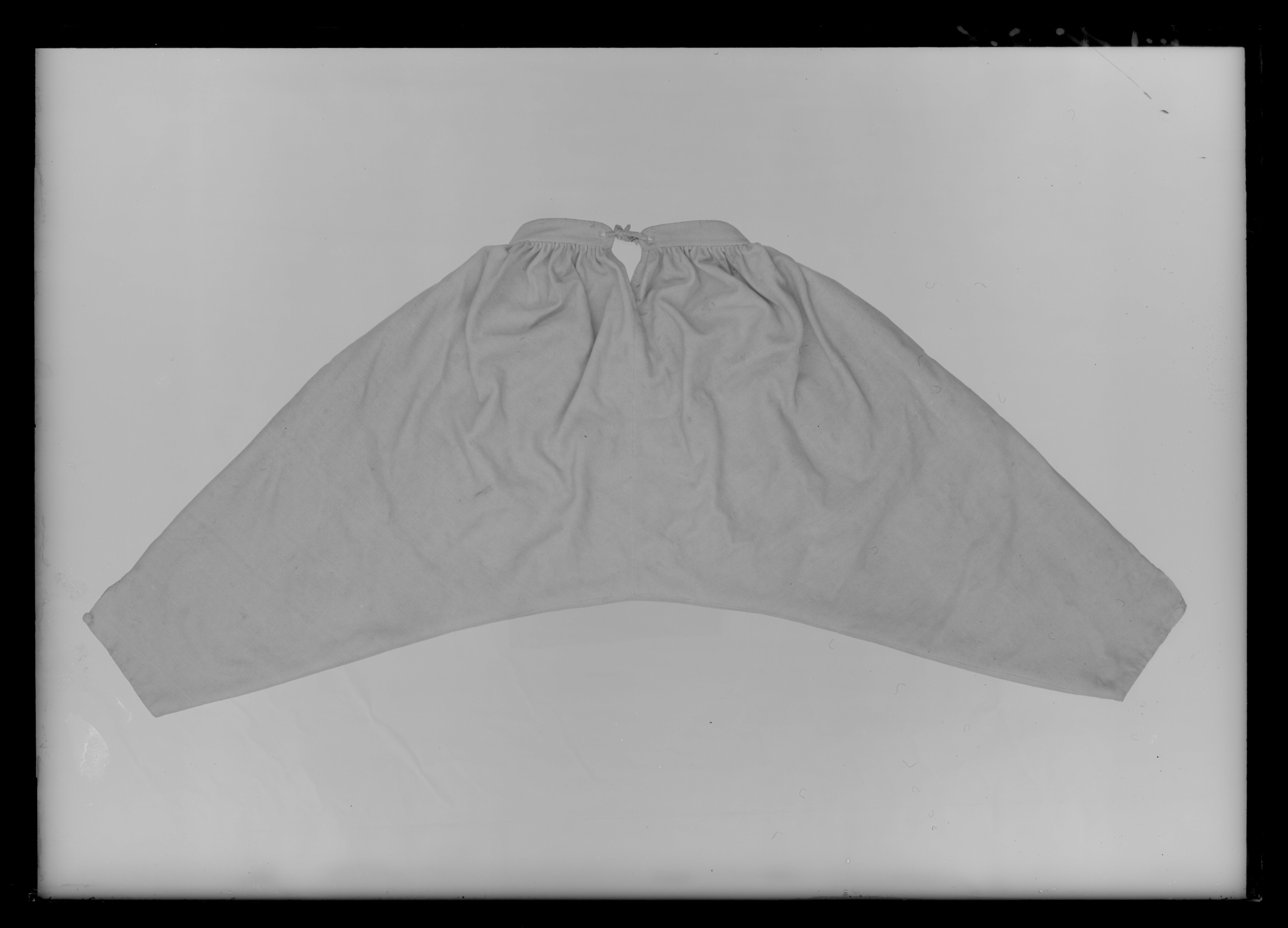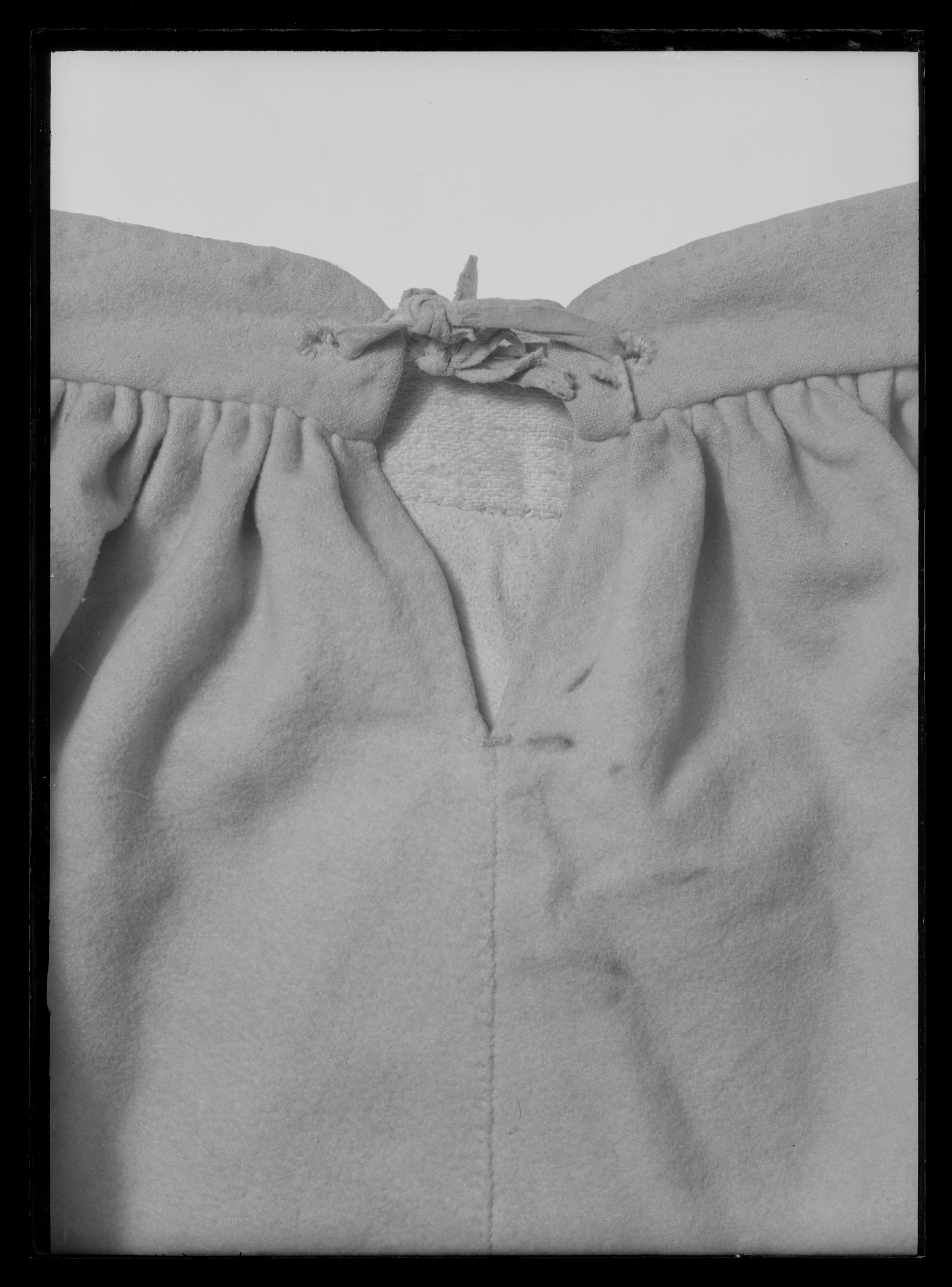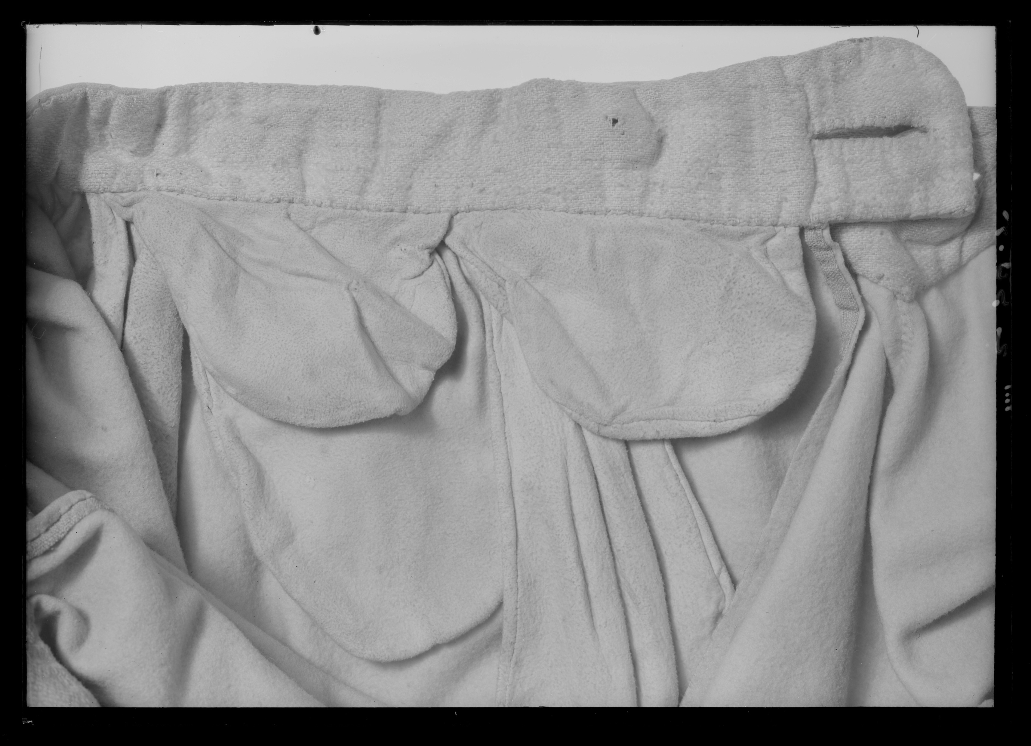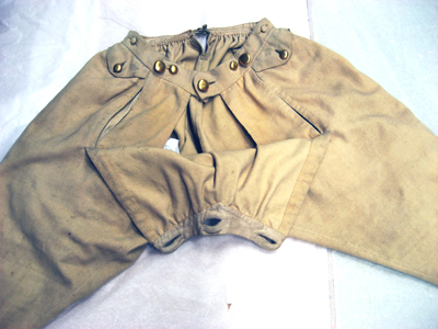 Byxor av ljusgult kläde, vida upptill och smala vid bensluten. Bensluten är försedda med ett 70 mm högt sprund vilket knäpps med en knapp klädd med samma tyg som byxorna. Byxorna öppnas med en lucka mitt fram och baktill finns ett sprund med ett knytband av skinn för att reglera midjevidden. Byxluckan knäpps med tre förgyllda mässingsknappar. Byxorna har en midjelinning med ett sprund mitt fram vilket knäpps med tre förgyllda mässingsknappar varav den mittersta knappen hör till byxluckans knäppning. På midjelinningen sitter två klädda dekorknappar av samma tyg som byxorna. På sidorna nedanför midjelinningen sitter två snett iskurna fickor, l. 125 mm, med rundade ficklock, knäppta med en förgylld mässingsknapp. Fickpåsarna utgörs av ett tunt ljust skinn. Nedanför midjelinningen är på vardera sida iskuret en vertikal ficka, l. 220 mm, likaså fodrade med tunt, ljust skinn. Byxorna är ofodrade men sprund och kanter kantas på insidan av vit linnelärft.