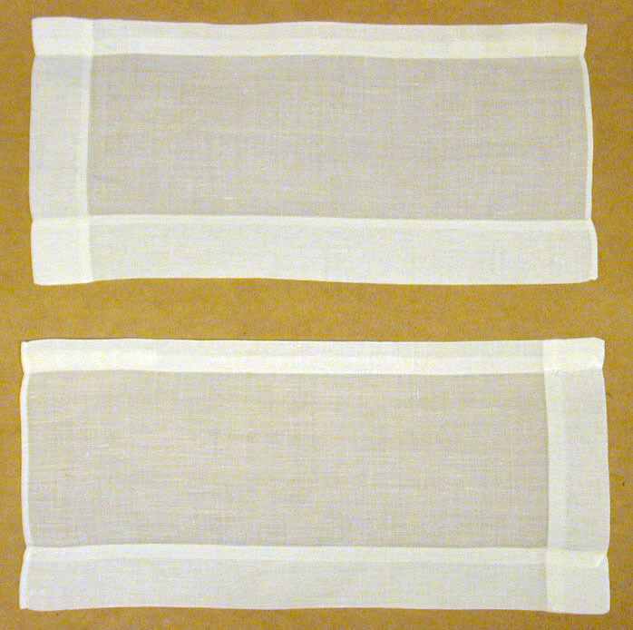 Två stycken rektangulära manschetter av vitt tunn stärkt linnebatist. Två breda fållar 23mm, en fåll 102 mm samt en rullfåll. De breda fållarna maskinsydda, den smala kastad.