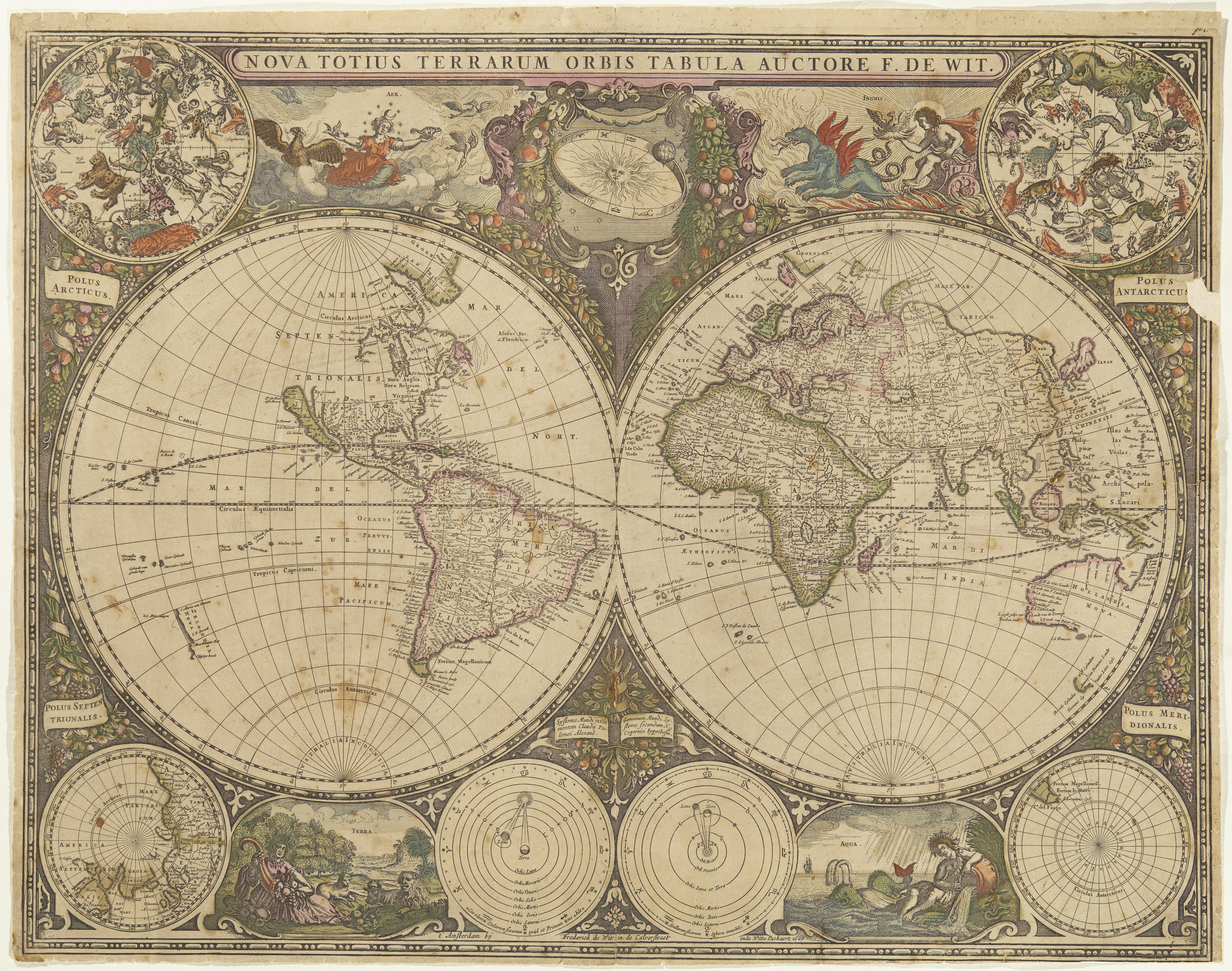 Koppartryck på papper samt handkolorerad. Upptill i vardera hörnet en himmelsglob, nedtill i vardera hörnet polerna. Upptill illustrationer föreställande ”Luften” och ”Elden”, nedtill ”Jorden” och ”Vattnet”. Nedtill i mitten t.v. Ptolemaios planetsystem, t.h. Copernicus planetsystem. Vid övre kanten: ”Nova Totius Terrarum orbis tabula auctore F. de Wit”. Vid nedre kanten: ”t Amsterdam bij Frederick de Wit in de Calvershaet inde Witte Paskaert 1660”. Med bläck på baksidan : ”Glob Charta öfver Jorden”. Hopklistrad i två delar.