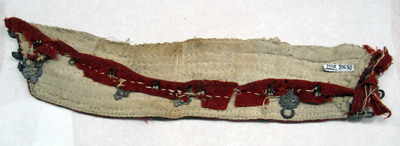 Ståndkrage till samedräkt med spännesmyckat halssprund, s.k. barmglip. Kragen är formad som ett jämnbrett band, av rött yllegarn med invävda vita ränder, kantat av ett påsytt grönt ylleband och snett utställt i sidorna. I vardera sida är påsytt tre små tennknappar med en vriden dekor, fästade i vita skinnöglor. På undersidan fodrat med beige linnelärft. Halssprund bestående av ett smalt band av rött kläde. På bandet påsytt liljeformade tennbrodyrer samt sex hakar med motsvarande hyskor.
