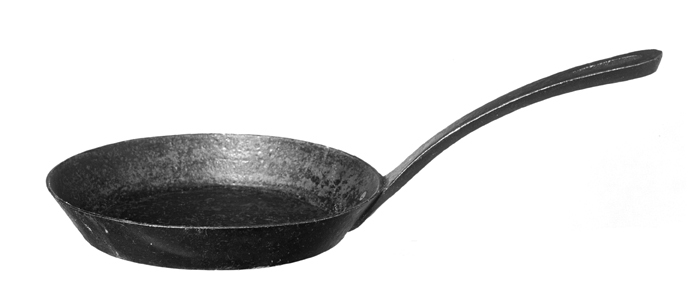 STEKPANNA (omelett-) Av järn, gjuten. Rund, med mycket snett utstående kant, skarp bottenkant, plan botten och starkt uppsvängt skaft. Skaft gjutet, med platt översida, rännformig undersida och insvängda kanter, i övre änden ett avlångt kilformigt hål, från inre änden utgående en flik, fäst vid kanten med två nitar. Höjd: 3,3 cm.; diameter: 20 cm.