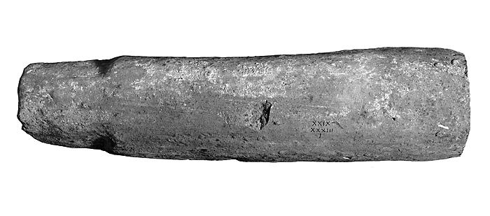 TAKTEGEL Munktegel av rödbrunt lergods. Halvcylindrisk. Något hopdragen i övre ändan. På översidan spår av murbruk. Längd: 43,5 cm, bredd: 11,2 cm, höjd: 6,5 cm.