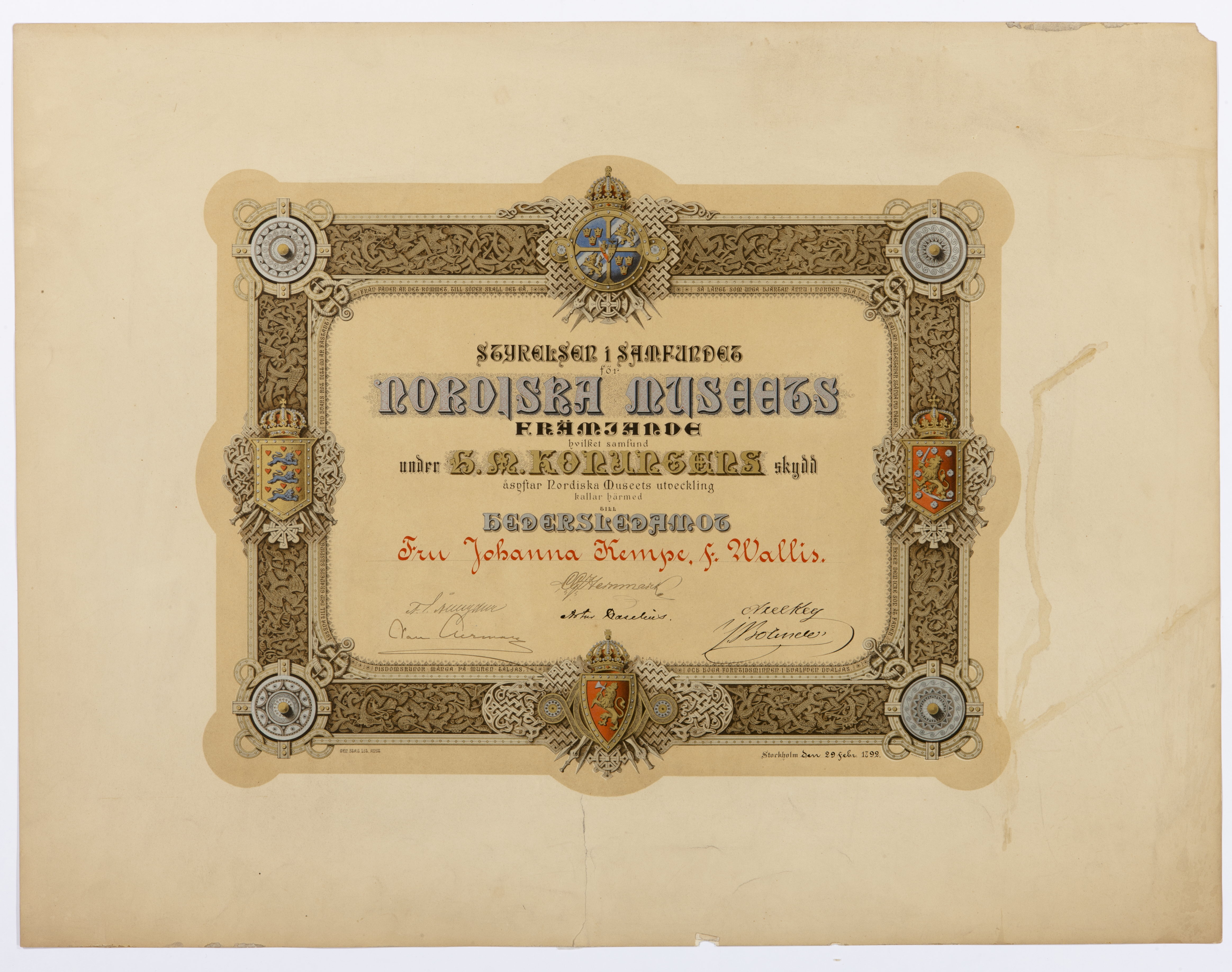 Museer och föreningar. Samfundet Nordiska museets främjande. Kallelsebrev. Johanna Kempe, f. Wallis hedersledarmot. 29.2.1892. Gen. Stab. Lit. Anst. Tryckt i guld, silver och färger. Atlasfol.