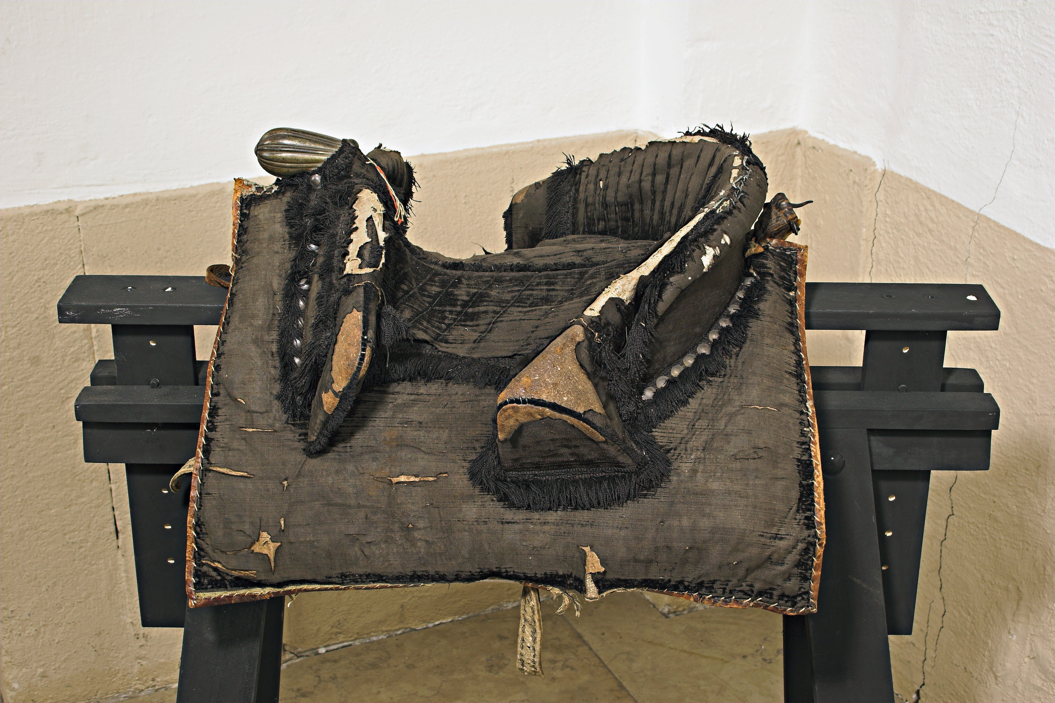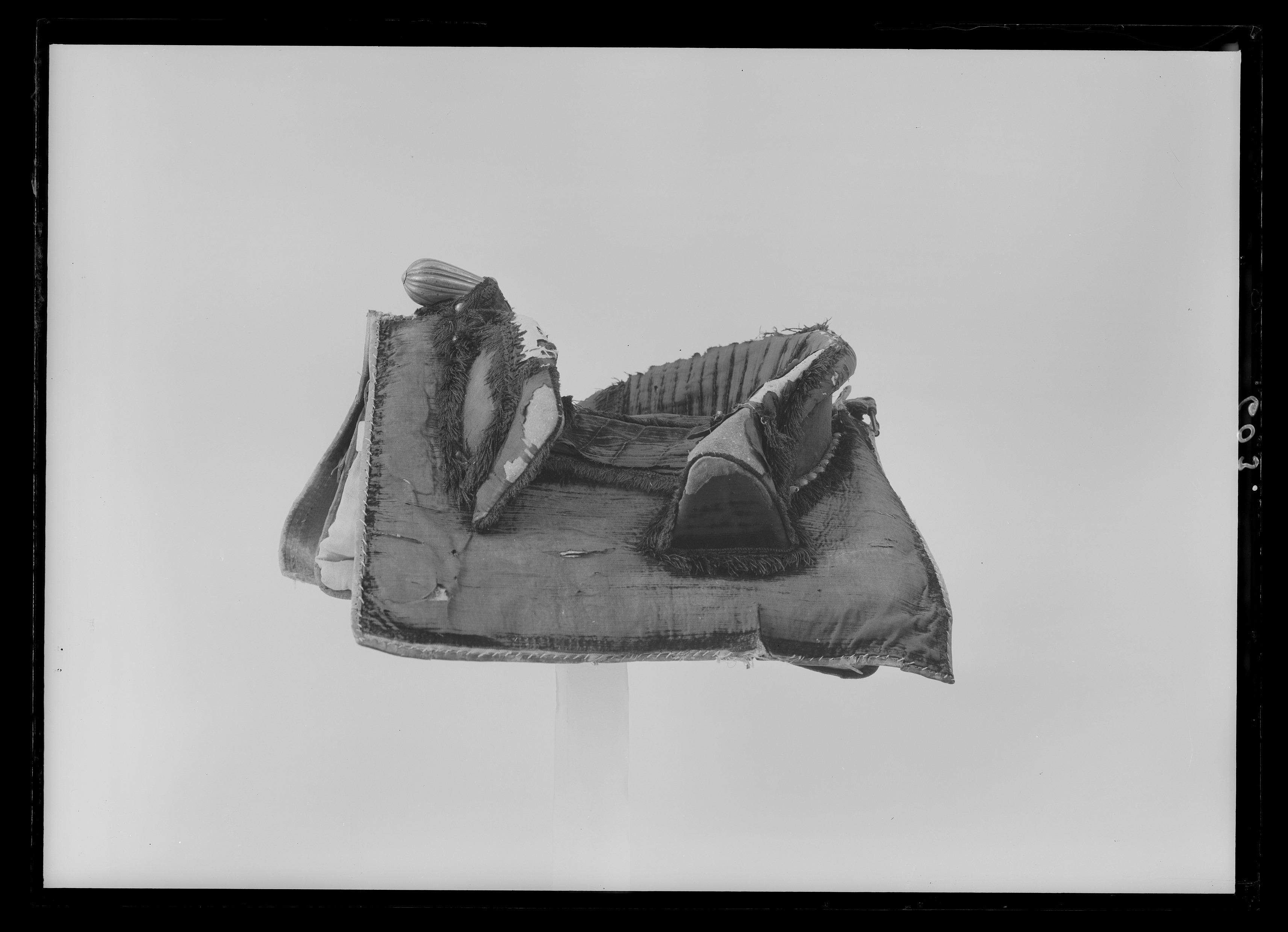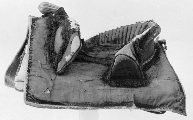 Bomsadel av svart sammet med stickningar. Sitsen kantad med svart silkefrans. Rektangulära kappor, kantade och fodrade med ljusbrunt läder. Tvådelad frambom med snett avskurna ändar, ca 335 mm bred, ca 85 mm hög, på ut- och insidan och runt kanten med svart silkefrans. Bakbom ca 401 mm bred, ca 105 mm hög, med snett avskurna ändar med lodräta stickningar samt kantad med svart frans. Framtill rundad, utdragen, räfflad sadelknapp av försilvrad mässing med en försilvrad tennlicka på var sida. Framför frambommen åtta på var sida samt bakom bakbommen en rad med 20 försilvrade tennlickor. Bommen klädd med väv samt bossa av naturfärgat linne, fodrad med ljusblått linne samt kantad med brunt skinn. Fyra sadelgjordsstroppar av vitt läder. Två byglar för stigläder, två söljor för förbygeln,en sölja för svansrem, alla av stål. På framvalvet fästat ögla av läder (söndrig).