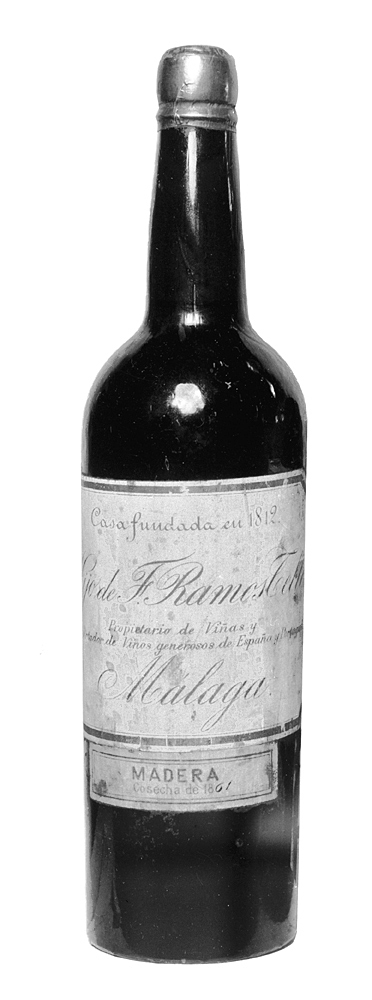 MADERA, Hijo de F. Ramos Tellez, Málaga, från1861, , två helbuteljer. Buteljer av grönt glas. Cylindrisk, med kupigt indragen skuldra och svagt spolformig hals, kring vars mynning en bred bandliknande utsvällning (s. k. stärkring); nedanför denna en utstående skarp kant; bottnen konisk, högt uppskjutande. Kapsyl av förtent bly, rödfärgad. Höjd: 30,8 cm.; diameter: 7,9 cm. Inköpt av Walther von Hallwyl något av åren 1861- 1917.