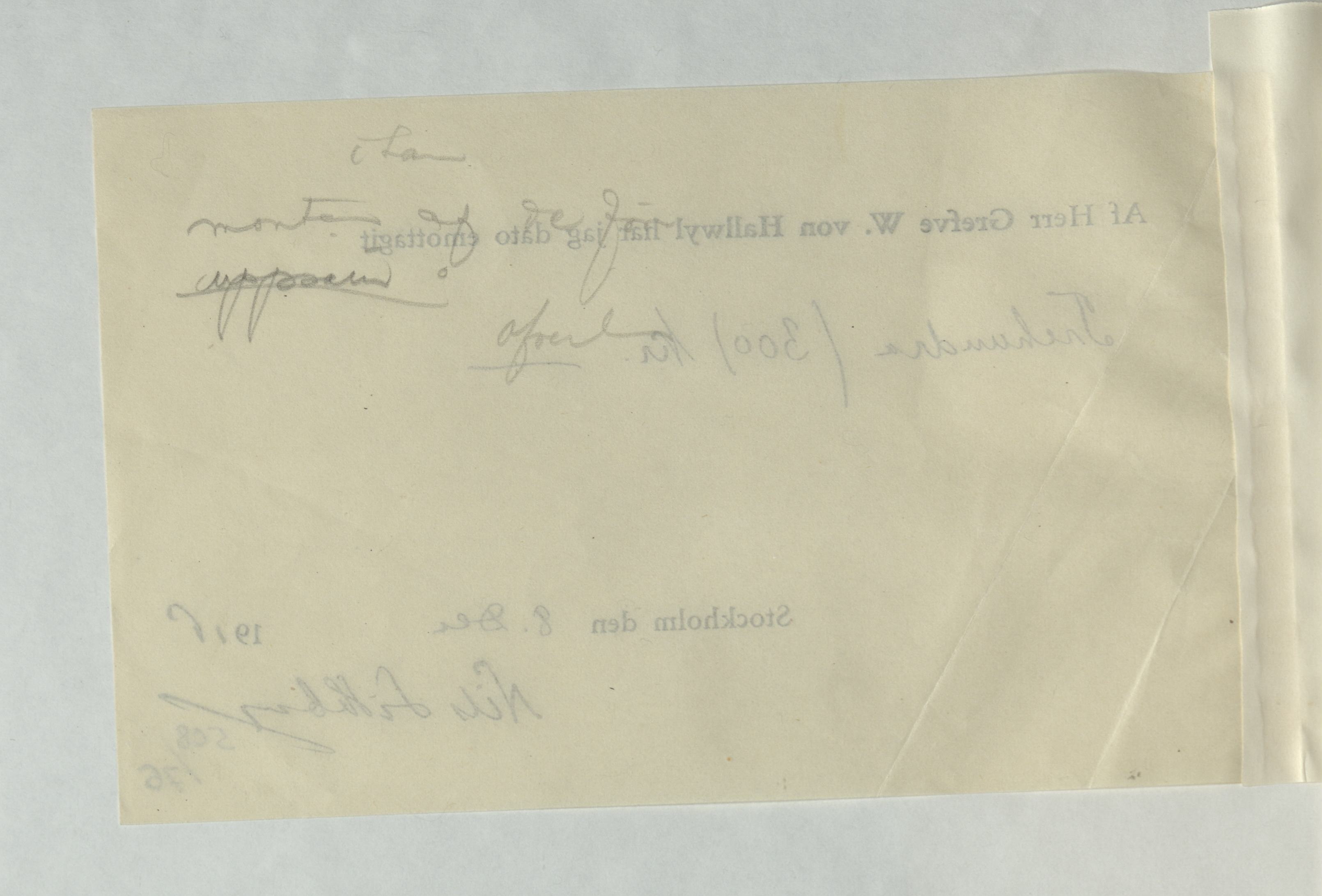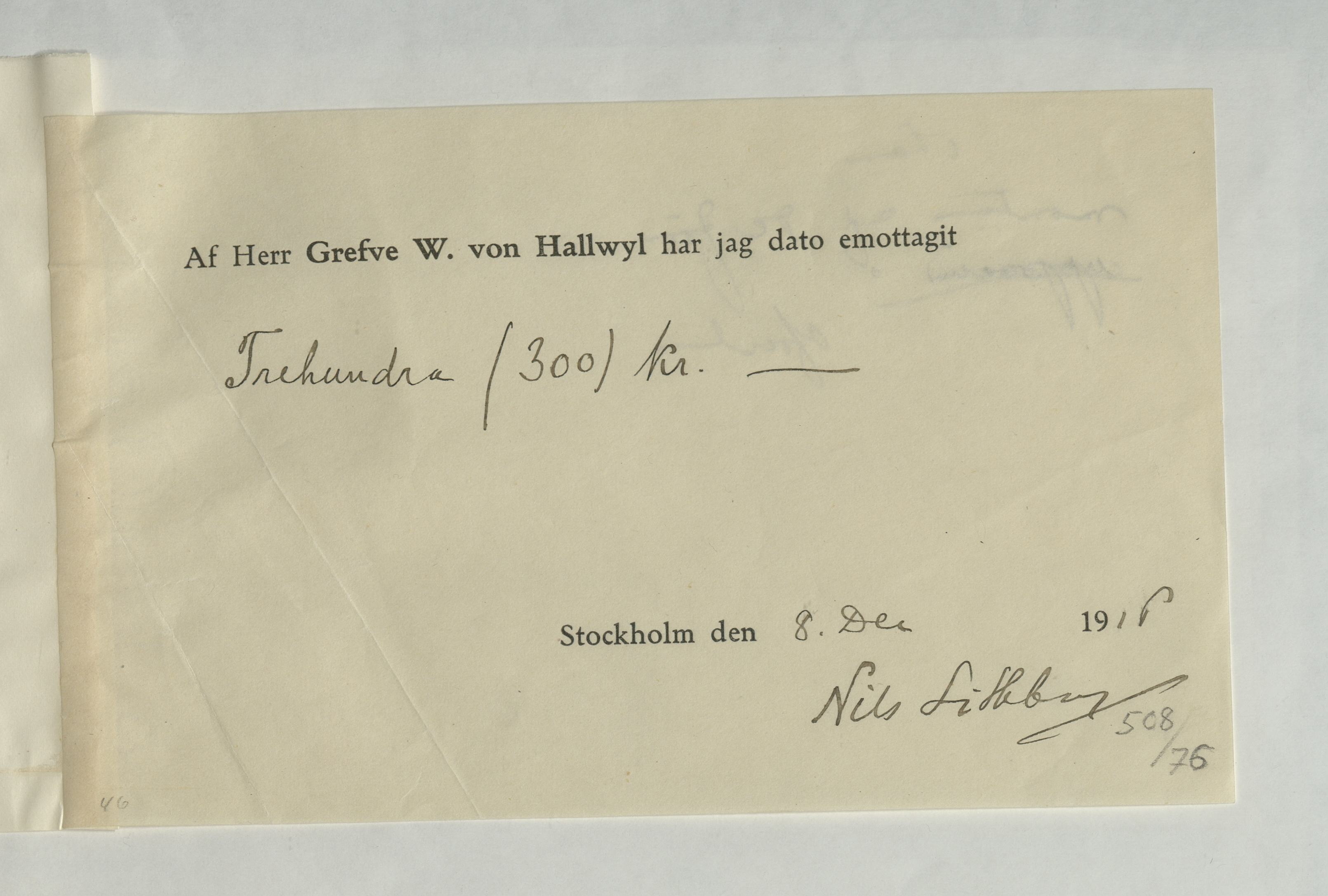 Emottagande av arvode från greven Walther von Hallwyl till Nils Lithberg, 8 december 1916.