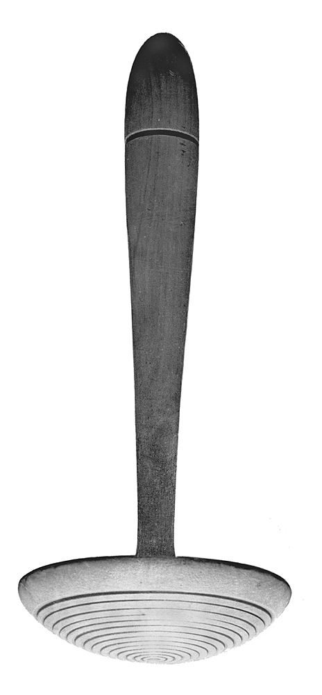 PURÉSTÖT Av al, svarvad. Bestående av ett stort huvud på långt skaft. Huvudet med konvex utsida och plan insida, den förstnämnda med insvarvade koncentriska ringar. Skaft rakt, inborrat i huvudet, långsträckt, avsmalnande inåt och avslutat i en flänsliknande utsvällning, yttre änden rundat avspetsad, ett stycke innanför denna en insvarvad bred rand. Längd: 26,3 cm. Huvud, diameter: 10,6 cm. Skaft, längd: omkring 23 cm.