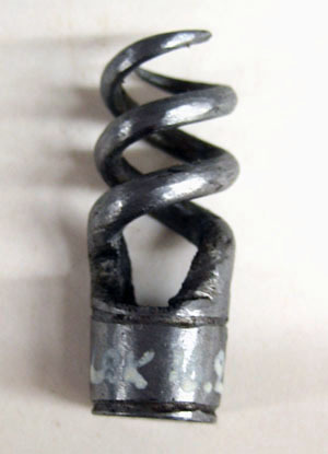 Krats av blankt stål. Cylindrisk bas med invändig gängning och två skurna ringar. Två spiralvridna armar med spetsig ände.