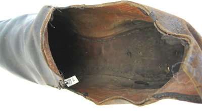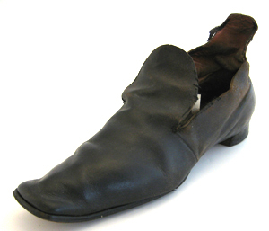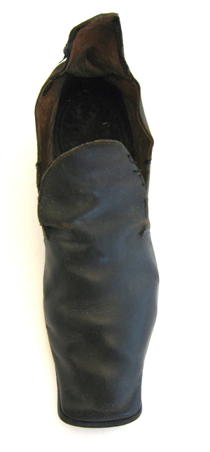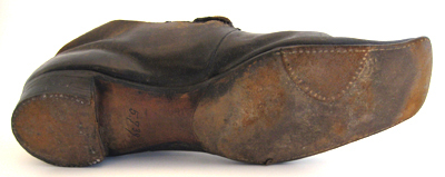 Herrsko av svart läder med hög bakkappa, snett skuren fram och med en rund, hög plös skuren ur ovanlädret. Tån är rakt skuren. Två halva sömmar mitt bak på hälen. Sula och klack är av svart pressat skinn. Klacken är låg och bred, 66 mm lång, 64 mm bred och 35 mm hög. På klackens undersida syns små nubb i kanten och i sulans kant syns små vita handsydda stygn. Skon är på insidan fodrad med brun läder. Innersulan är likaså av brunt läder.