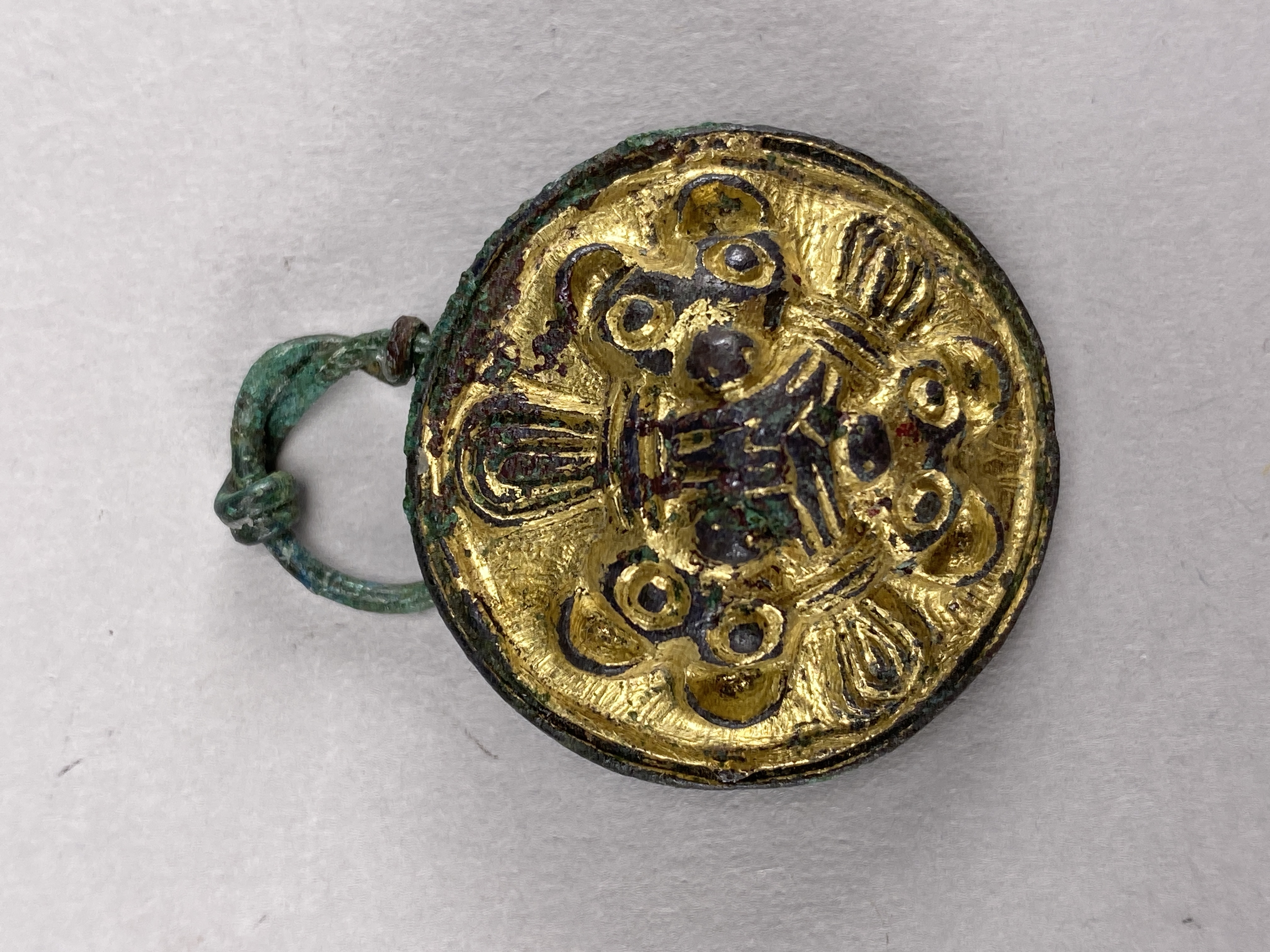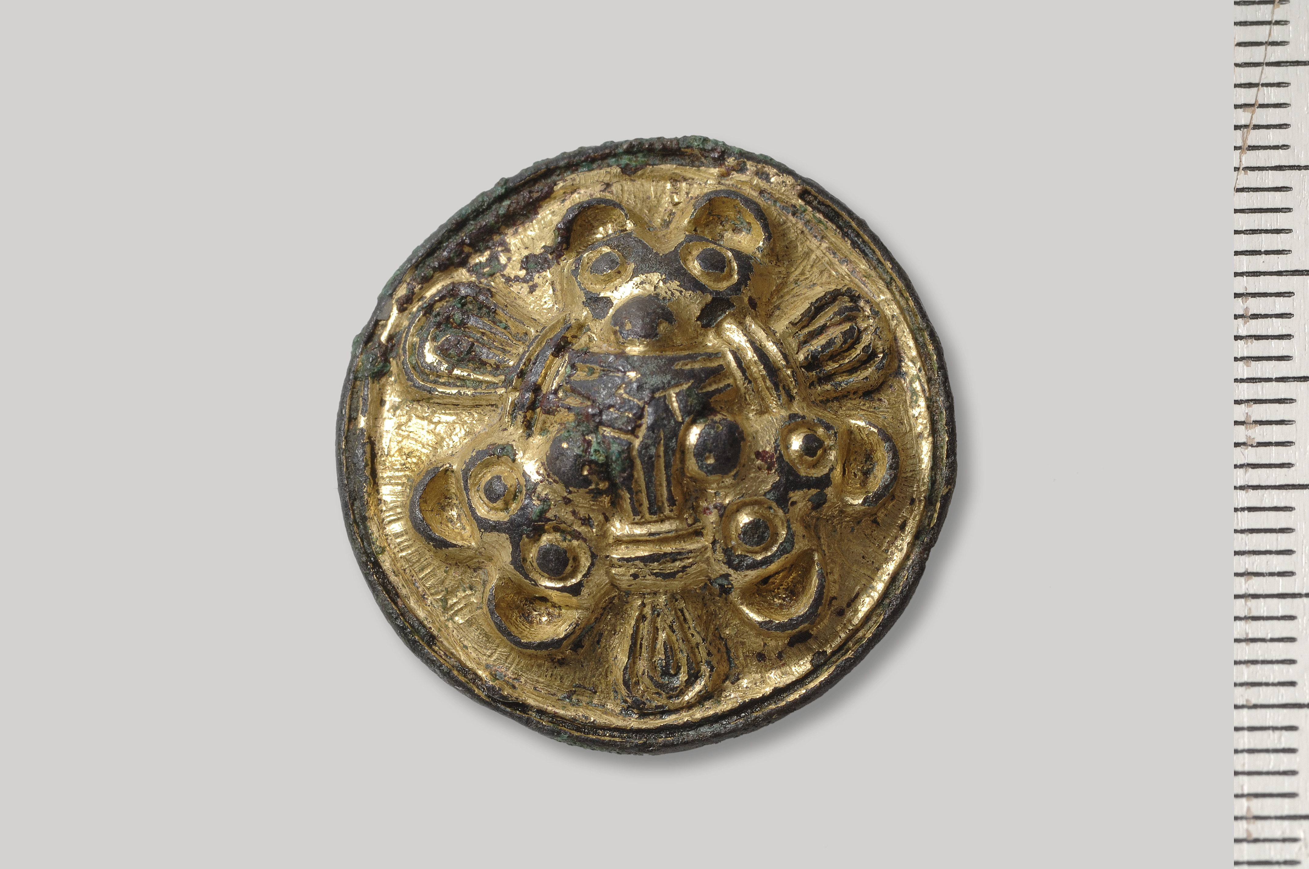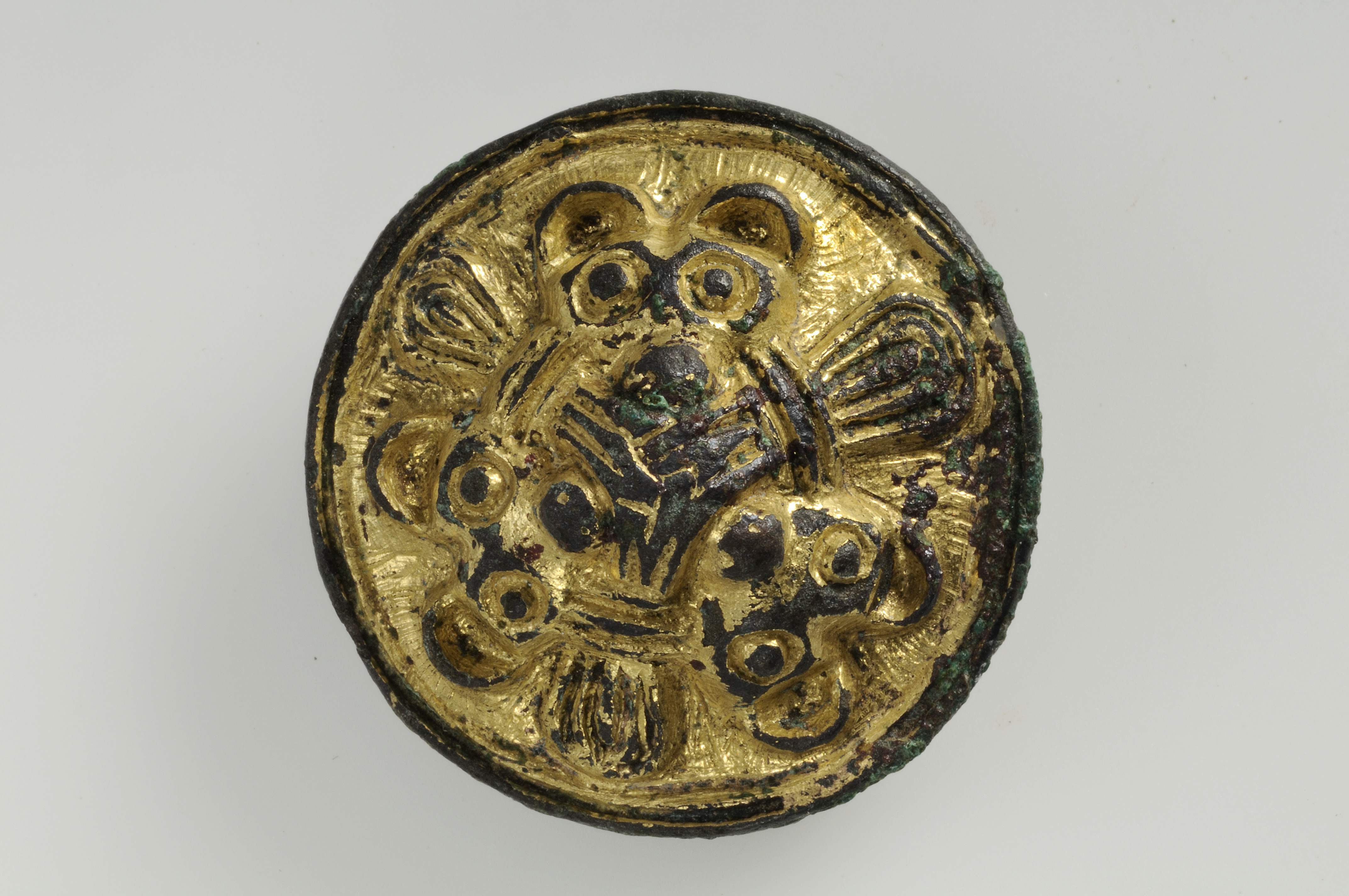 litet rundspänne i Borre-stil med vidsittande textilrester.