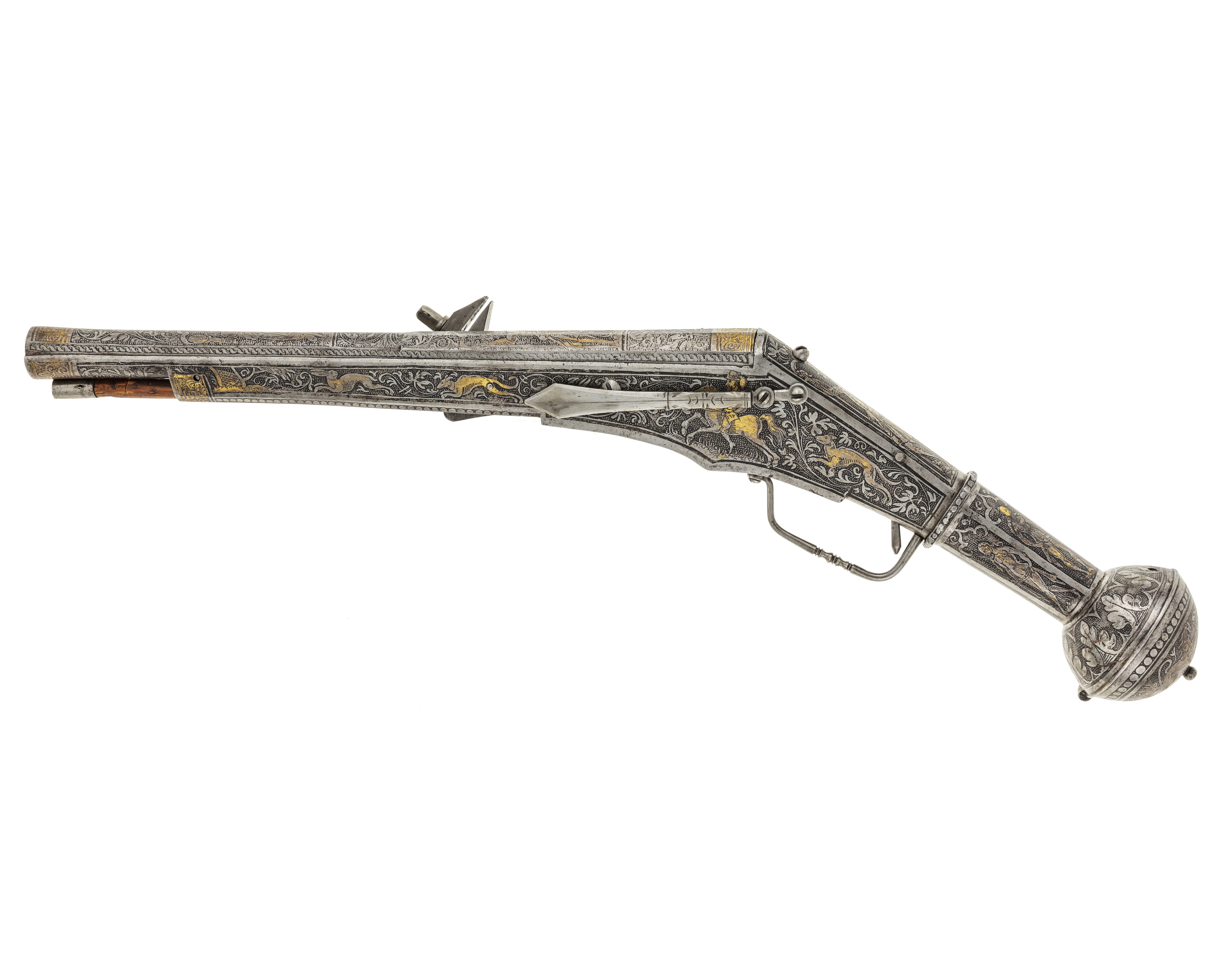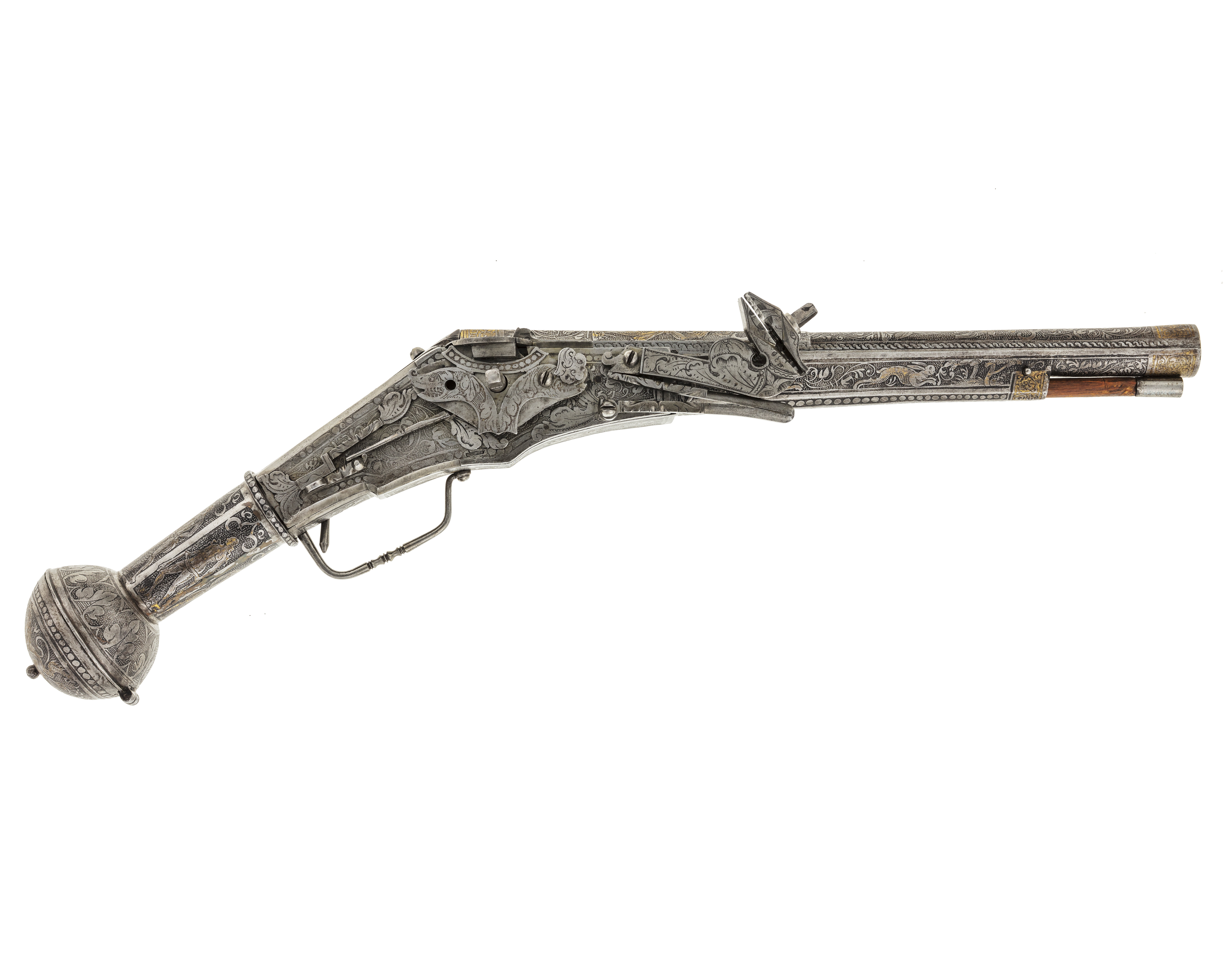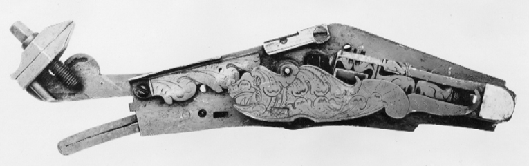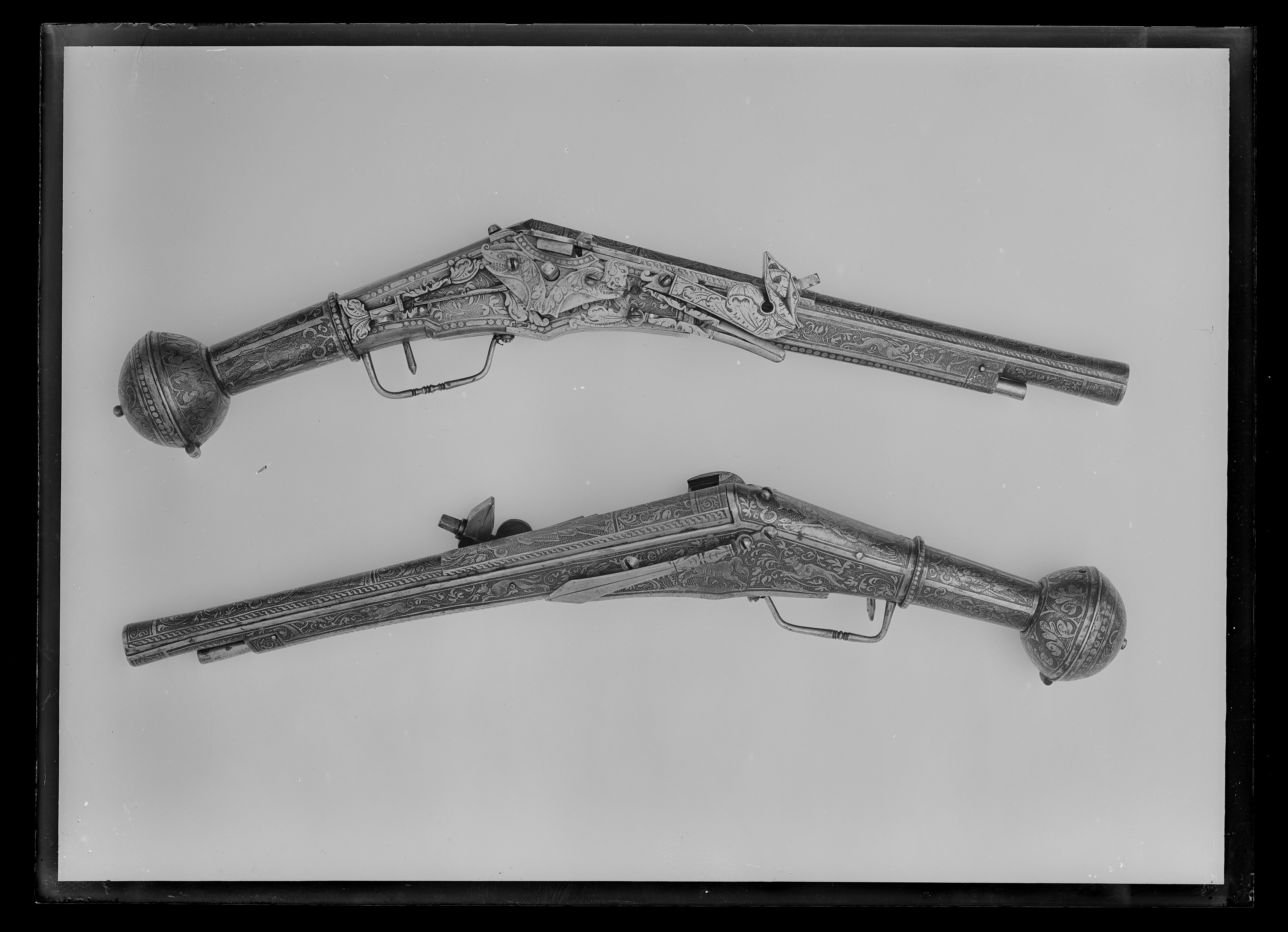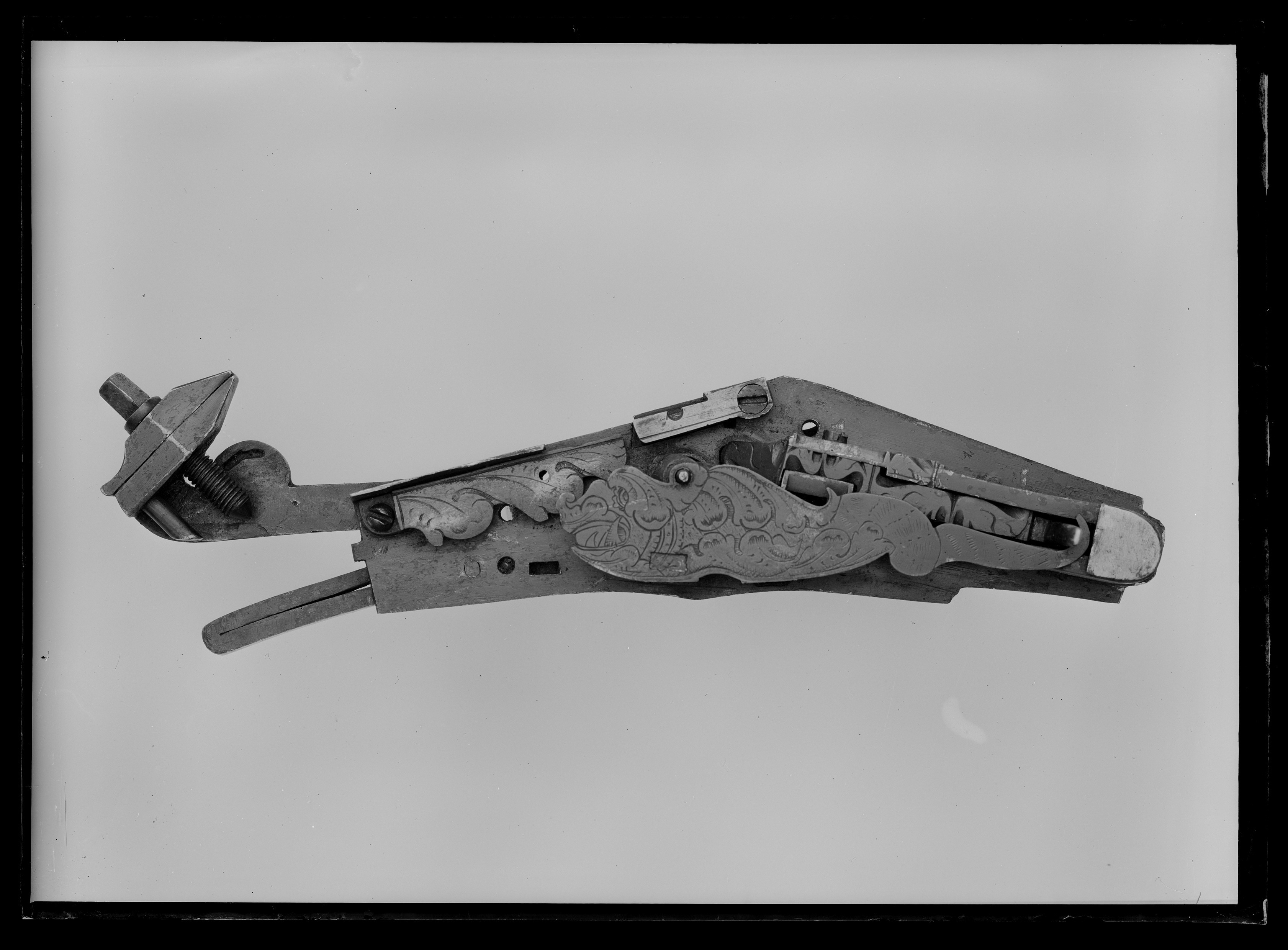 Rund pipa med svag trumf och åttsidig kammare, kort, försänkt, i vinkel böjt svansskruvblad (dolt av kolvplåten). Pipans ovansida helt täckt av etsad och delvis förgylld dekor, ett förgyllt tvärband i båda ändar på pipan och däremellan rankdekor mot prickbakgrund. På den kantiga delen en förgylld man, helbild, profil h, barett med plym, midjekort mantel, pluderhosor, värja. På den runda delen en kvinna, helbild, profil v, lång, veckad kjol med tvärbårder, överdel med långa, hängande ärmar, kort plagg över axlarna, v. hand vid midjan, h. hand lyft framför ansiktet, hållande spegel (? runt föremål med hundliknande drag, skaft). Båda figurerna står i fält som framtill avslutas med trepassformig båge med krön i form av fransk lilja. Pipans undersida endast grovfilad. Fästning: Två häften. Pipan fäst med krysskruv samt två pipstift av stål. Hjullås med plant låsbleck med delvis fasade kanter. Låsblecket täckt av etsad dekor med bladrankor mot prickbakgrund, kantbård av omväxlande tre runda och ett avlångt, blankt fält. Utvändigt hjul täckt av en rombisk platta och därpå stödram i form av två från nederkanten utstickande, från varandra vända, etsade drakhuvuden, förenade dels nertill, dels genom båge med prickdekor ovanför hjulaxeln. Drakarna och den rombiska plattan fästade med en skruv genom vardera drakhuvudet. Kantig fängpanna, på ytterkanten och bakkanten en plan skiva med svängd kant, som tillsammans med fängpannas lock bildar en halvcirkel (fängpannelocket saknas). På skivans ovansida hakan av en grotesk mask (jfr inventarienummer 17584). På låsbleckets kant därframför en etsad bladranka. Hane med rak, kantig kropp, på framsidan en utskjutande platta med rundad kant framför käkskruven, lös överkäke med antydan till fingergrepp, käkskruv med litet, fyrsidigt huvud. På hanens utsida grövre rankdekor samt antydan till drakhuvud på käkarna. Hanfjäder med framtill rundad utsida, filade bladrankor, dubbelt, kraftigt fjäderlöv med dekor som på hanen, ena bladet nedanför hjulet, det andra uppåtriktat. Låset invändigt blankt. Stor, framtill konturerad täckplatta från avtryckare till hjulaxel, odjurshuvud framtill. Stångtanden saknas. Säkring: På låsbleckets bakre del en virvelsäkring, L-formig bygel med lång, profilerad främre arm avslutad med stort fjäderlöv, bakom bygeln ett löv som täcker hela låsbleckets plana del och tvär avslutas vid tungan som skjuts in under kolvplåten. Säkring med rinformigt, platt grepp, profilerad fjäder med dubbelt fjäderlöv som hanfjäderns. Fästning: Två låsskruvar, den bakre samtidigt fästskruv för bältehaken. Avtryckare: Rak avtryckare, fäst med skruv i kolvplåten. Helstock av stål med i vinkel böjd kolv, avslutad med kolvkula, kolvkulan delad i två halvor, förenade med gångjärn på undersidan, fjädrande spärr som nås genom hål i kolvkulan. Kolvhalsen rundad, framtill en ring med pärlstavsdekor. Låsdelen av kolven samt framstocken kantiga, sluten laddstocksränna, framstocken därframför rundad. Heltäckande, etsad dekor i fält åtskilda av blanka linjer, fältens botten prickad, därpå rankmönster, dekoren uppbygd på samma sätt som på nr 17583 men något avvikande utförande. På kolvkulans yttre del bladrankor amt ovanför mittknappen en tom renässanssköld, sköldhållare två lejon. På kolvkulans fasta del dekor i form av stora, flikiga, framåtriktade blad. På kolvhalsens runda del fem rektangulära fält, på ovansidan två med en naken man i det ena och en naken kvinna i det andra, halvt vända mot varandra, draperingar över skötena. På sidorna ytterligare en naken kvinna vänd mot mannen samt på den andra sidan en naken man, på undersidan en naken kvinna(?). På kolvryggen därframför fram till pipan ett stort fält med en man i helfigur, profil v. pluderhosor, åtsittande jacka, på huvudet en hög hatt med fjäder, v.hand vid midjan, h. hand lyft, hållande spjut. Hela anslagssidan av stocken täcks av ett sotrt fält med bladrankor samt mellan låsskruvarna en ryttare vänd framåt, hög hatt med plym,dräkt med pluderhosor, bakom ryttaren en hund, framför honom en hare, en hund och en hare, samma som på parpistolen men med avvikande hållning och detaljer. På kolvens undersida ett fät runt avtryckaren samt ett fält därframför med bladrankor samt två fåglar, den sittande papegojan placerad vid varbygelns fästskruv (omvänd placering mot parpistolens). På laddstocksrännan längsgående dekor i form av en bladranka, hund och hare. Som överrörka och näsband ett tvärband med förgylld rankdekor. I övrigt har samtliga större figurmotiv rester av förgyllning. Tillbehör: Laddstock av stål, l: 318 mm.