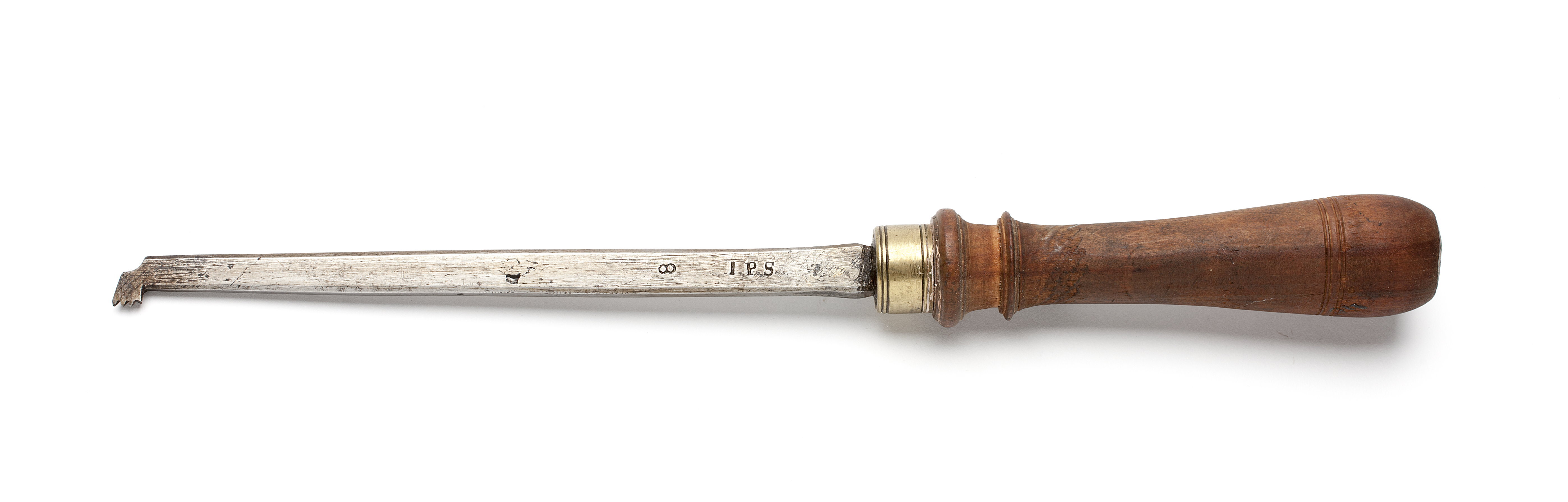 Klinga med rektangulär genomskärning, avfasade kanter. Vinkelställd, fyrtandad egg. Stämplat på stålet: "IPS" och "8". Svarvat skaft av päronträ, med två vulster nedtill ("rydboholmstyp"). Mässingsring.