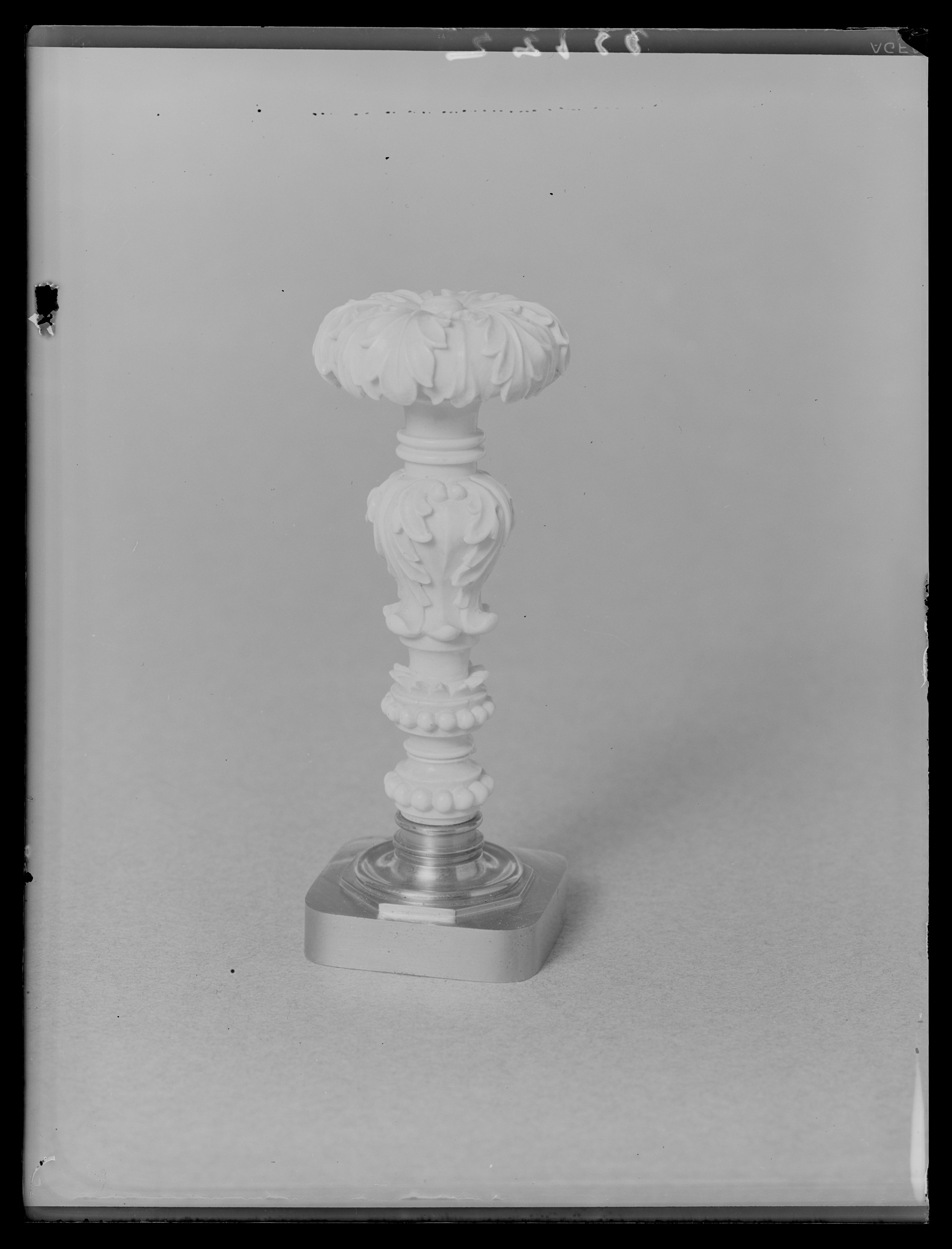 Rektangulär platta av stål med rundade hörn. Däri graverat det svensk-norska riksvapnet enligt 50%-regeln, skrafferade färgbeteckningar. Sköld kluven, högra fältet delat, tre kronor, folkungalejonet, vänstra fältet det norska lejonet, båda halvorna krönta av kungliga kronor. Hjärtsköld Bernadotte och Vasa. Sköldhållare två krönta bakåtseende lejon. Nedanför skölden hänger Karl XIII:s orden i band samt Vasa-, Nordstjärne-, Svärds- och Serafimerordens kedjor, valspråk: "RÄTT OCH SANNING". Enkel kantlinje. Kanterna på plattan nerslipade, utsparat en åttkantig platta, därpå svarvad holk. Snidat skaft av elfenben, kraftig profilering med akantusblad och pärlstavar. Upptill rund platta, d: 39 mm, i form av sexflikigt blad med nedåtböjda ändar, mitt på bladet en rund knapp.