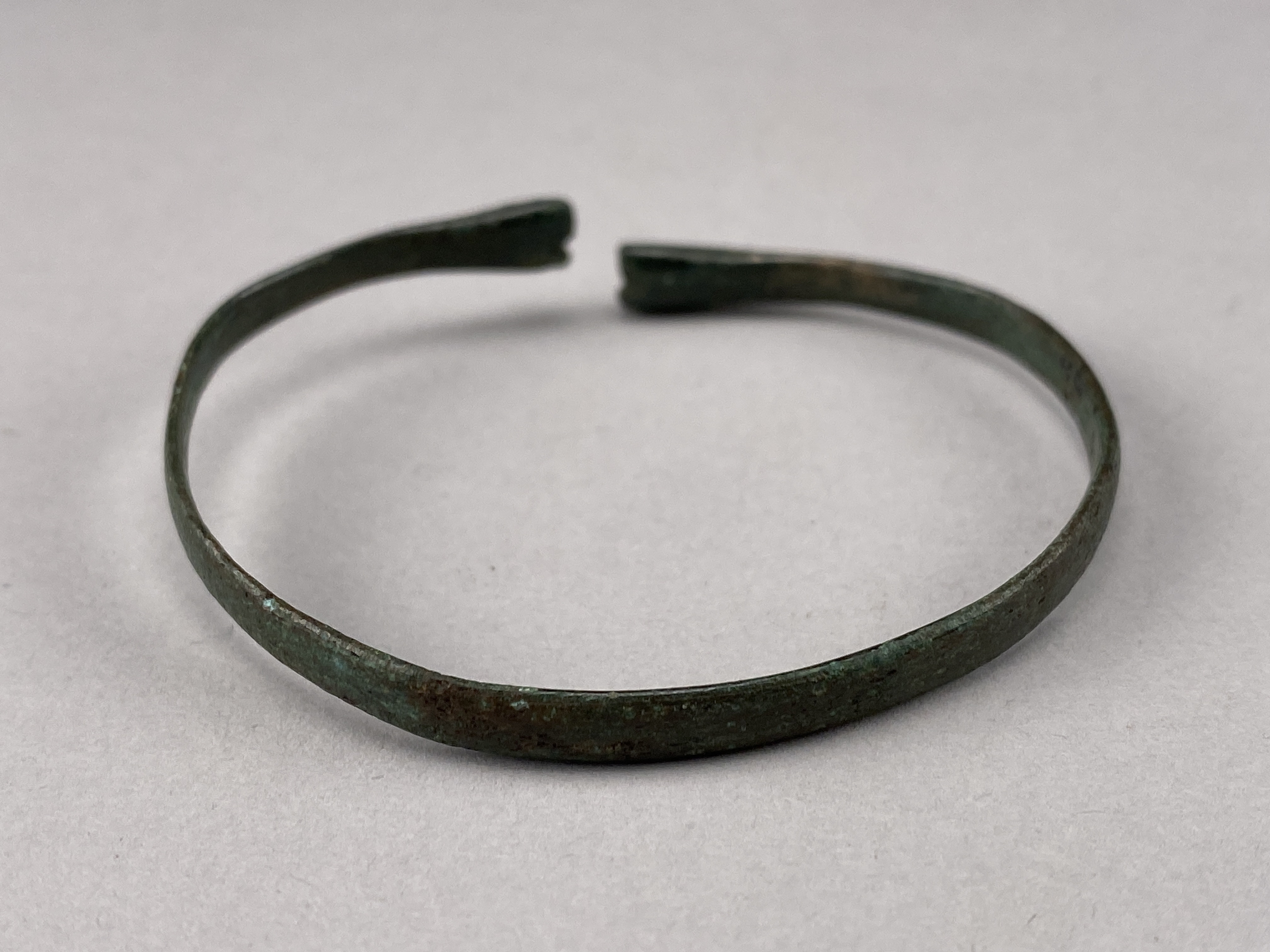 Armring av brons, litet och smalt. Svagt välvd översida. Ändarna är förtjockade och något kluvna.