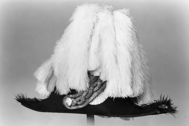 Hängande plym av vita strutsfjädrar, sammanfästade på ett s-formigt dubbelt tvinnat skaft av mässingstråd. Skarven mellan fjäder och skaft överklädd med tunt vitt skinn.
